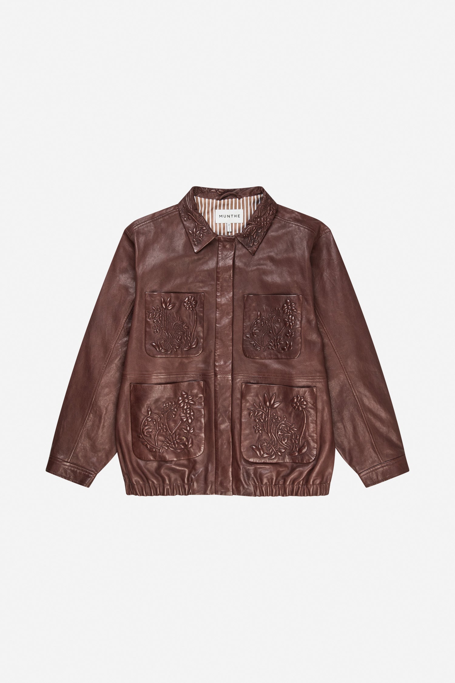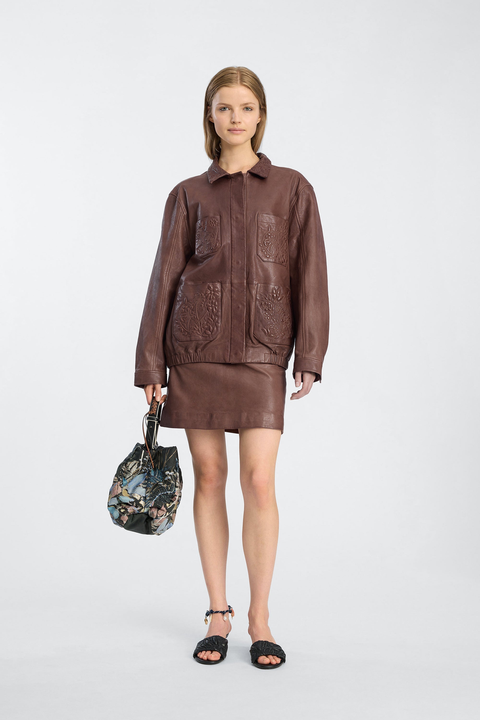 Jacke aus weichem Lammleder in lockerer, entspannter Passform. Die geprägten Taschen verfügen über eine elegante, botanische Textur. Mit verdecktem Reißverschluss und elastischen Abschlüssen, die die Silhouette sanft formen.