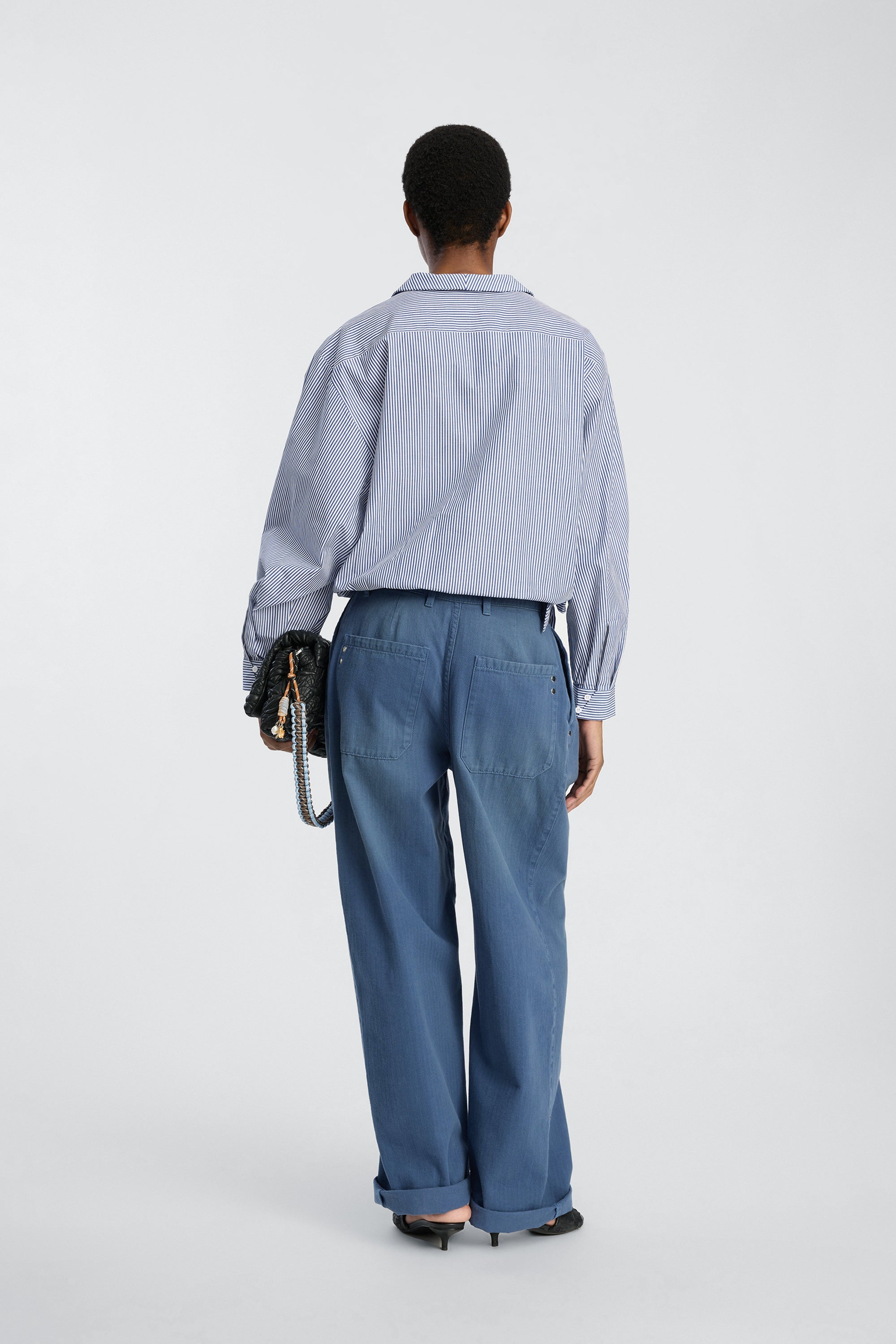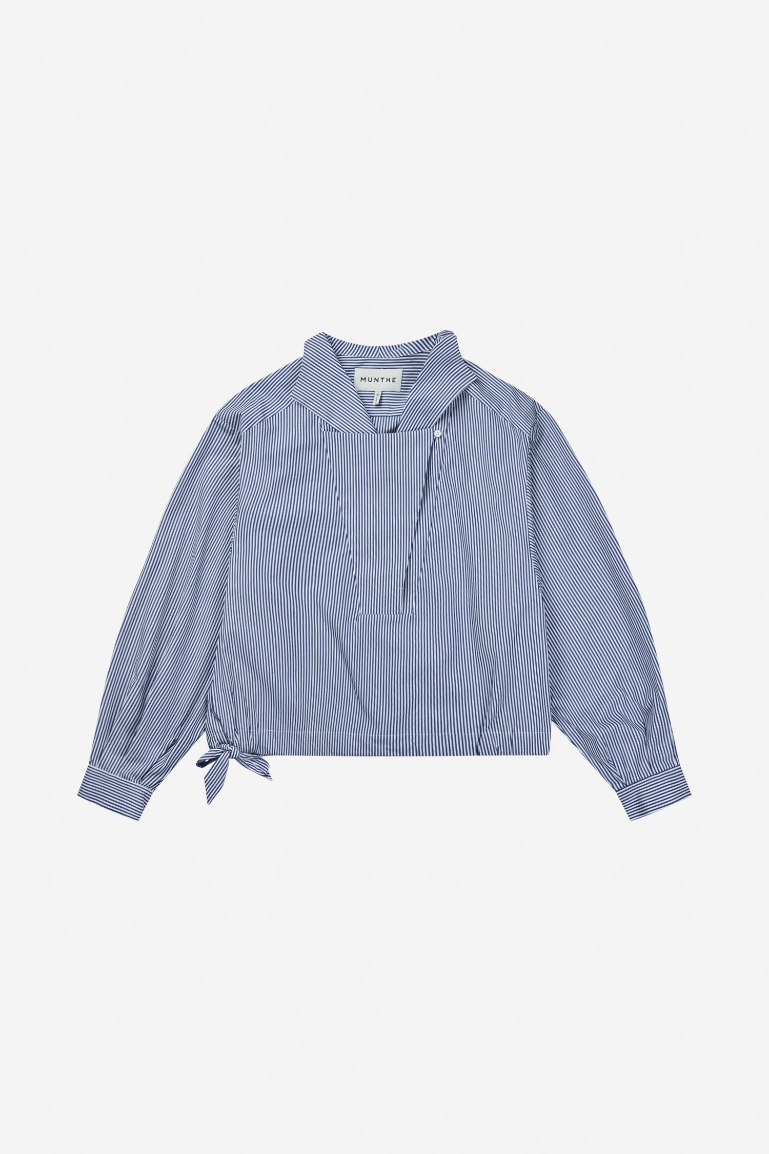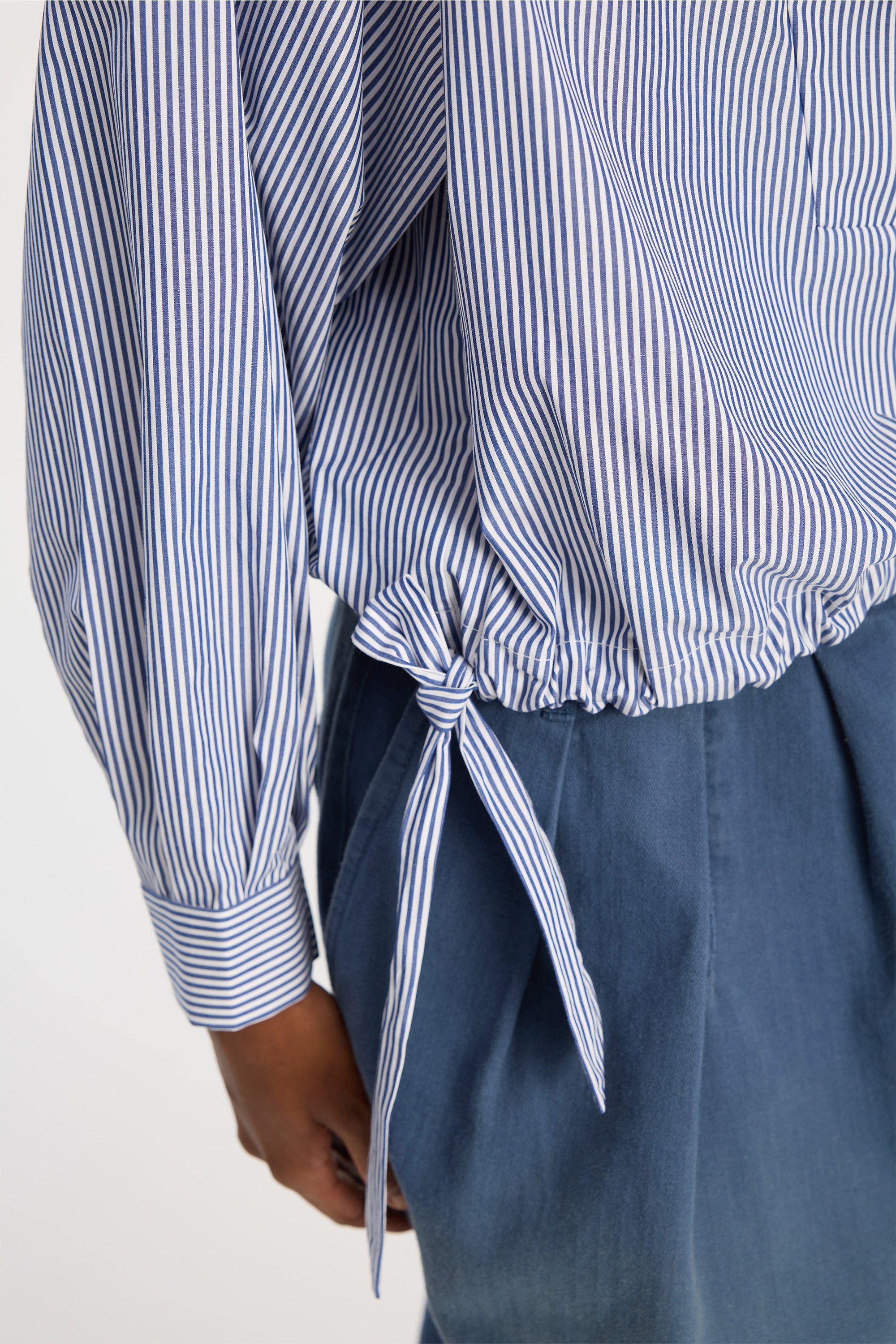 Bluse aus gestreiftem Stoff mit weitem, drapiertem Ausschnitt und Kragen. Mit langen Ärmeln und seitlichem Bindetail, das eine dezent lockere Silhouette erzeugt.