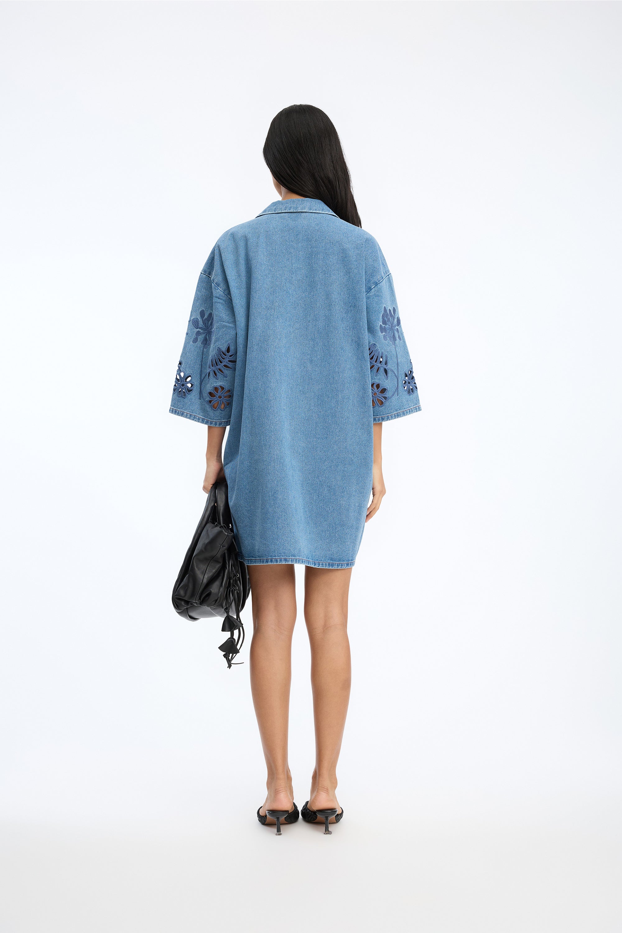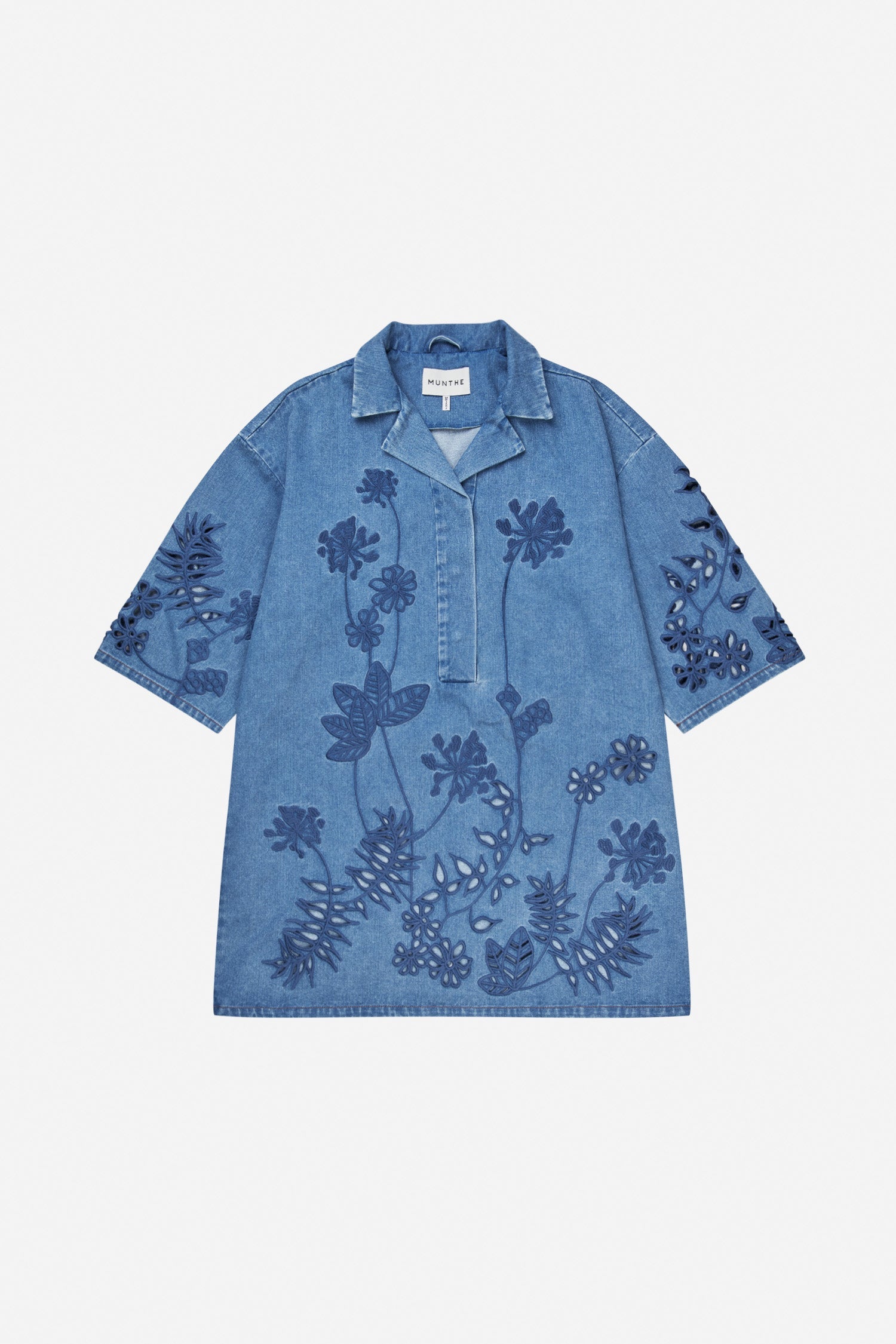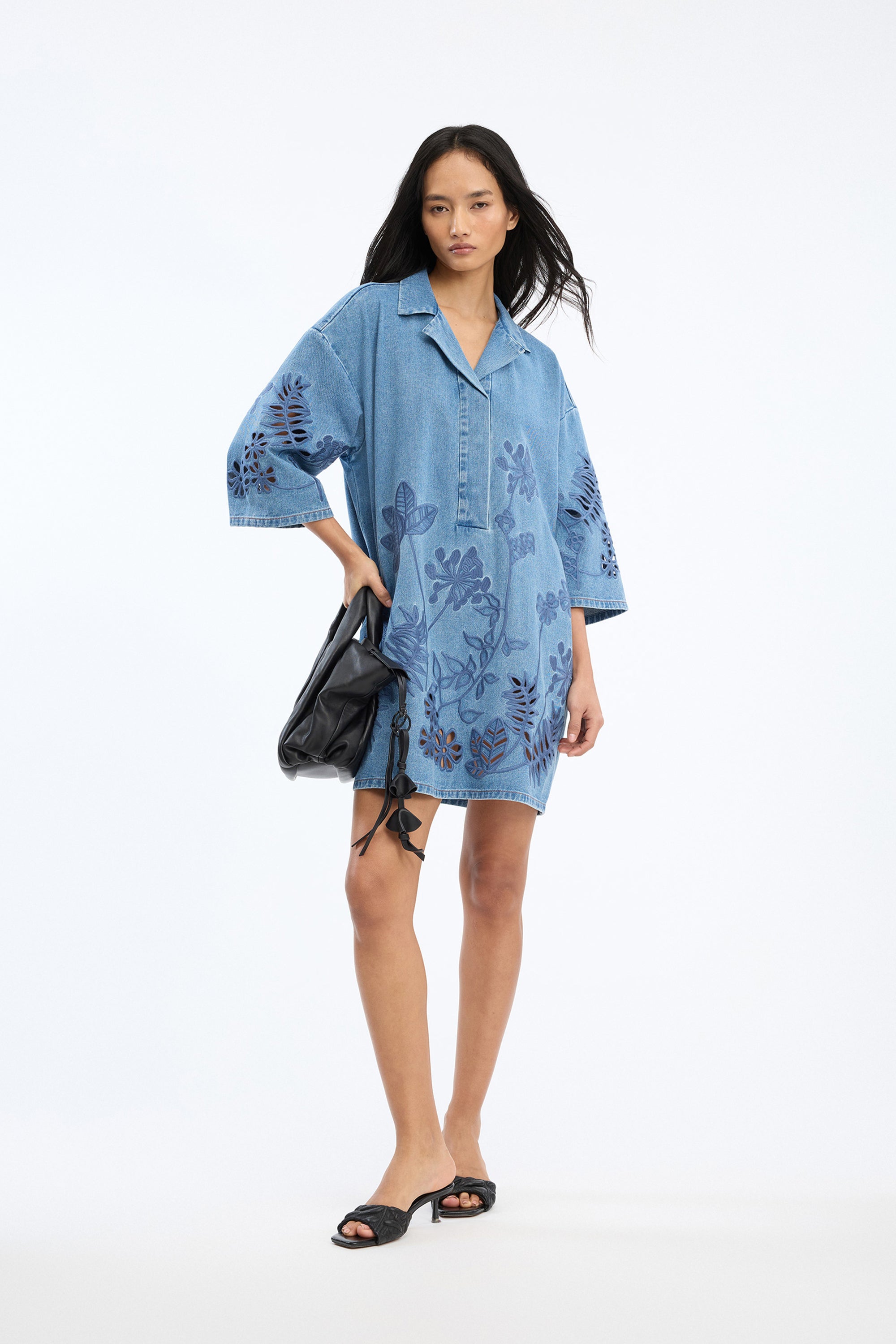Kleid aus Denim mit tonalen, gestickten Blumen-Details auf Körper und Ärmeln. Lockere, gerade Silhouette, mit V-Ausschnitt, kleinem Kragen und kurzen, weiten Ärmeln.