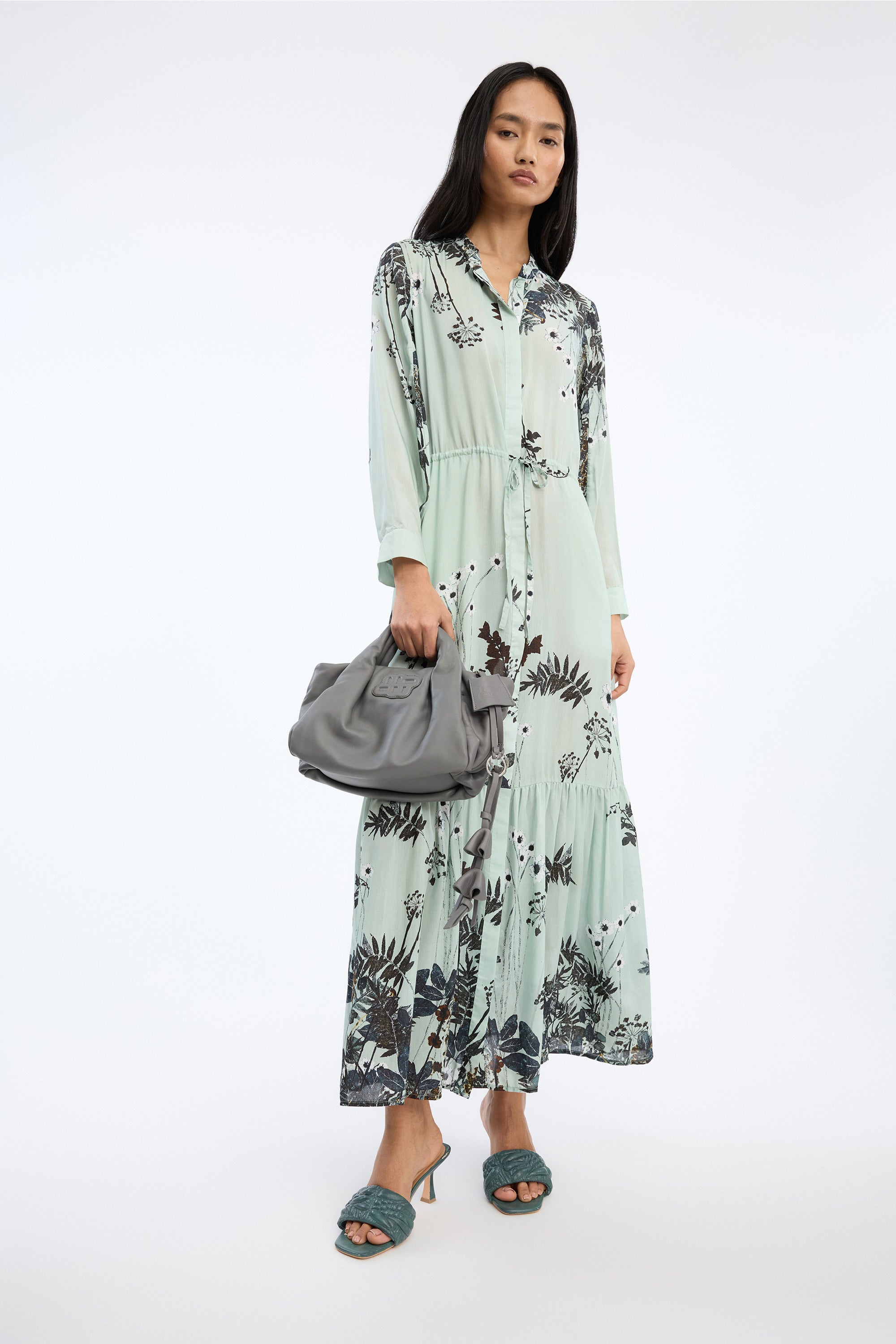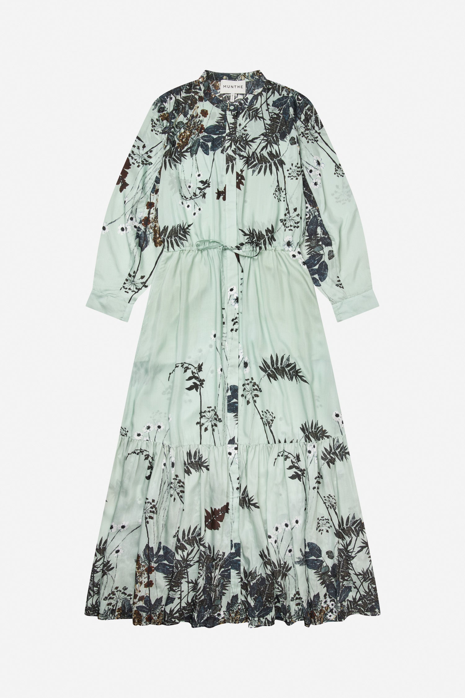 Kleid aus leichtem Stoff mit botanischem Print. Mit durchgehender Knopfleiste vorne, langen Ärmeln mit Manschetten und Kordelzug zum Verstellen der Taille.