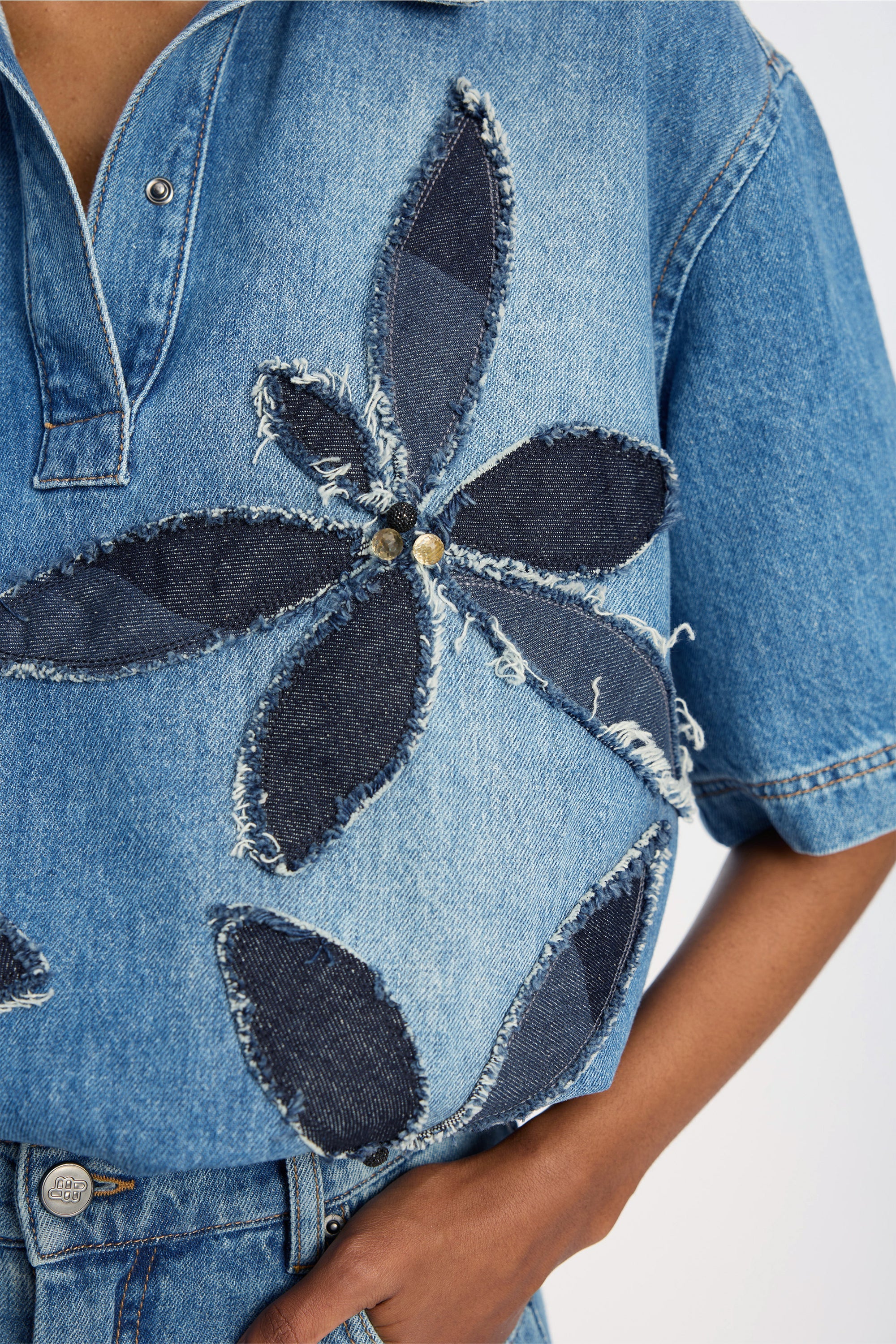 Top aus Denim mit floralen Applikationen aus dunklerem Denim. Mit kurzen Ärmeln, Kragen und lockerer Passform.