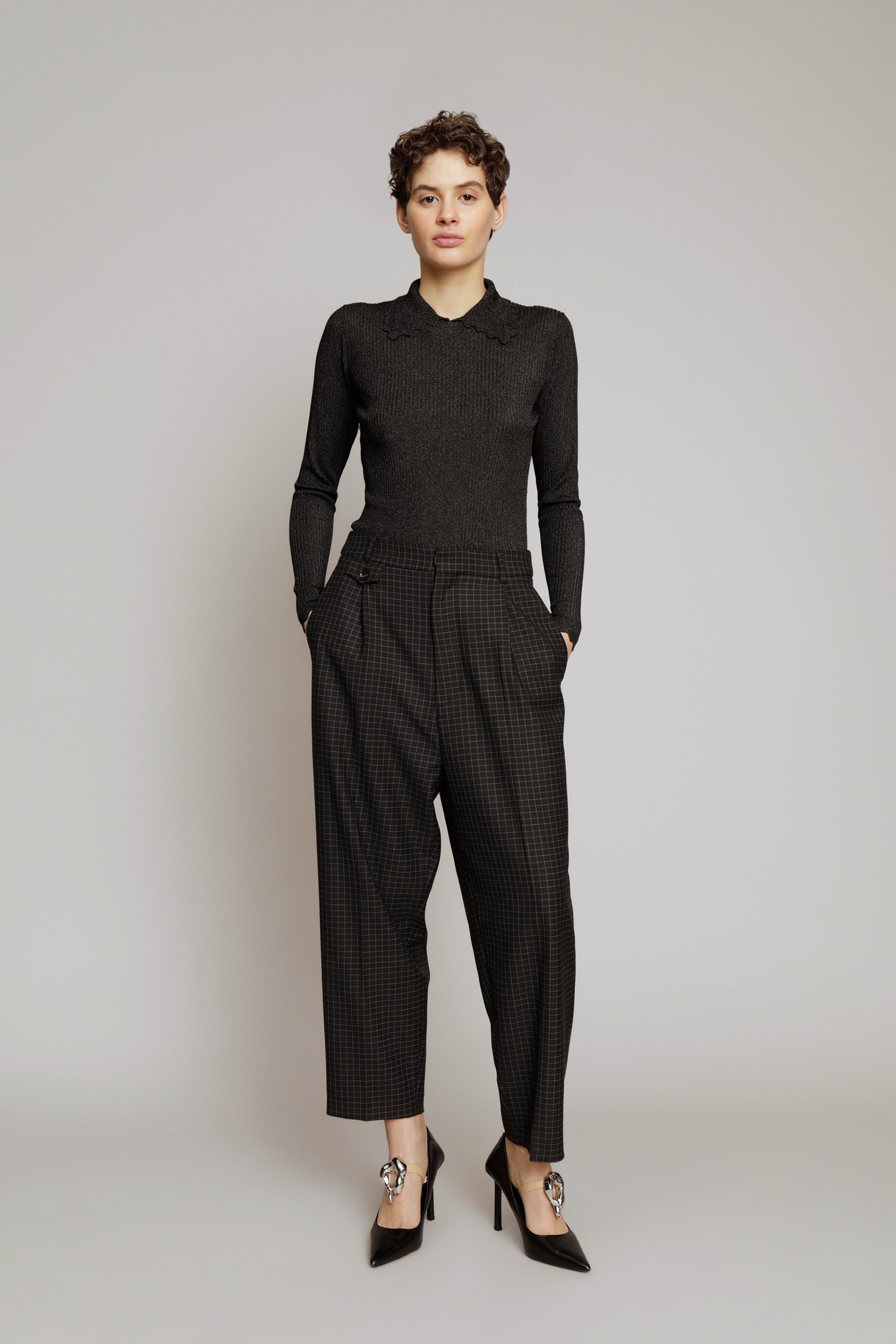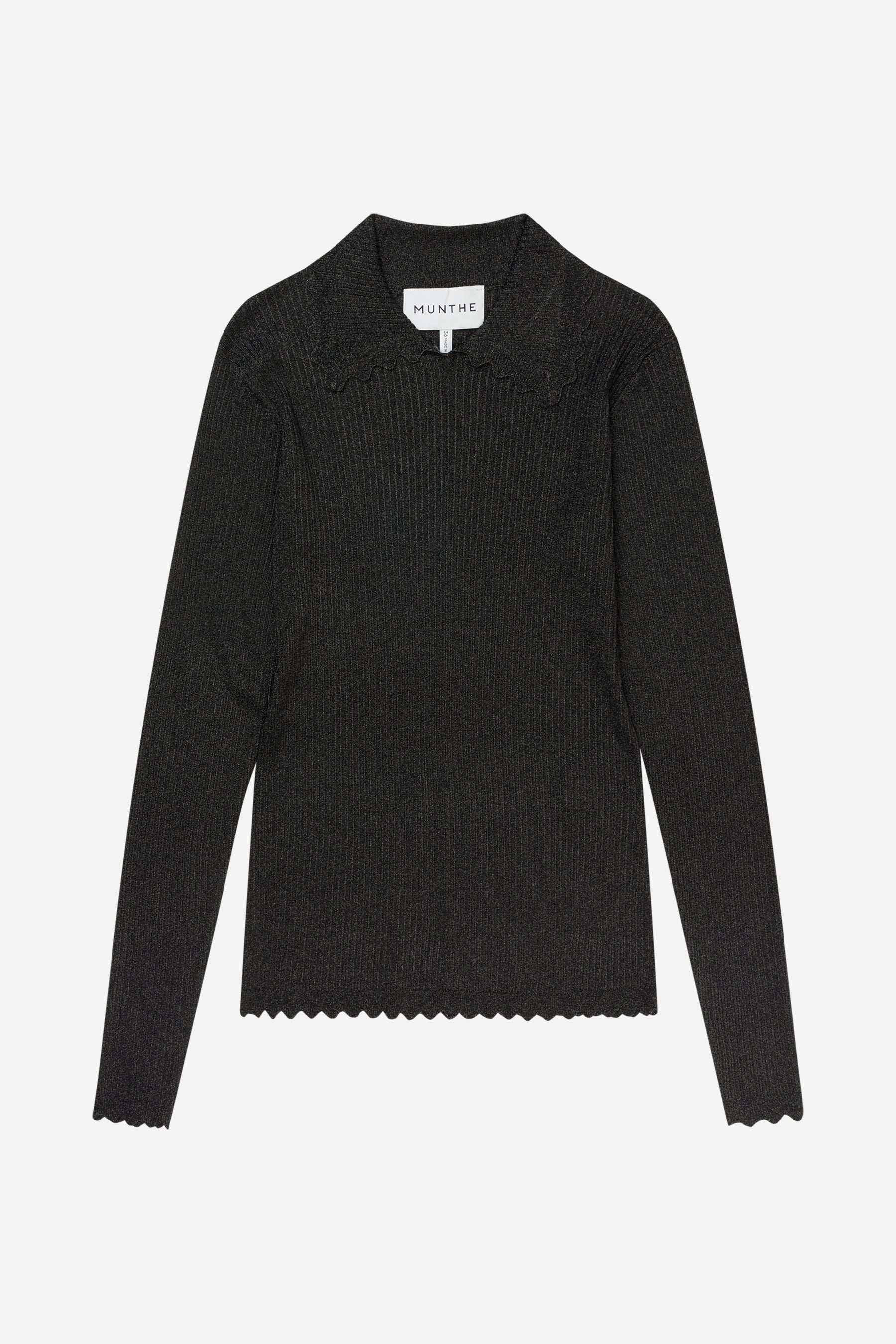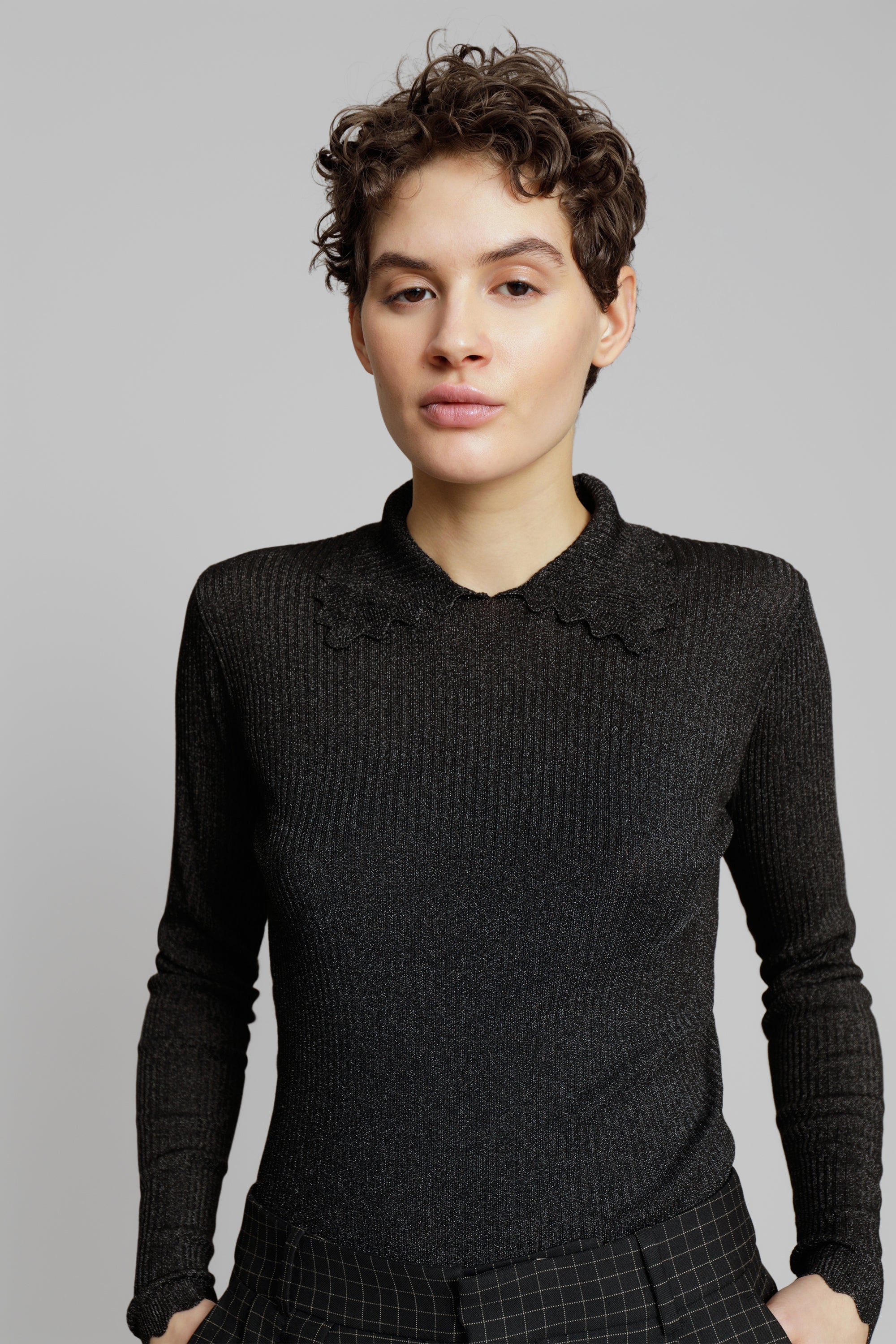 Feminin geschnittene Rippenbluse mit schönem Kragen. Die Bluse ist aus einer Viskosemischung gefertigt. Erhältlich in den Farben Schwarz, Silber oder Bronze.