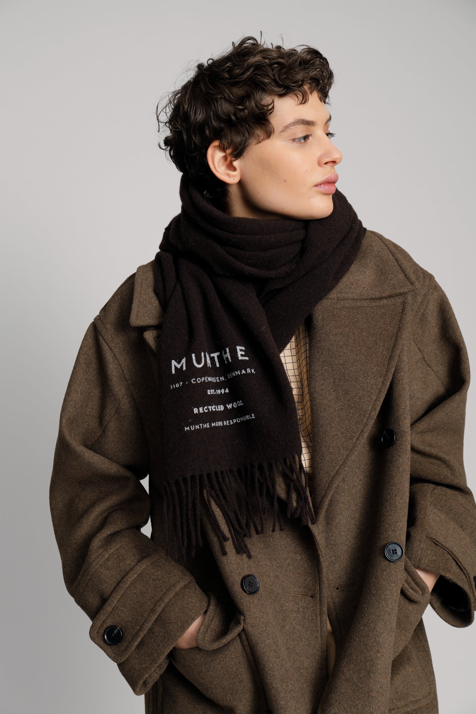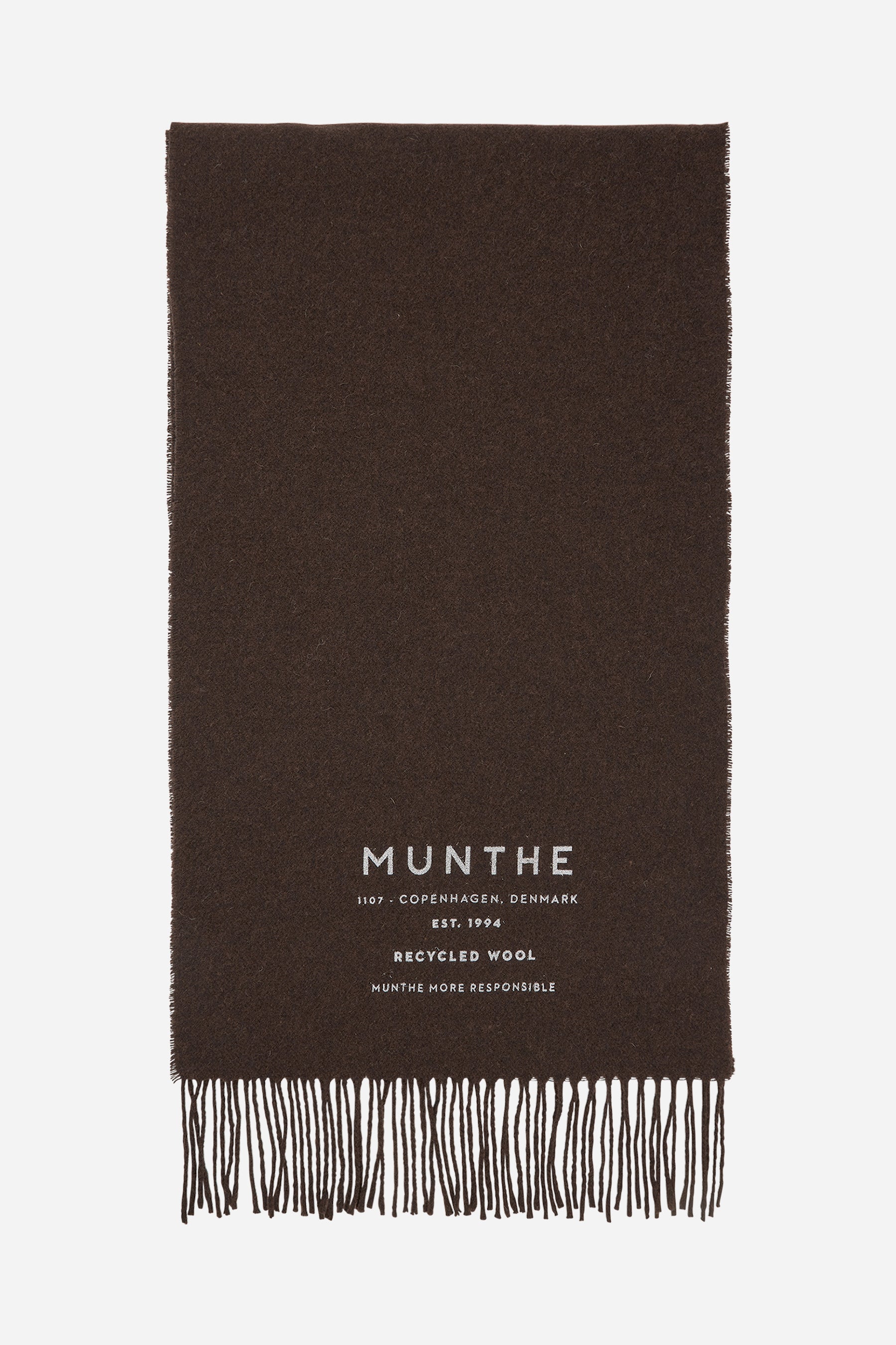 Ein weicher Schal aus einer recycelten Wollmischung. Der Schal hat ein MUNTHE-Logo und -Text sowie ein klassisches Fransendetail an jedem Ende des Schals. Erhältlich in den Farben Braun oder Beige.
