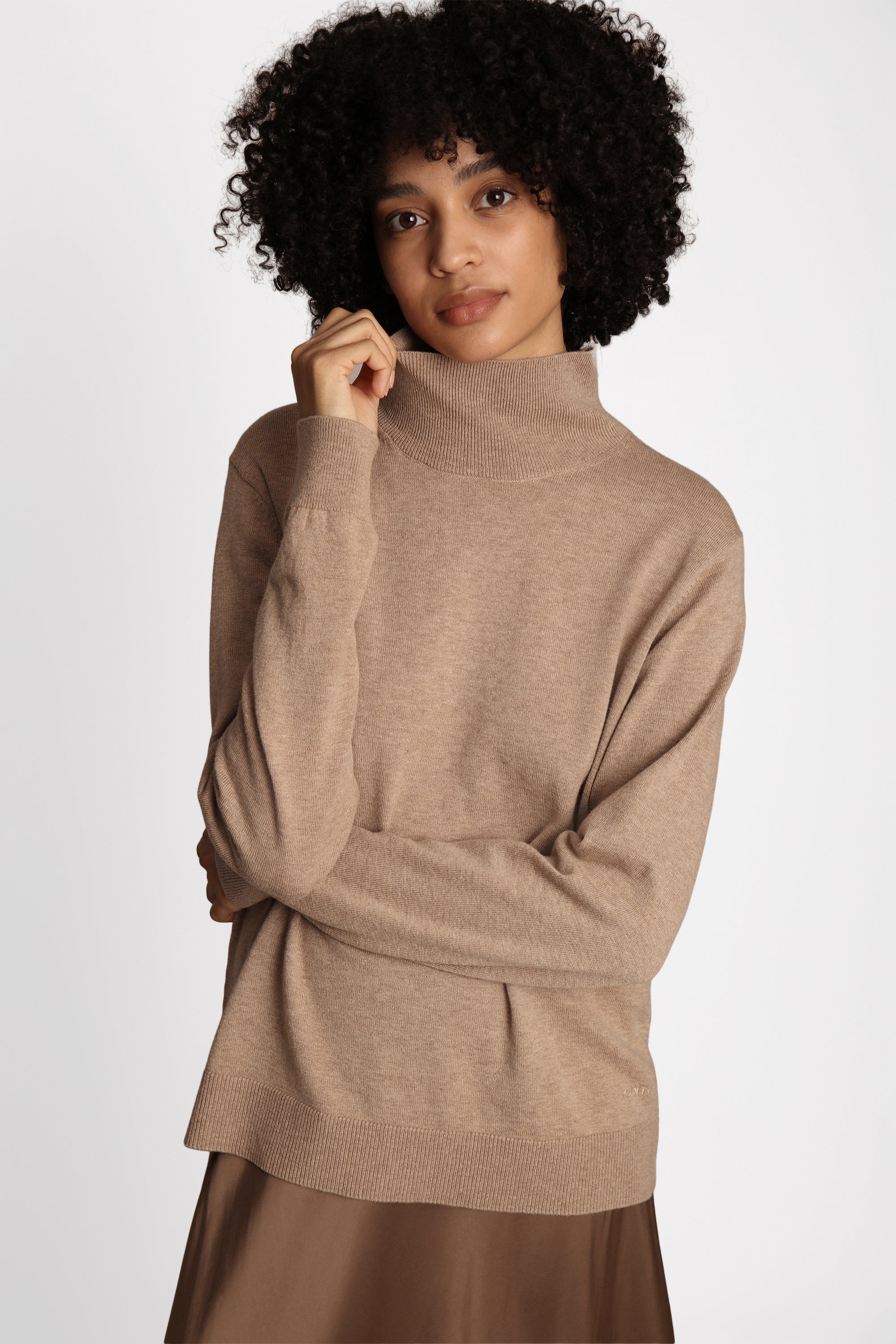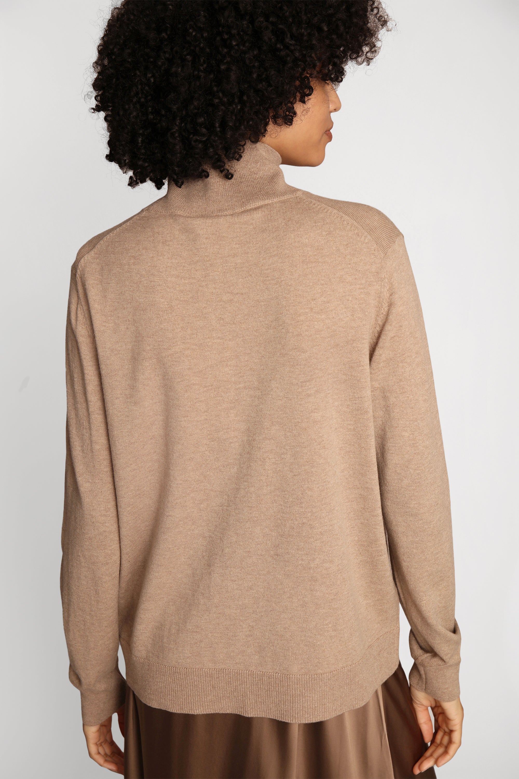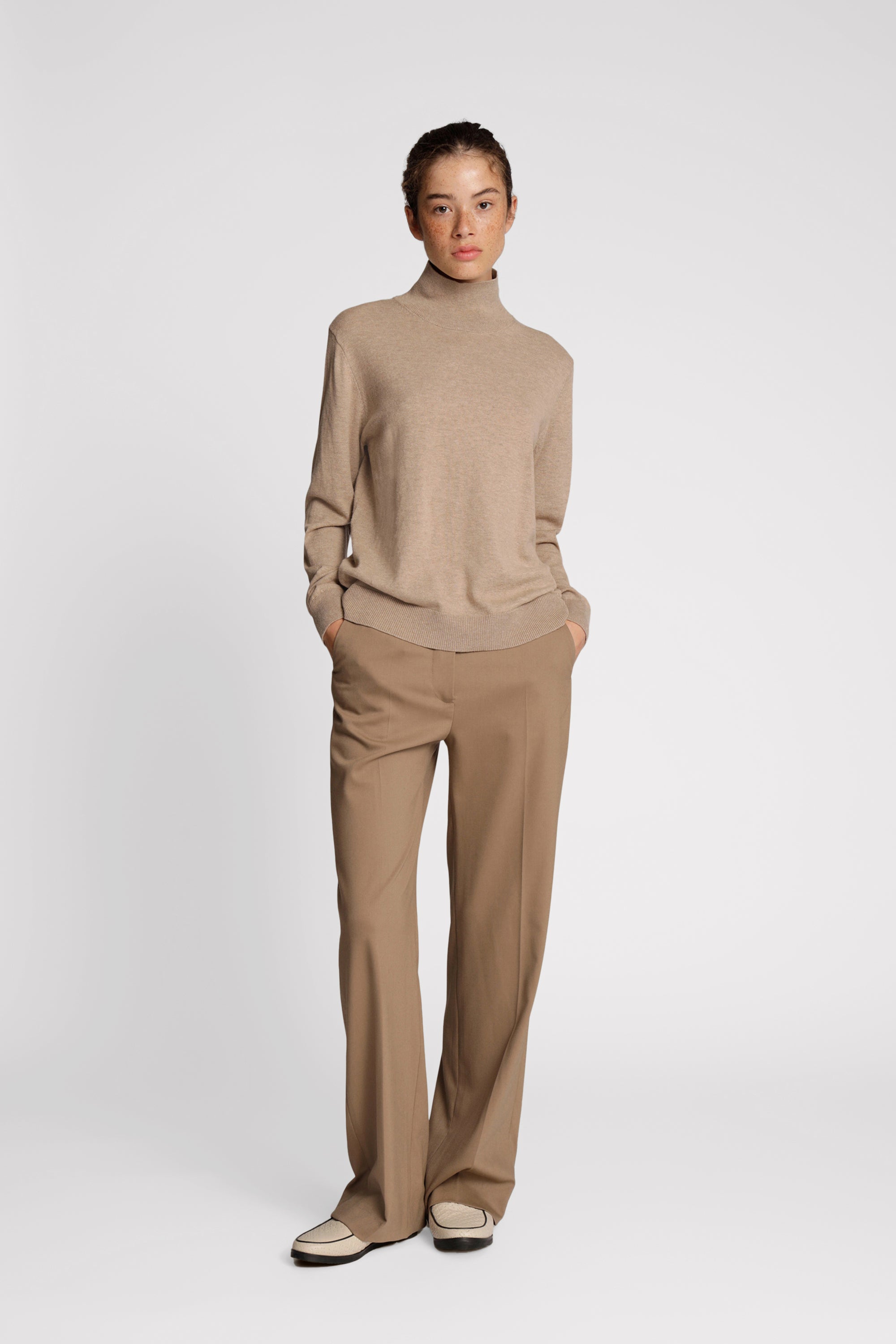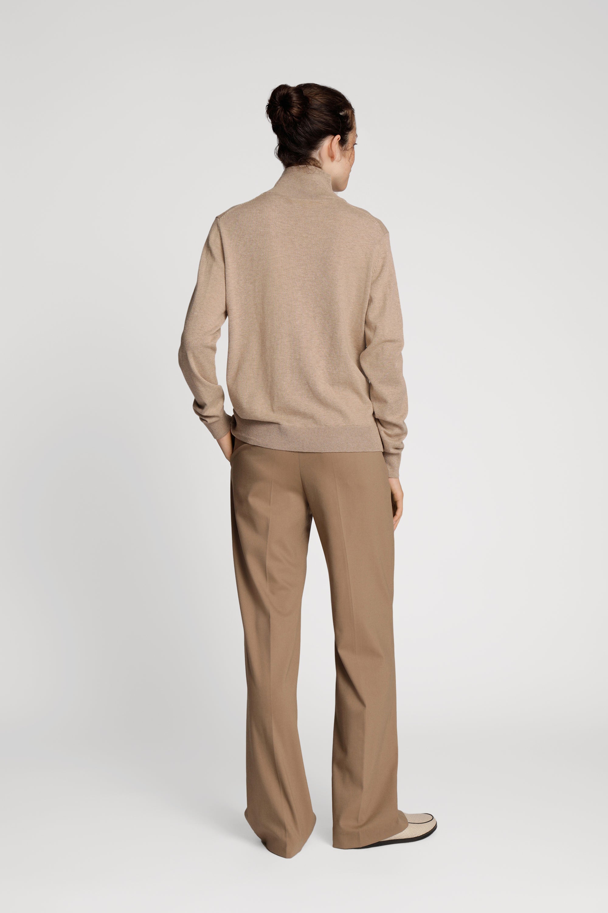 Klassisches, leichtes Strickstück aus einer weichen Merinowollmischung. Dieses Strickstück hat lange Ärmel, einen T-Ausschnitt und eine elegante Rippenstruktur an den Rändern.