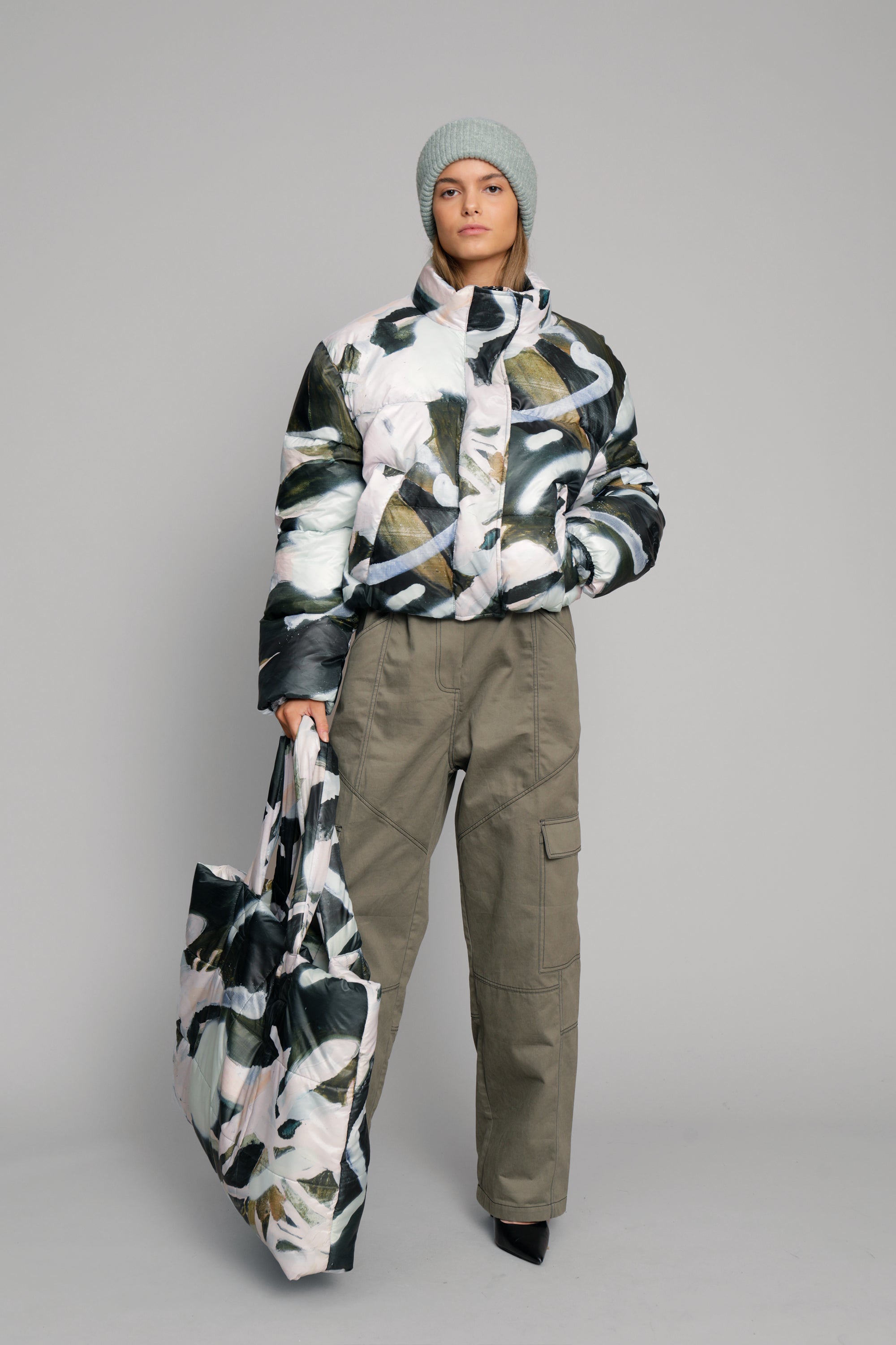 Eine kurze Pufferjacke mit einem schönen Allover-Druck. Die Jacke ist aus 100% recyceltem Polyester hergestellt.Der Mantel hat eine normale Passform, mit Taschen, einem Reißverschluss und Druckknöpfen am Hals. Erhältlich in der Farbe Army.