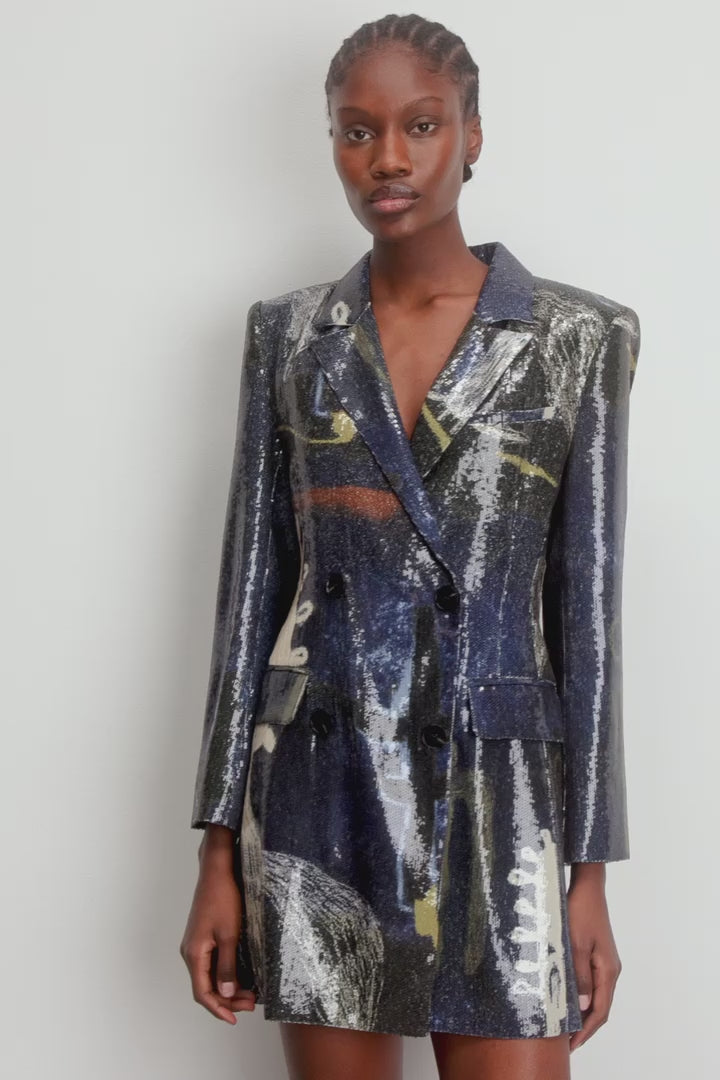 Langer, eleganter Blazer mit einem schönen Allover-Paillettenprint. Der Blazer ist schmal geschnitten und verfügt über gerade Schultern, lange Ärmel und eine zweireihige Knopfleiste.