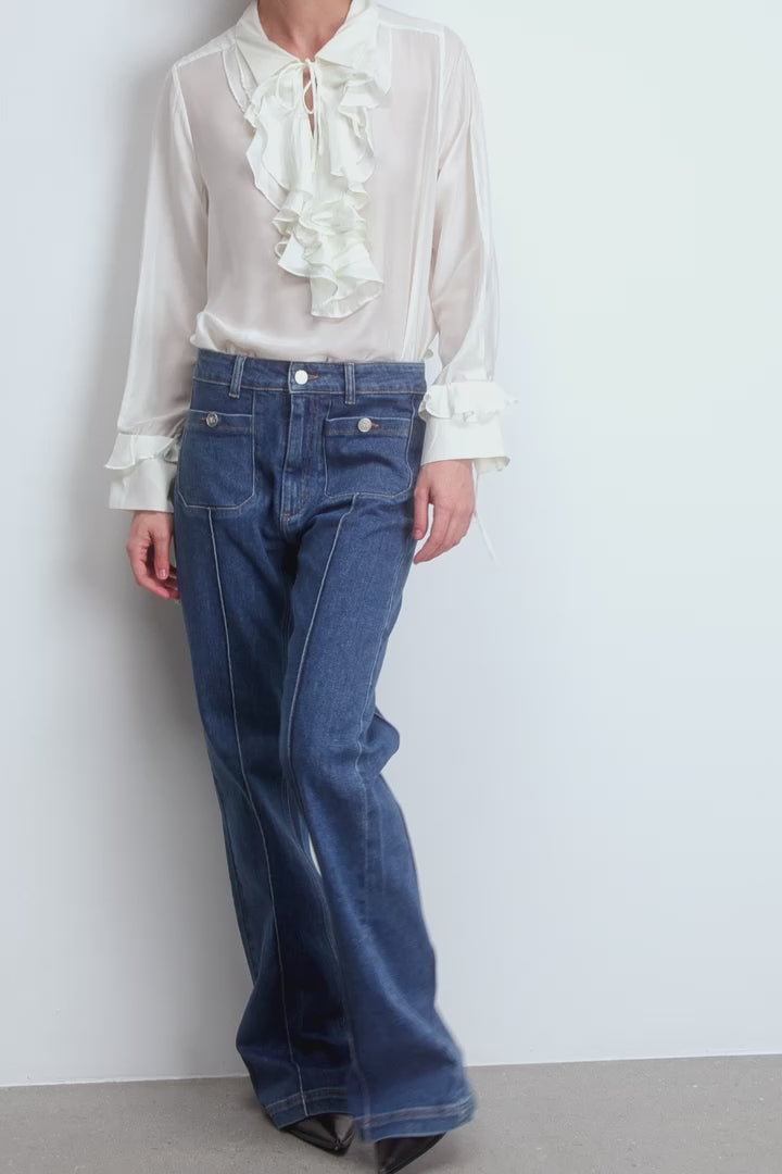 Jeans mit Bügelfalten, zwei feinen vorderen Taschen, die mit einem Knopf verschließbar sind, sowie zwei Gesäßtaschen. Diese Jeans haben einen eleganten MUNTHE-Lederpatch auf der Rückseite und werden mit einem Reißverschluss und einem Knopf geschlossen.