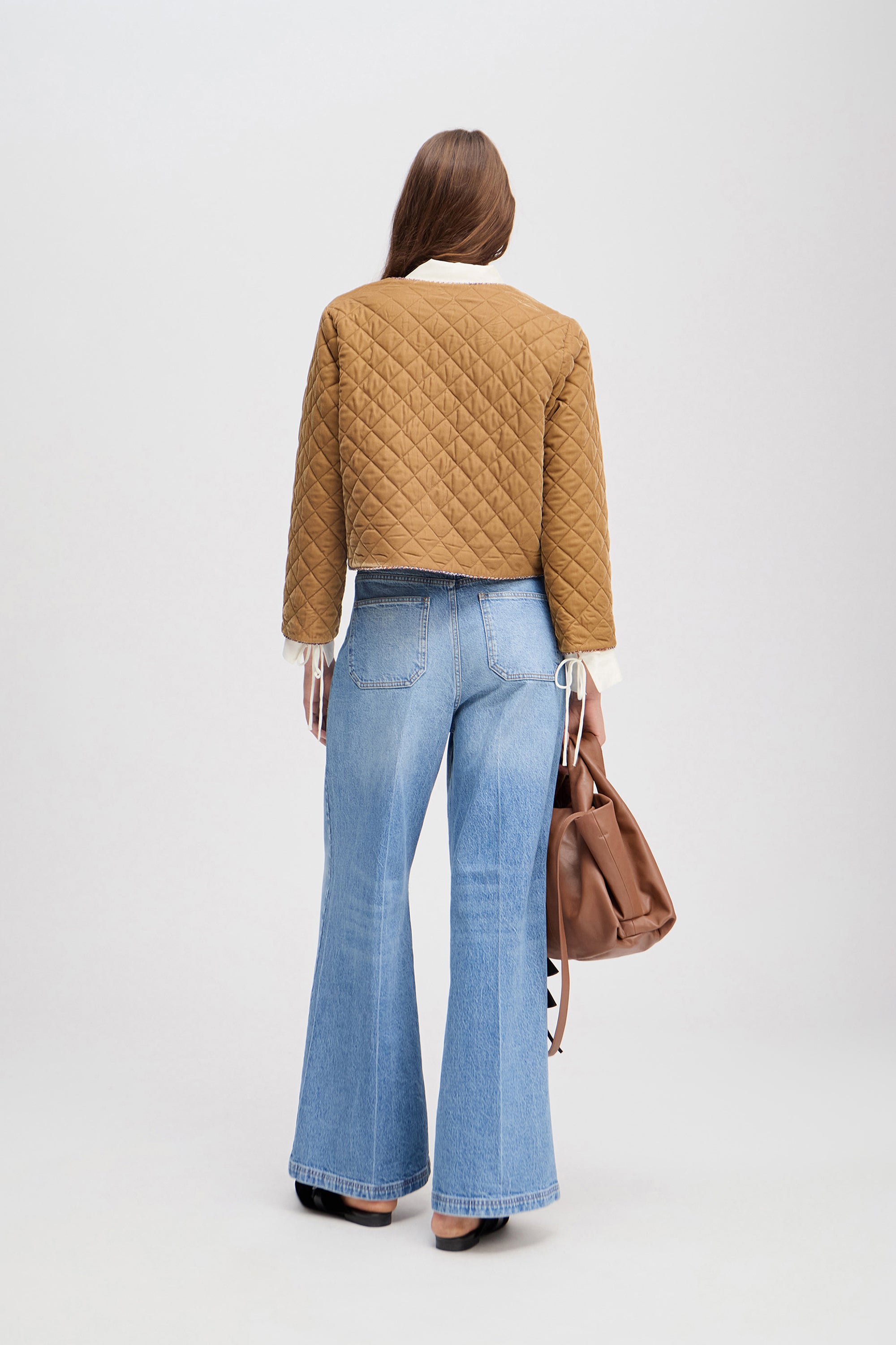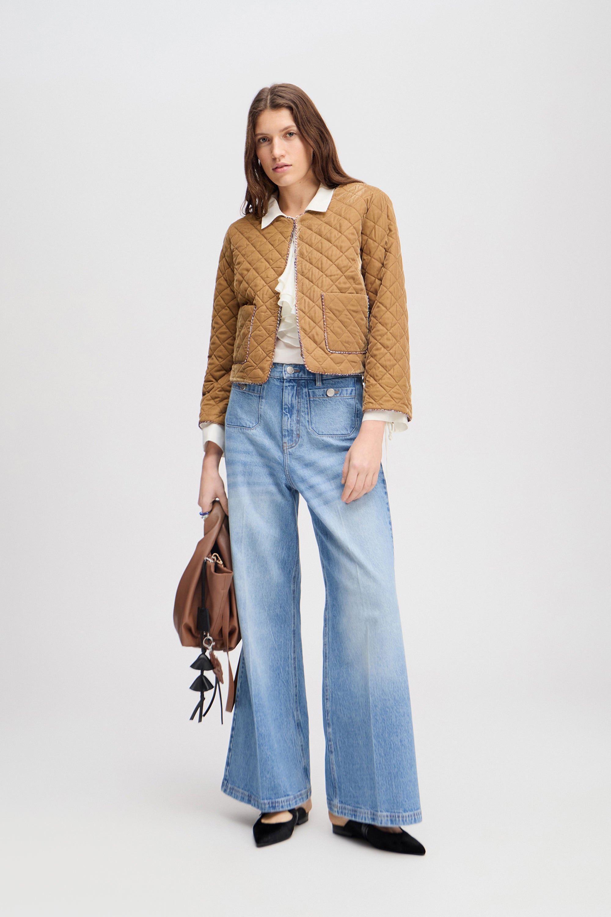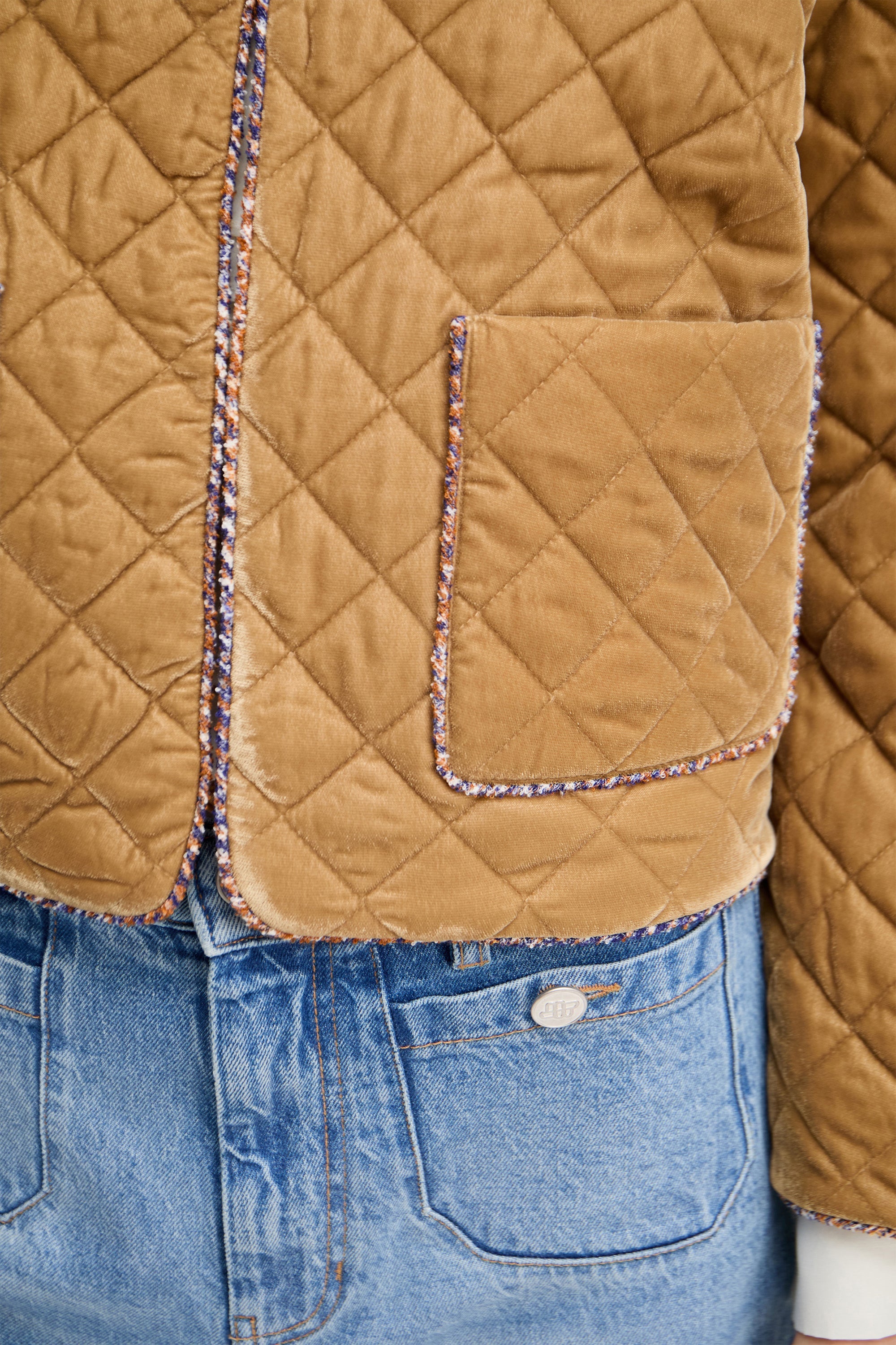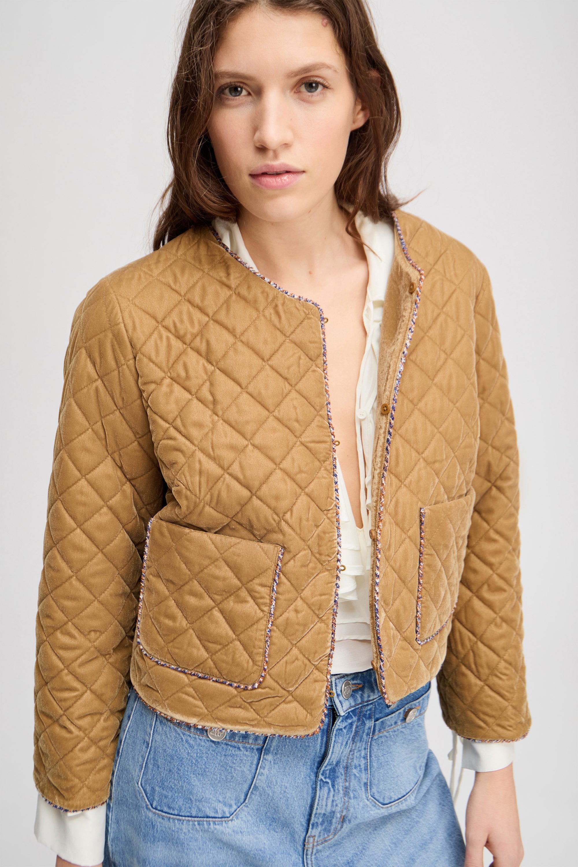 Kurze, schöne gesteppte Samtjacke mit elegantem Fransenbesatz. Die Jacke verfügt über eine Knopfverschluss und stylische Vordertaschen.