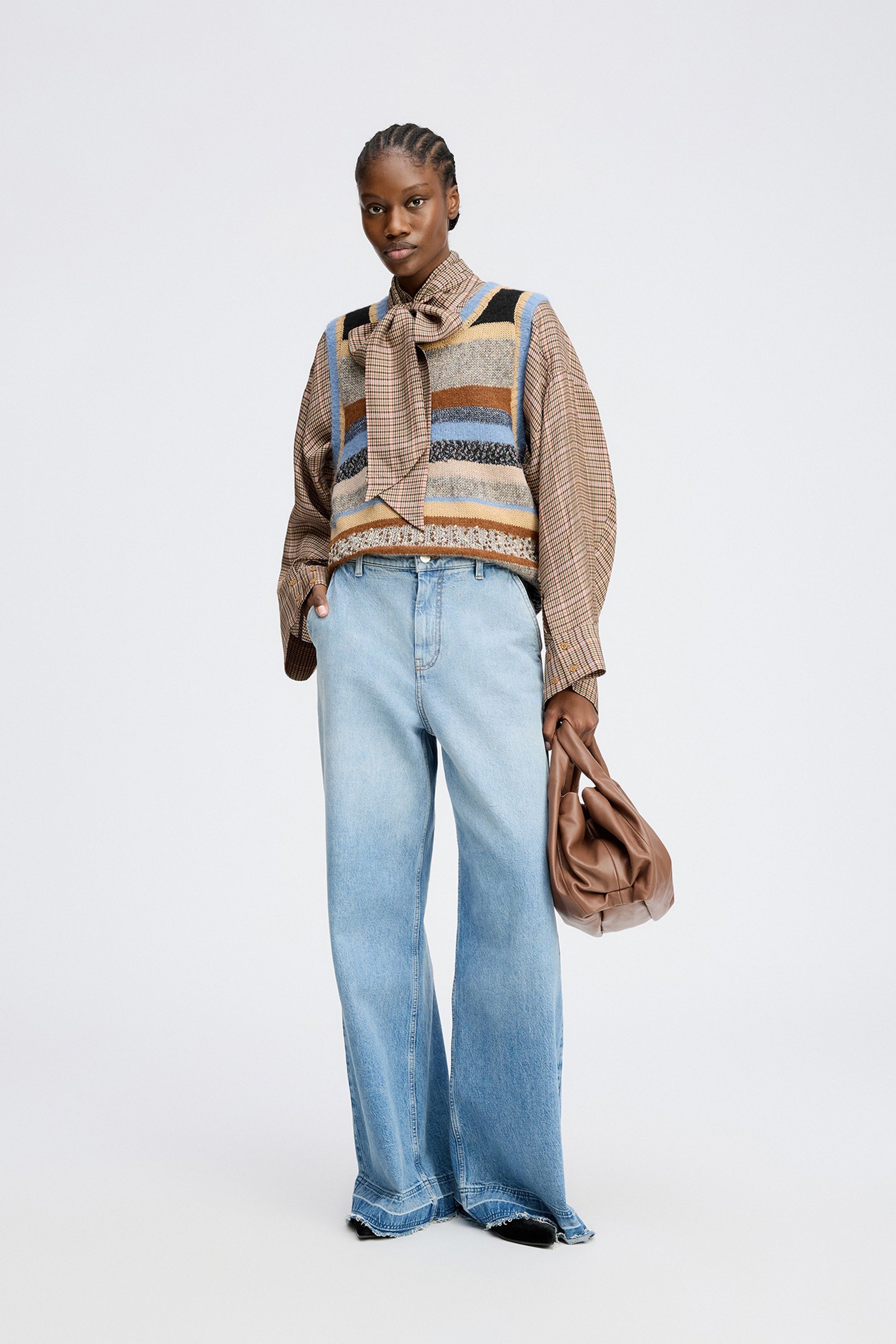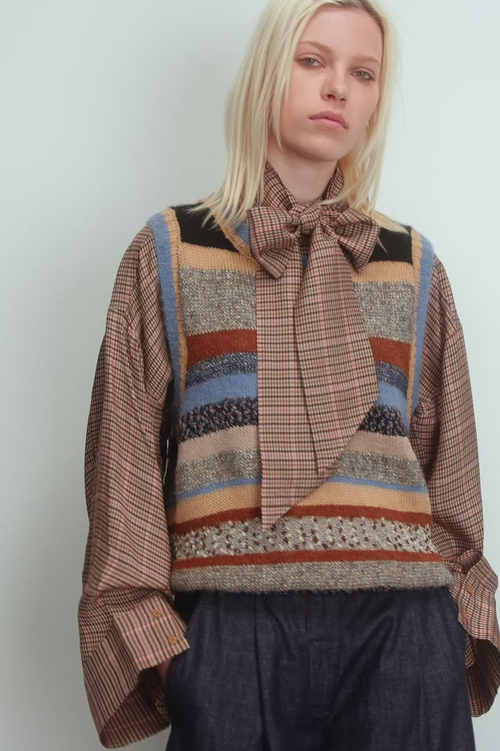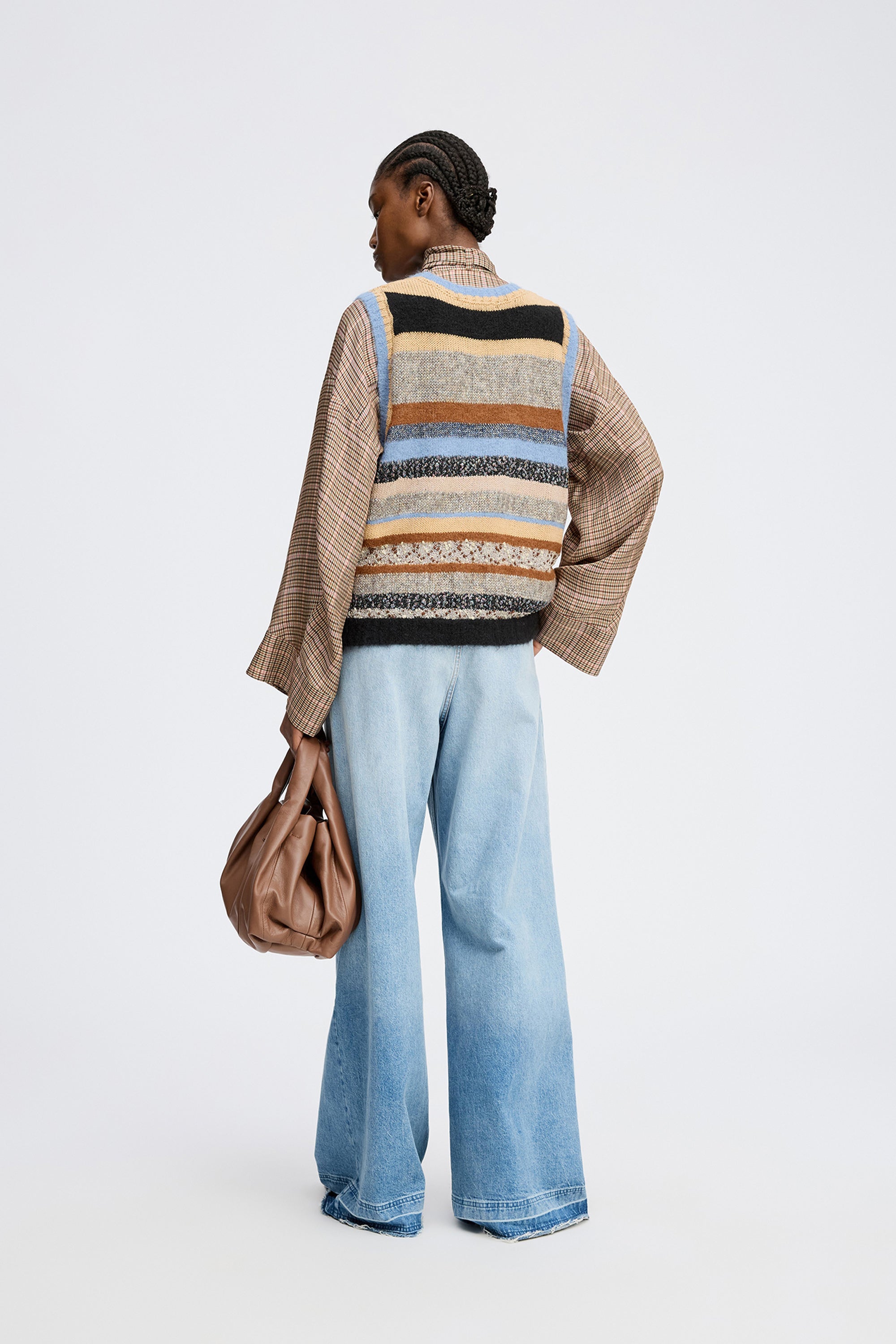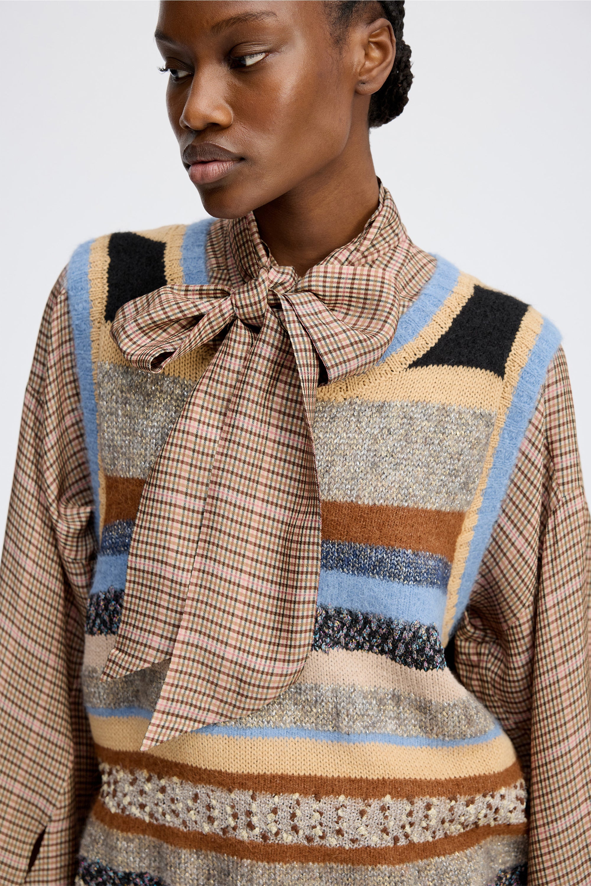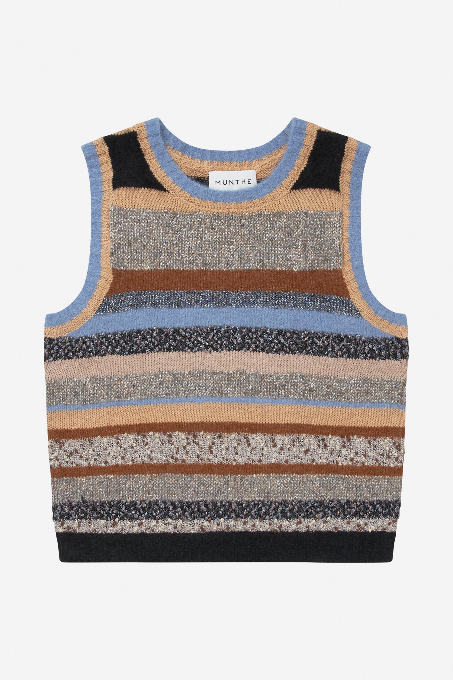 Gestrickte Weste mit eleganten Streifen, harmonisch kombiniert aus verschiedenen Strickarten. Die Weste ist mit feinen Rippen-Details und einem runden Halsausschnitt gestaltet.