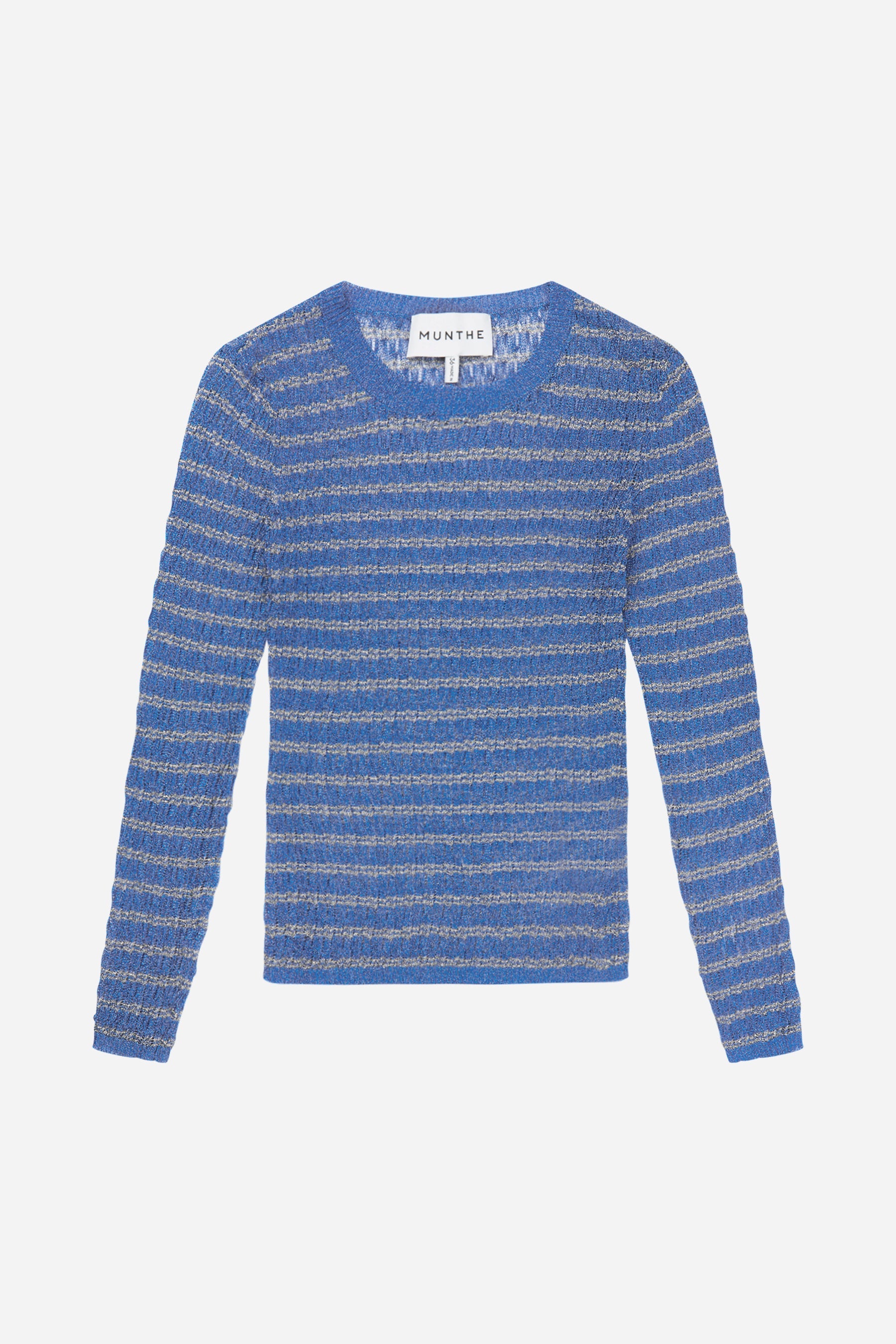Elegante Strickbluse, gestaltet mit Streifen in einem schönen Metallic-Glitzer-Look. Die Bluse hat lange Ärmel und eine enge Passform. Erhältlich in der Farbe blau.