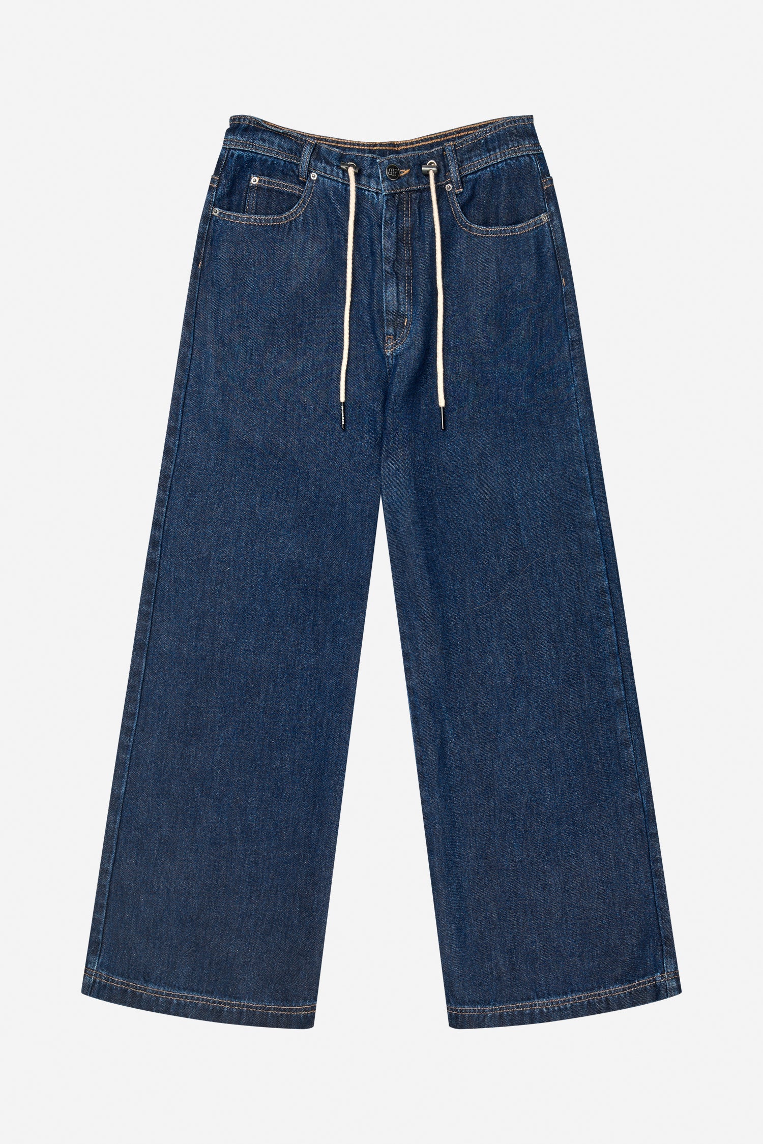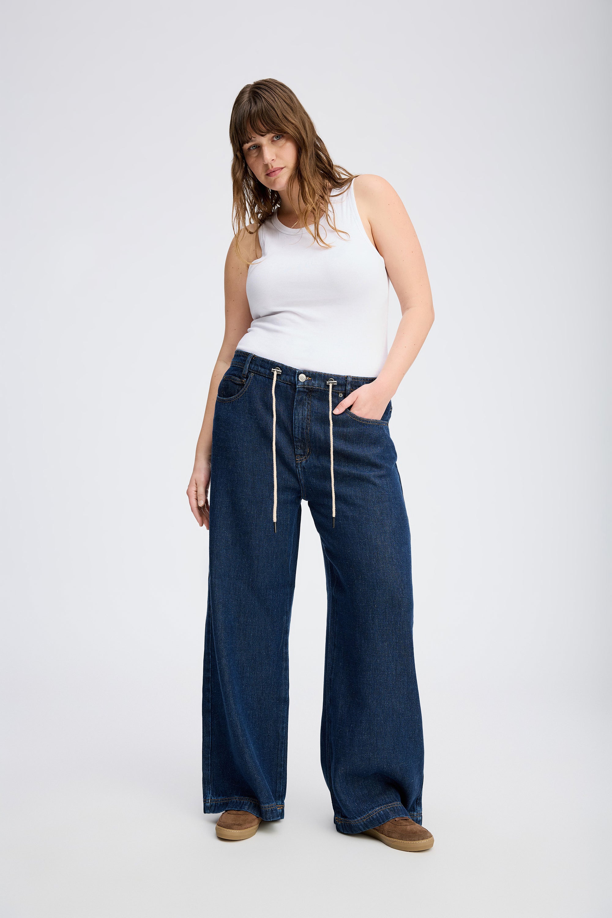 Dunkelblaue Jeans mit elegantem Bindeband in der Taille. Diese Hose hat eine lockere Passform, weite Beine und Taschen vorne und hinten.