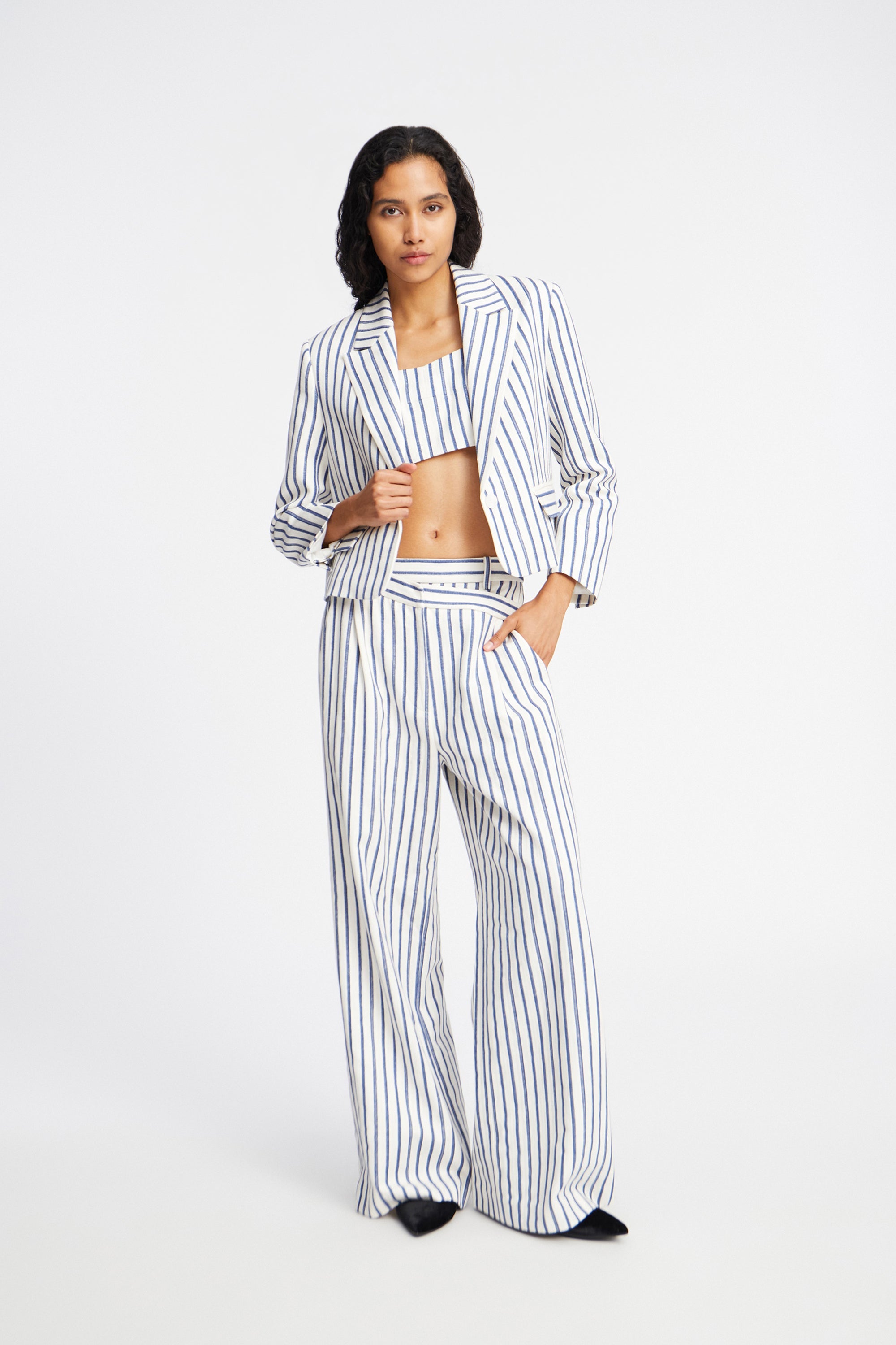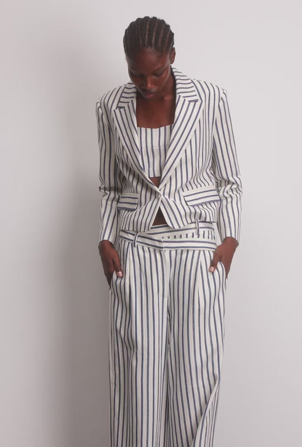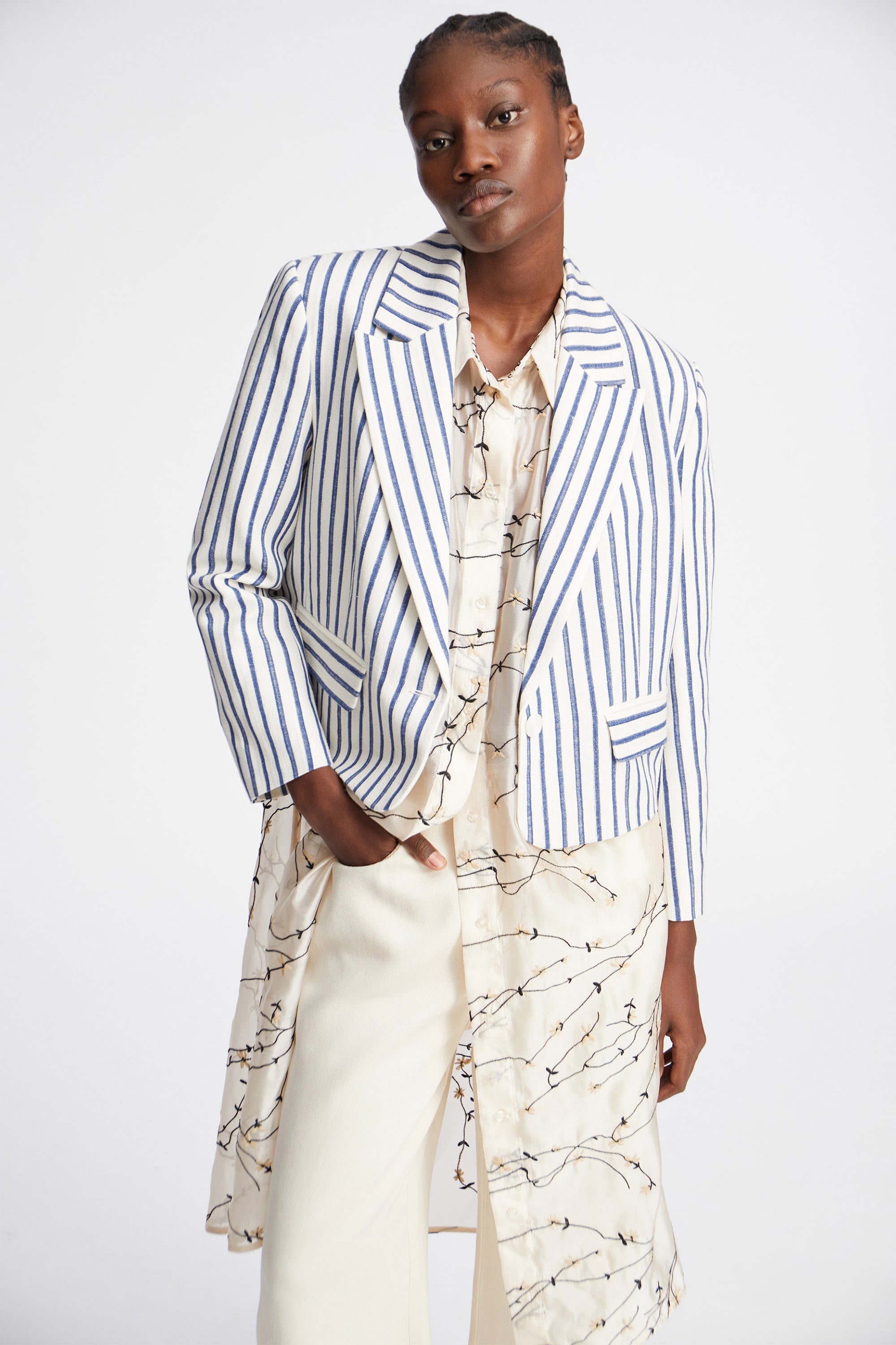 Kurzer, eleganter Blazer mit schönen blauen Streifen. Der Blazer hat gerade Schultern, lange Ärmel, Klappentaschen und wird vorne mit einem einzigen Knopf geschlossen.