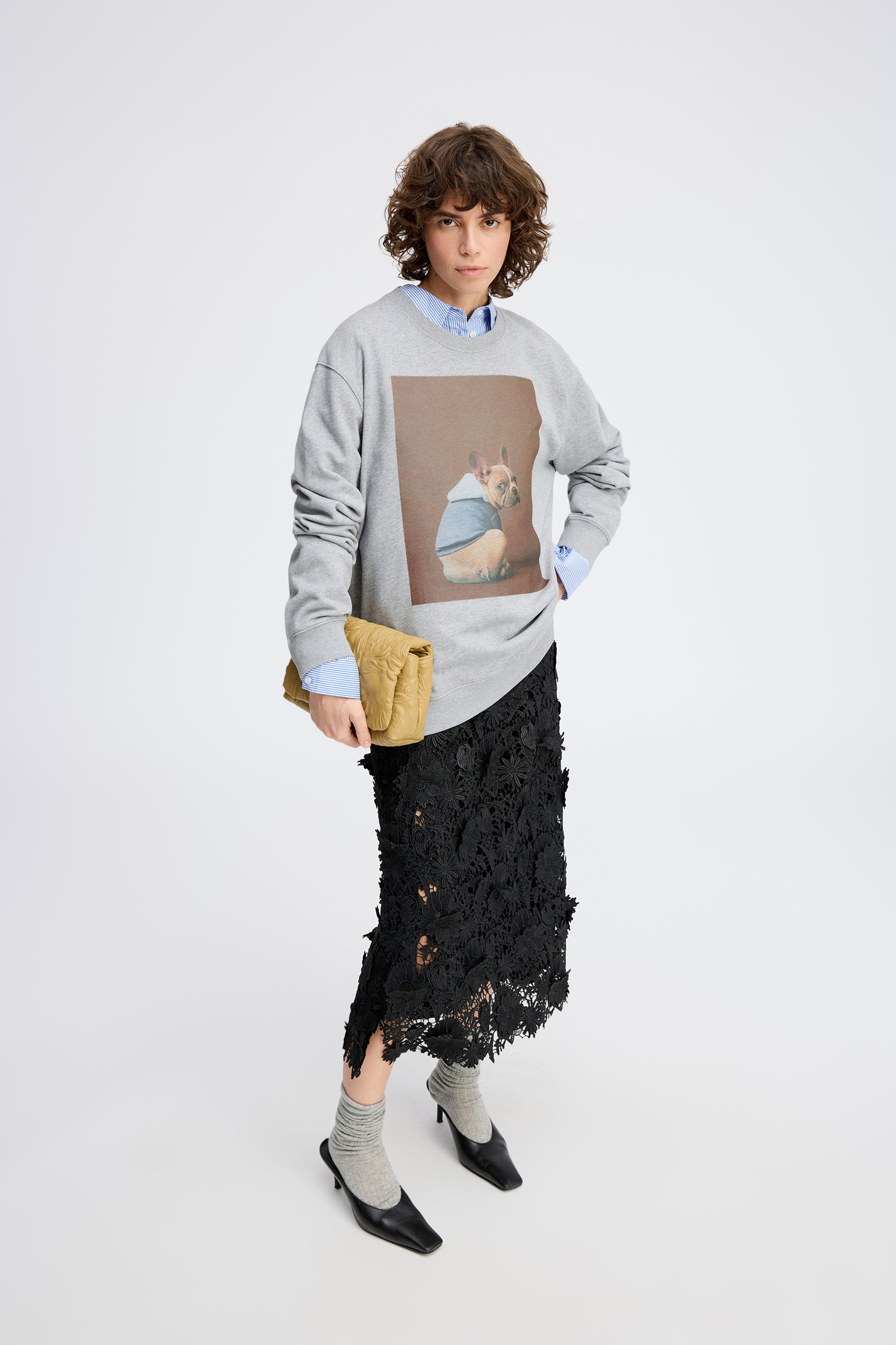 Eleganter schwarzer Rock mit schönen Blumenapplikationen. Mit schwarzem Futter und teilweise transparenten Details am Saum und an der Seite gestaltet, wird er mit einem seitlichen Reißverschluss geschlossen.