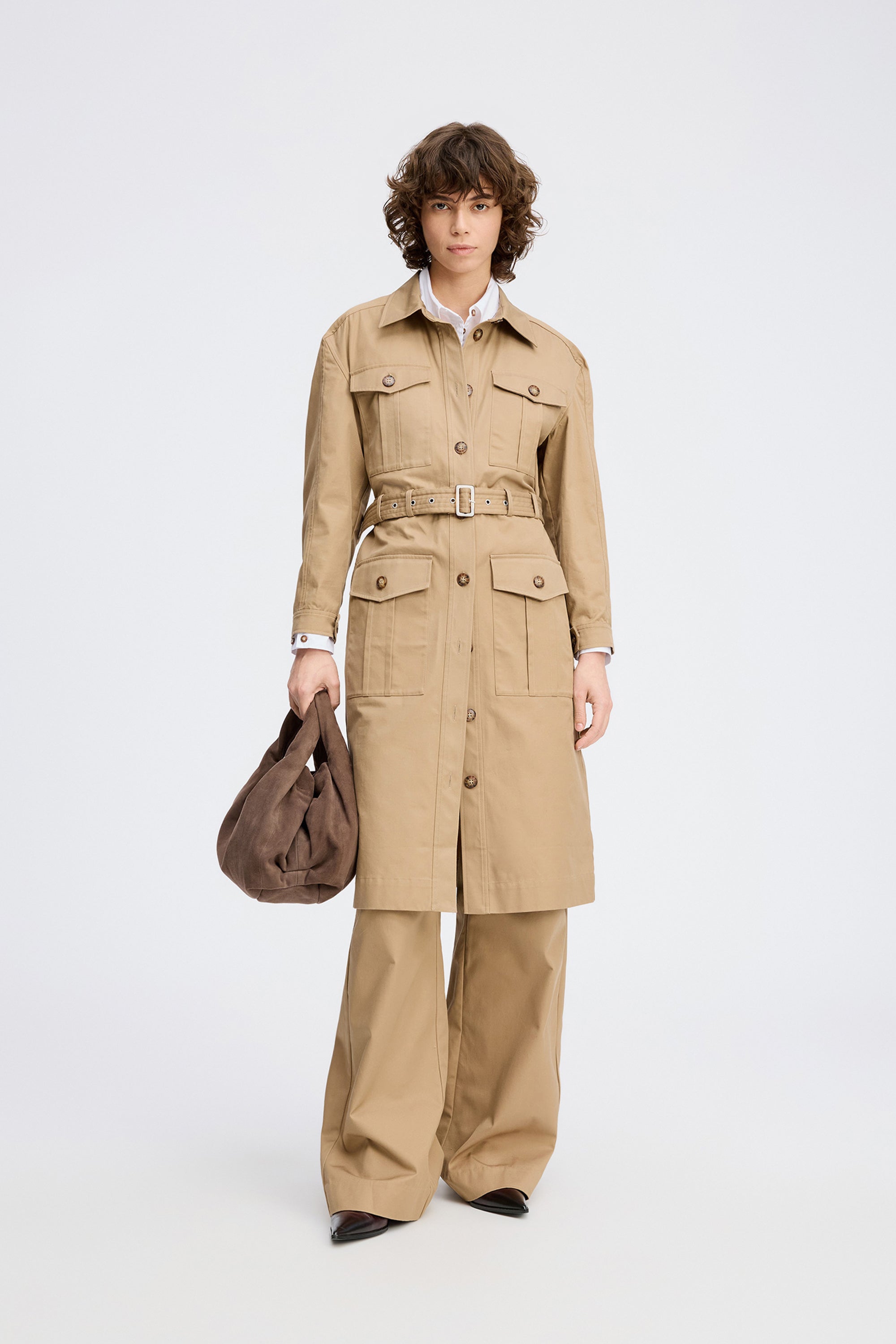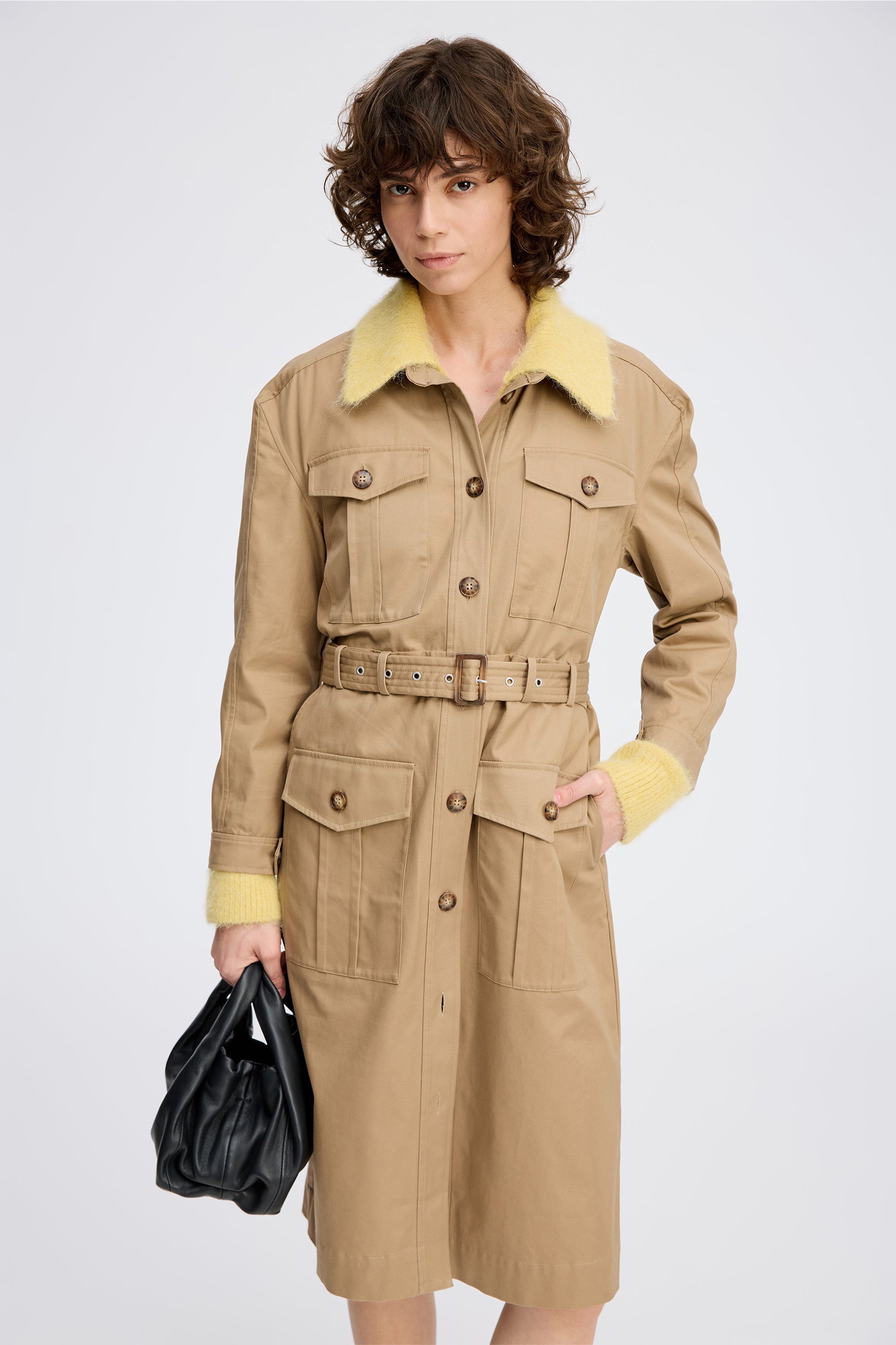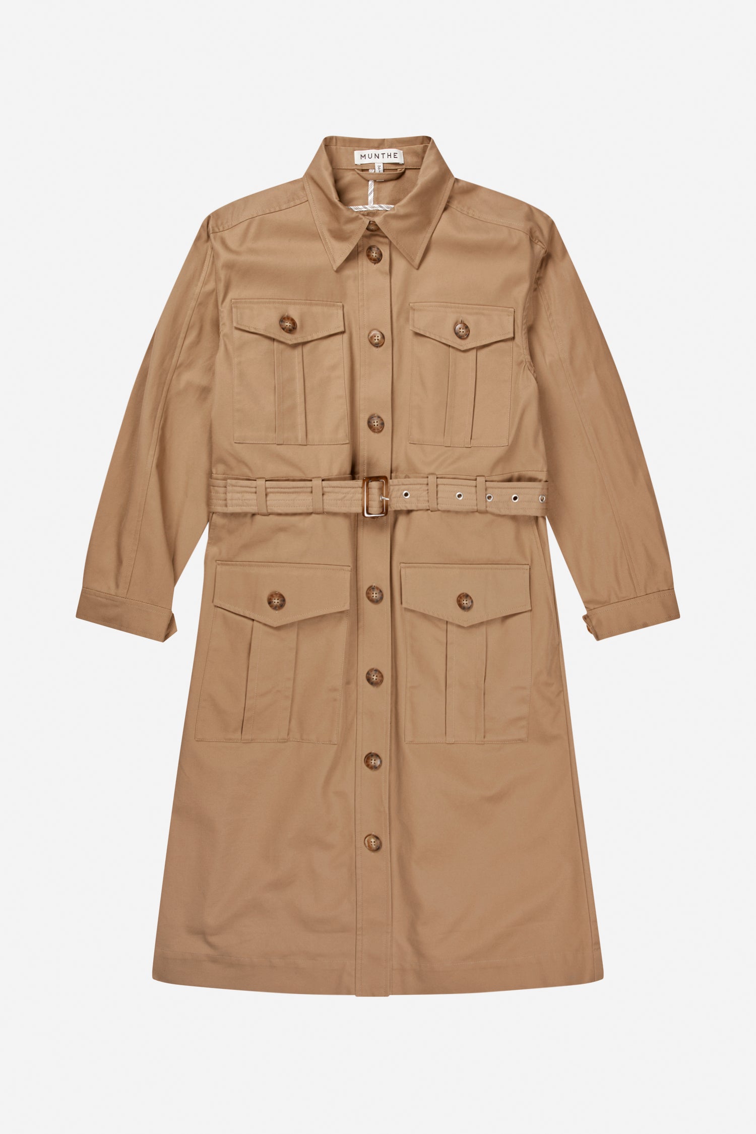 Stilvolles, trench-inspiriertes Kleid in klassischem Camel mit tailliertem Hemdkragen, durchgehender Knopfleiste und aufgesetzten Taschen im Utility-Stil. Abgerundet mit passendem Gürtel, der die Taille betont und vielseitige Stylingmöglichkeiten bietet.