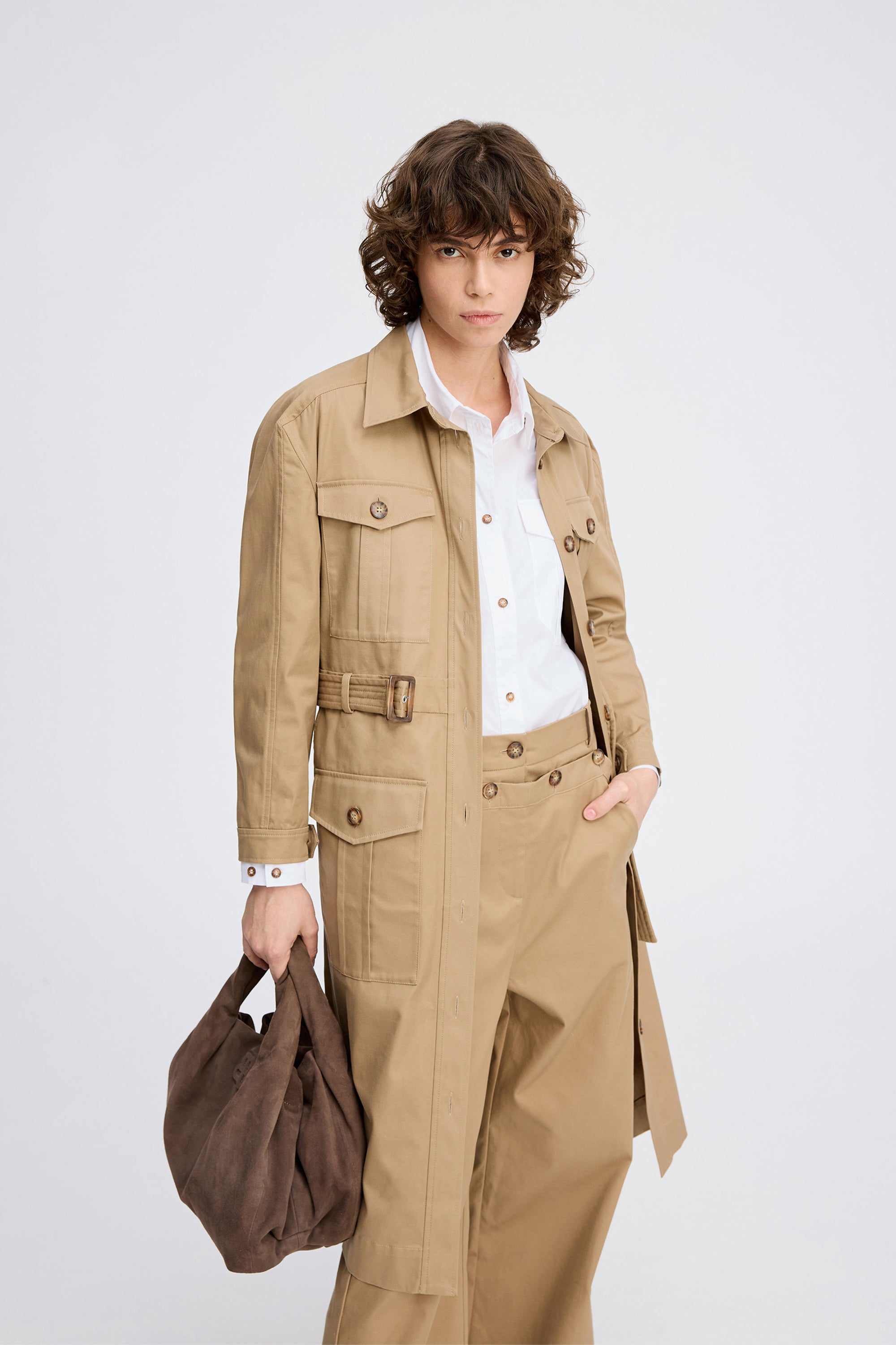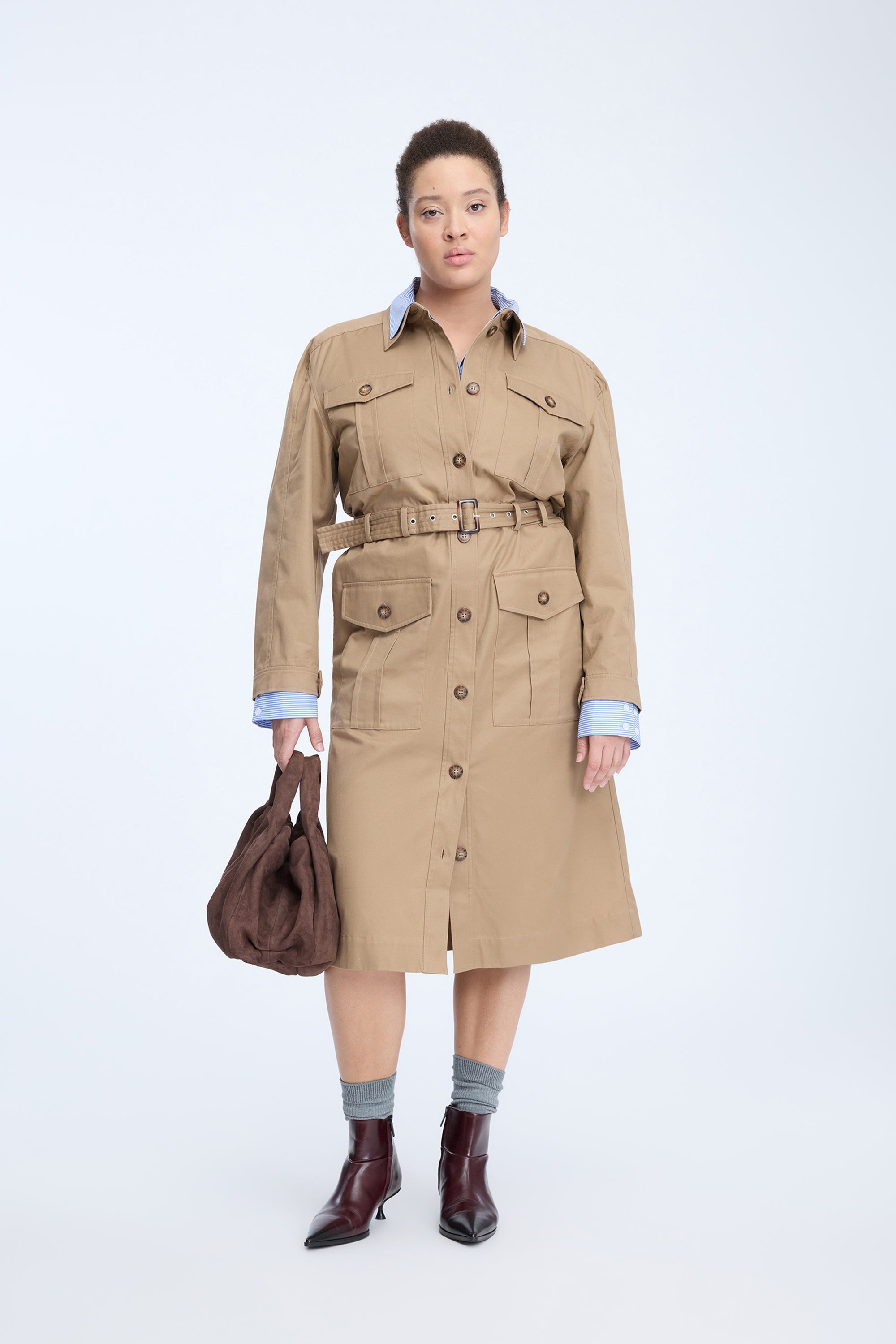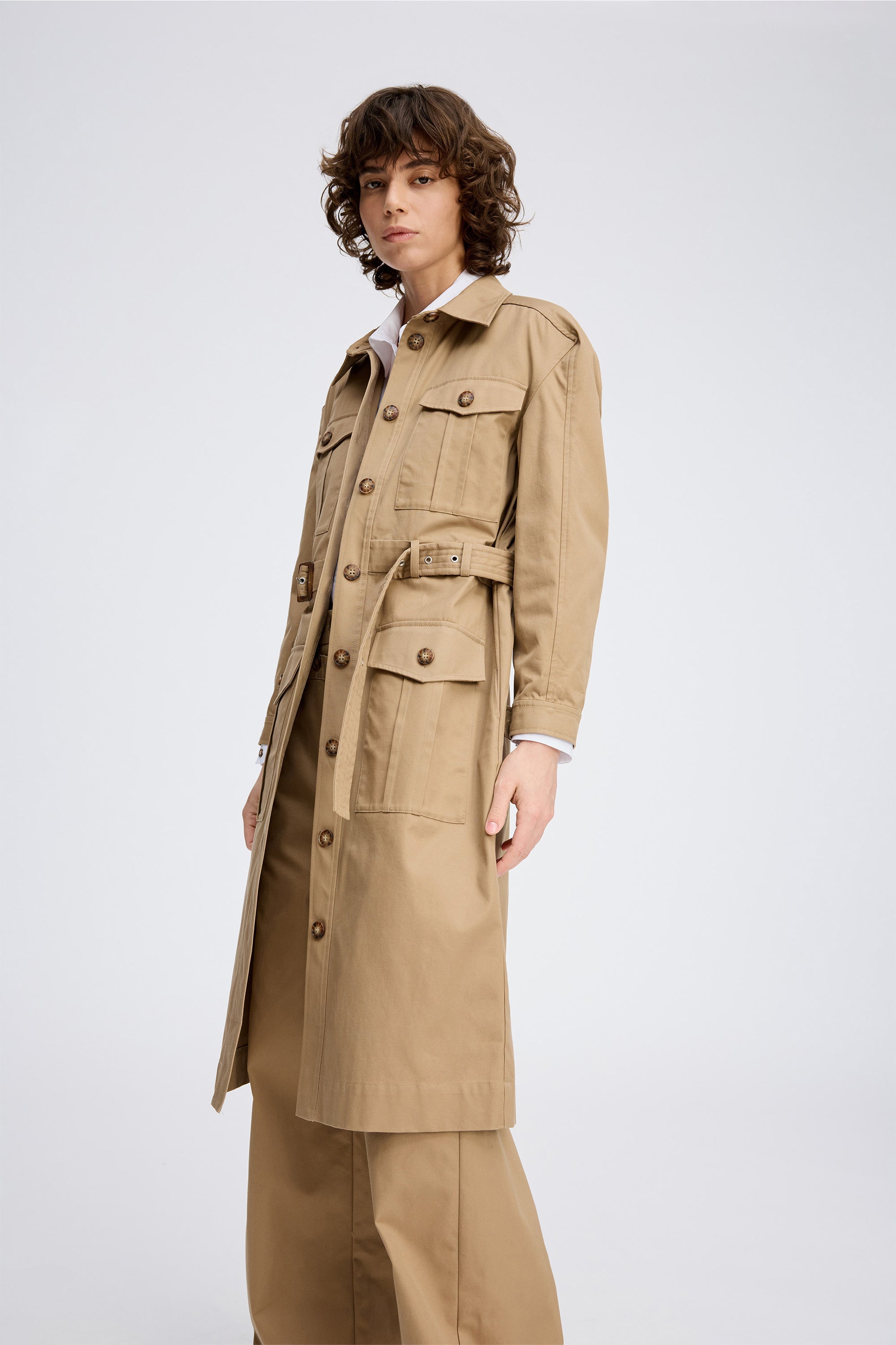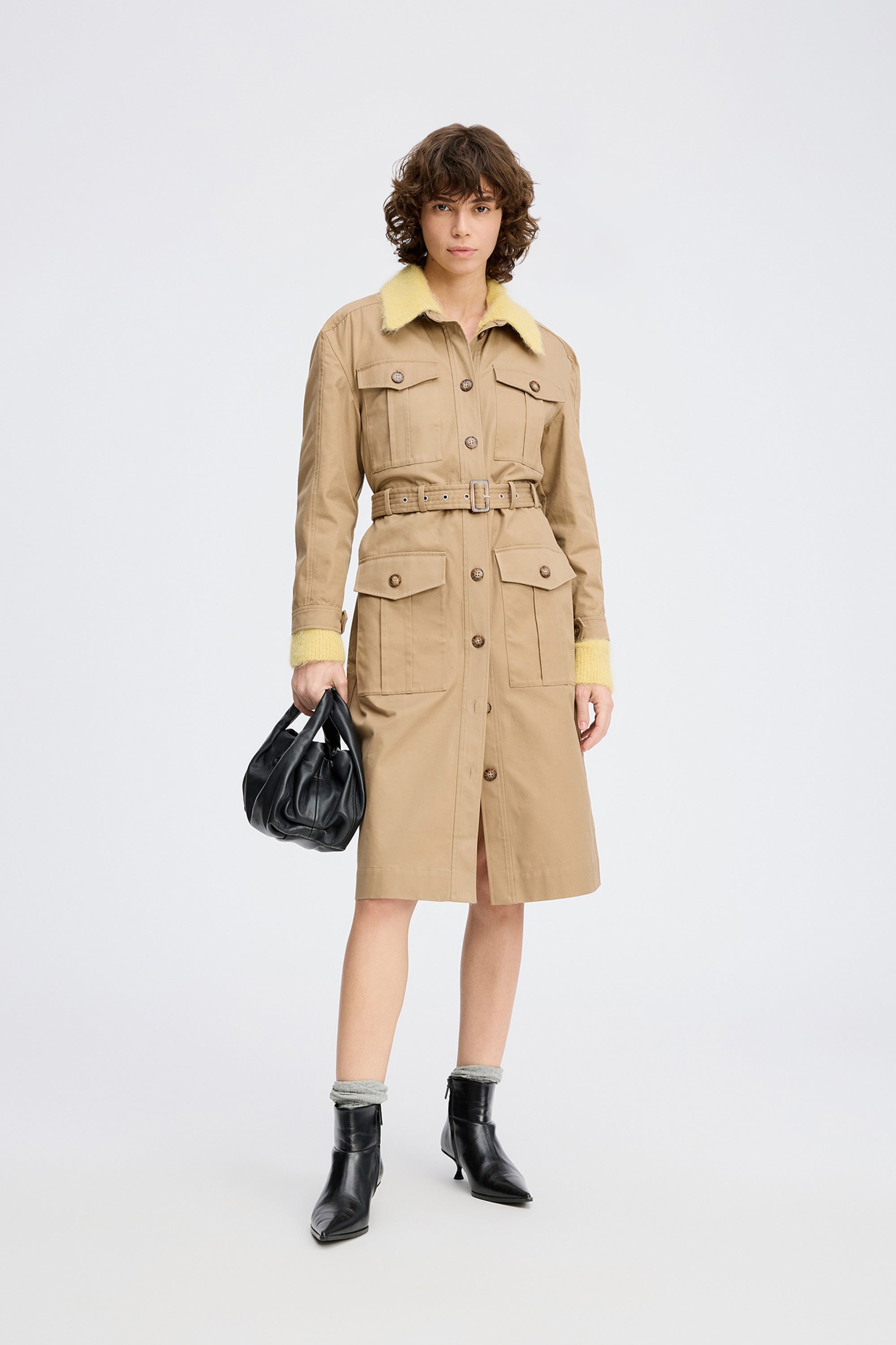 Stilvolles, trench-inspiriertes Kleid in klassischem Camel mit tailliertem Hemdkragen, durchgehender Knopfleiste und aufgesetzten Taschen im Utility-Stil. Abgerundet mit passendem Gürtel, der die Taille betont und vielseitige Stylingmöglichkeiten bietet.