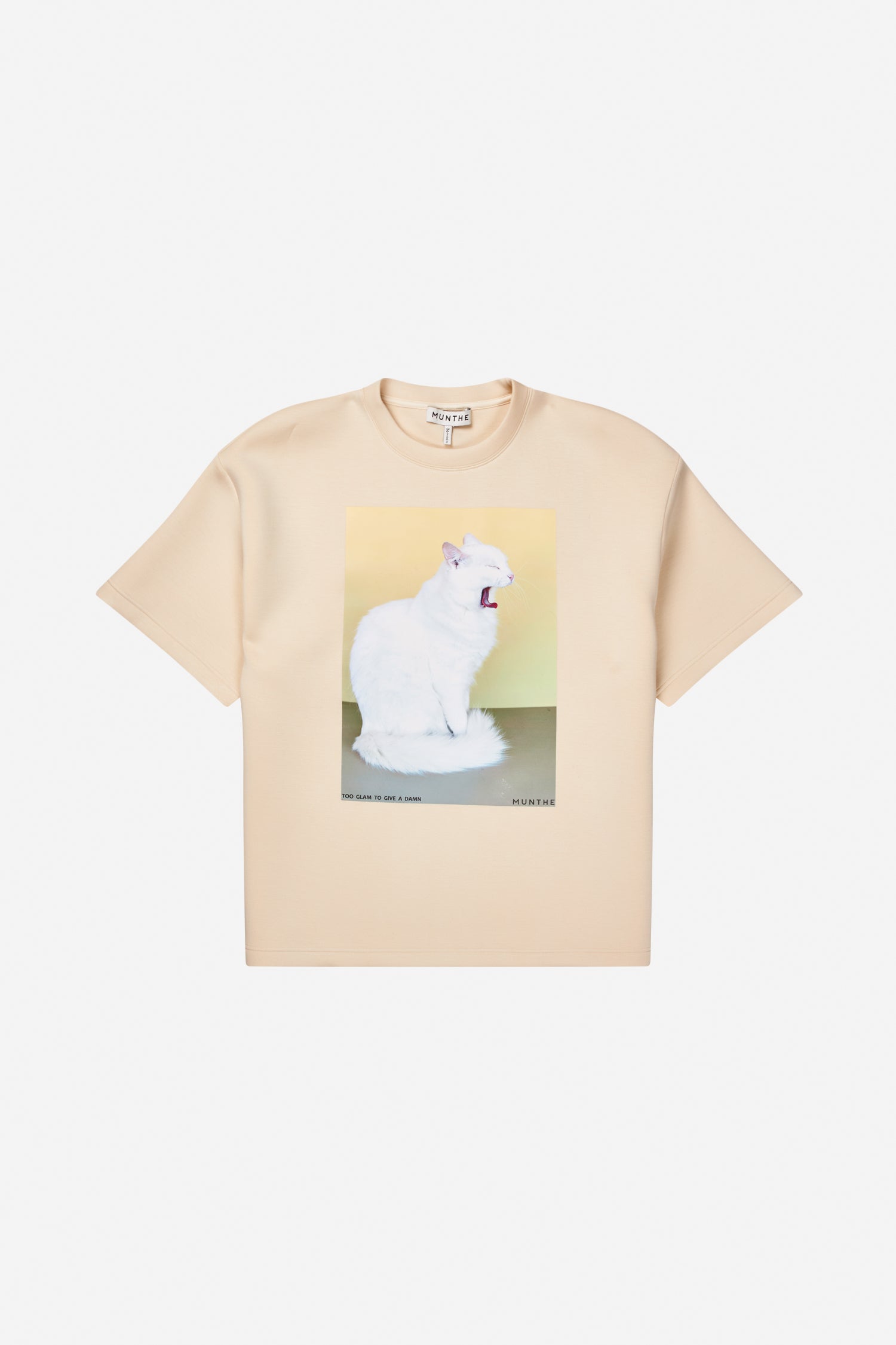 Neoprenbluse mit elegantem Katzenprint. Diese Bluse ist oversized geschnitten, hat kurze Ärmel und einen Rundhalsausschnitt.