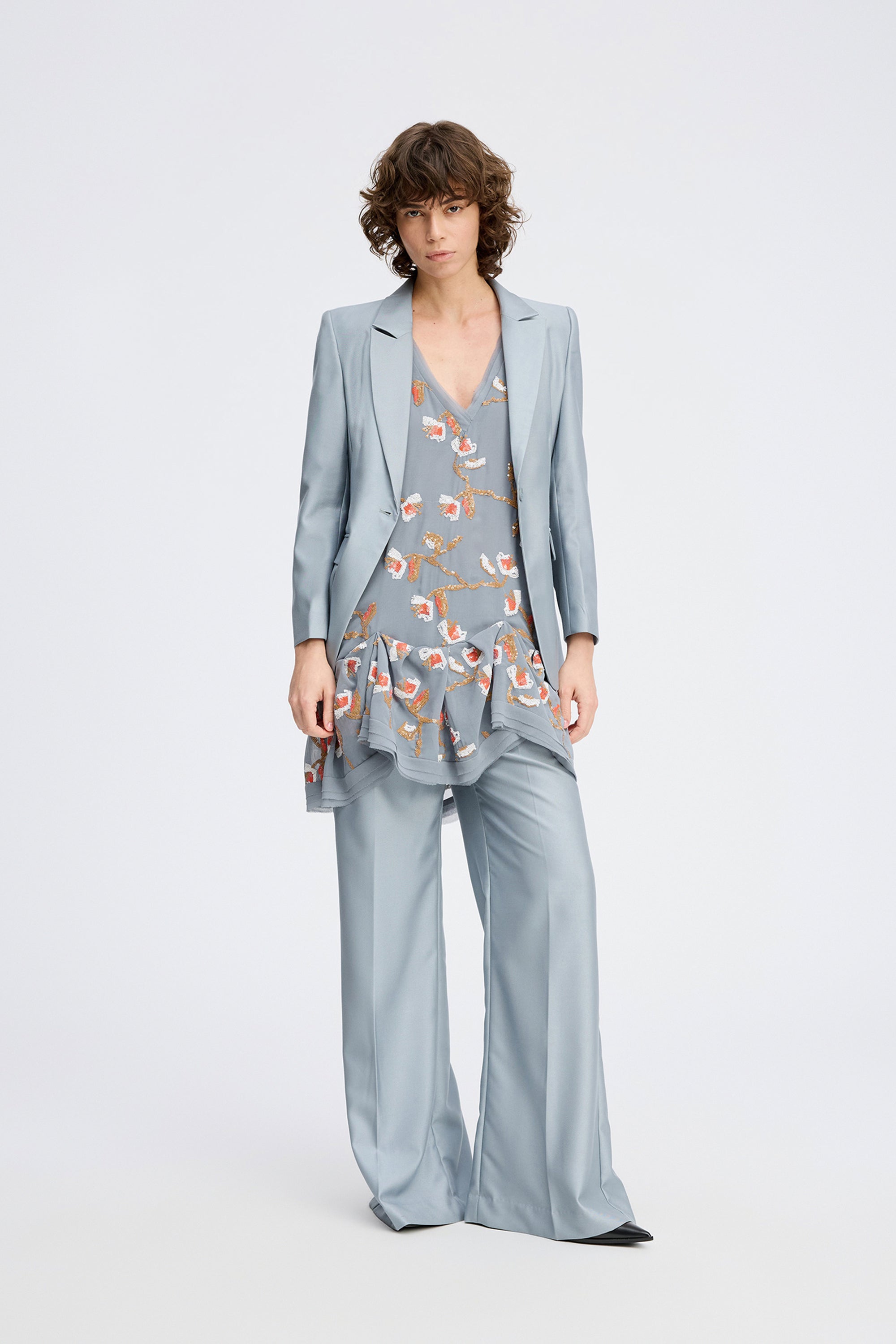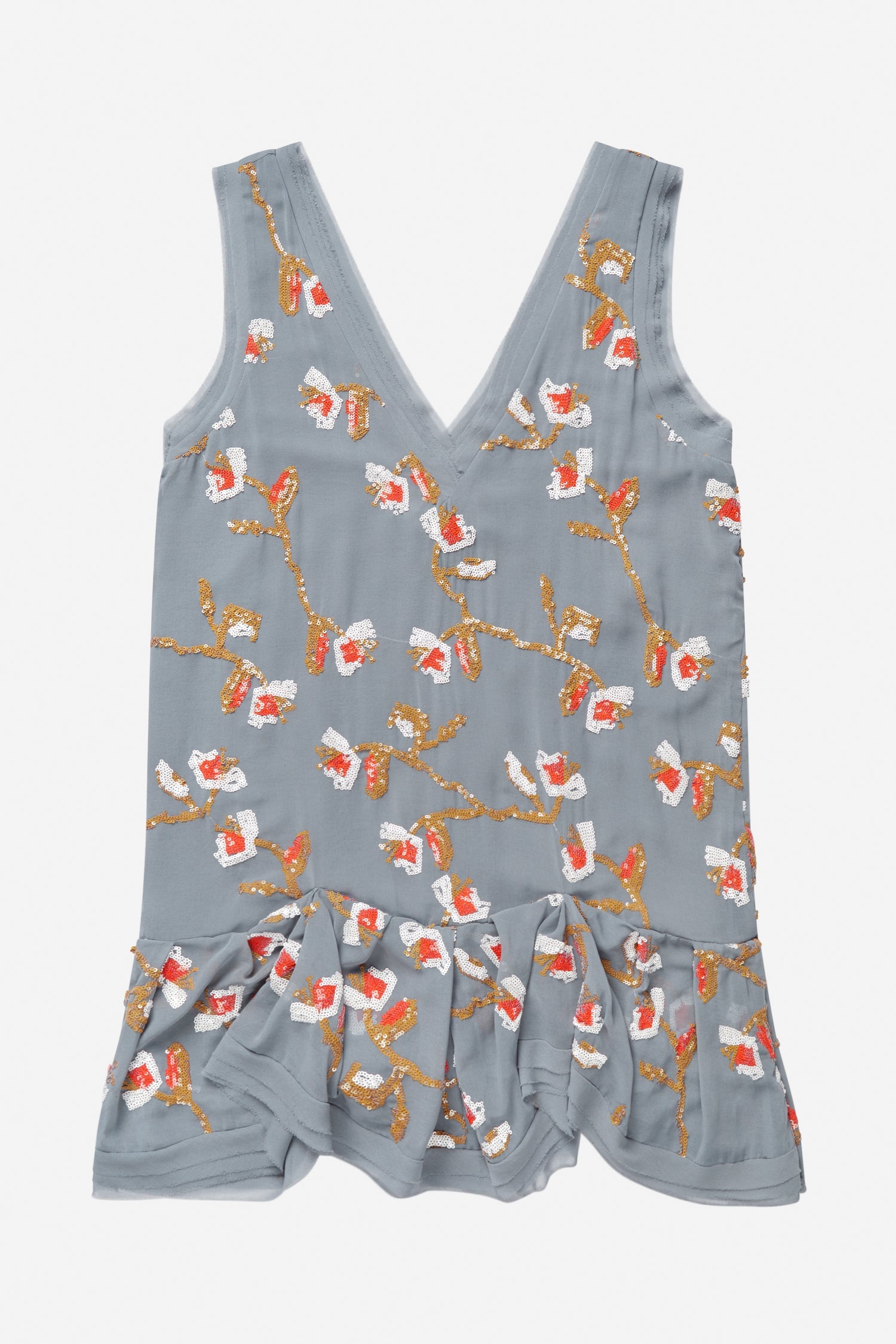 Minikleid aus weichem, hellgrauem Chiffon, verziert mit Pailletten in elegantem Blumenmuster. Das Kleid hat einen tiefen V-Ausschnitt, eine leichte A-Linien-Passform und einen asymmetrischen, gerüschten Saum.