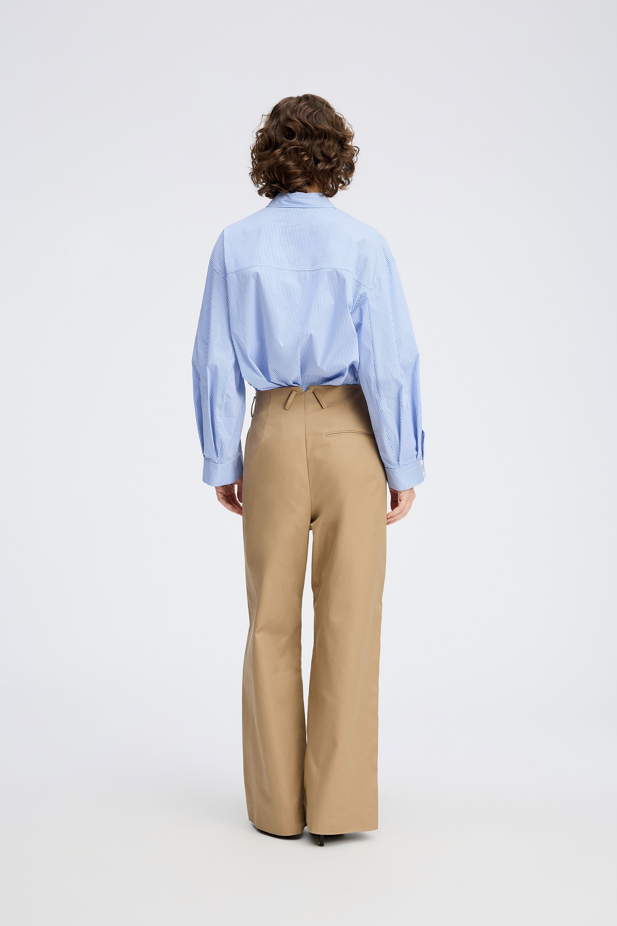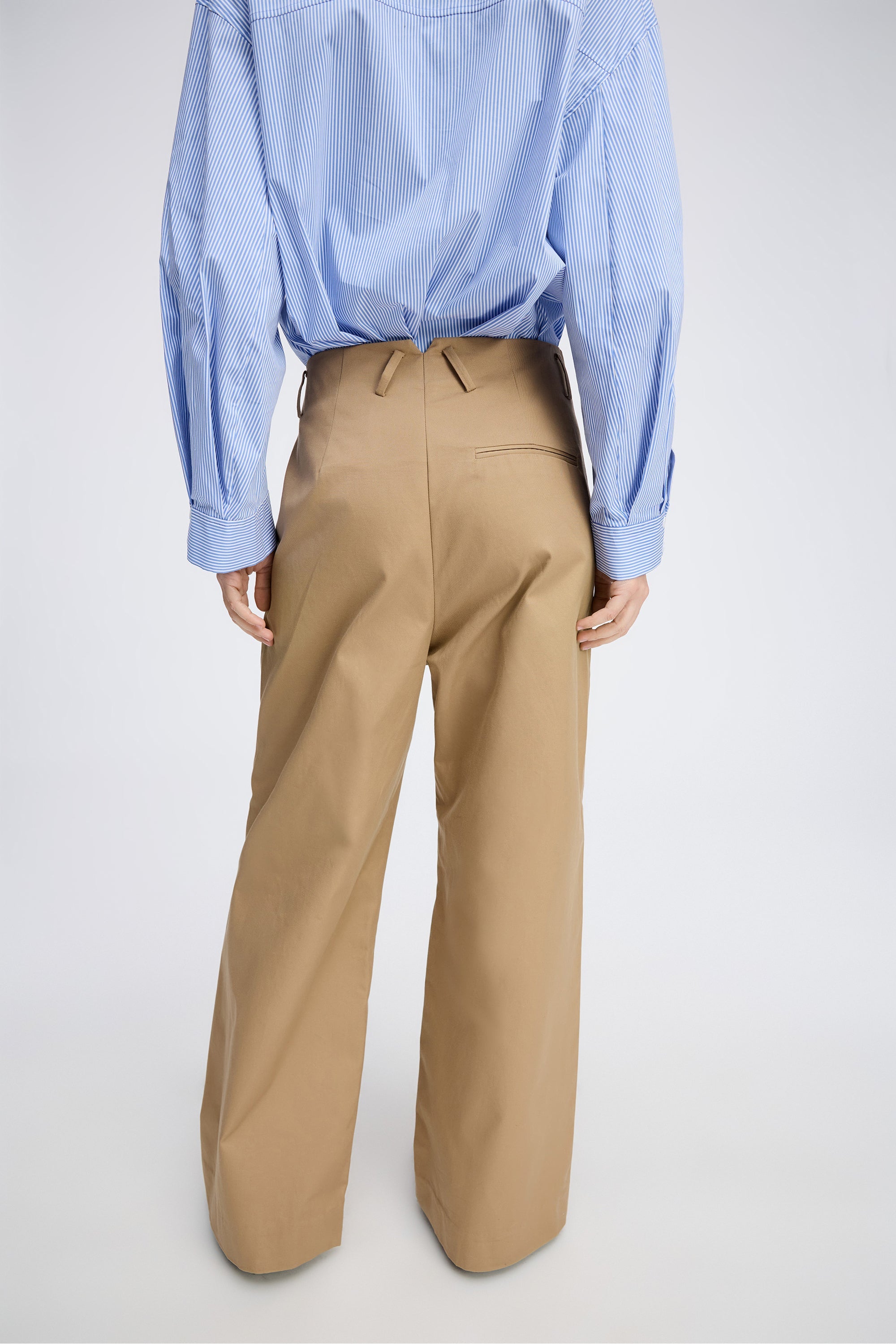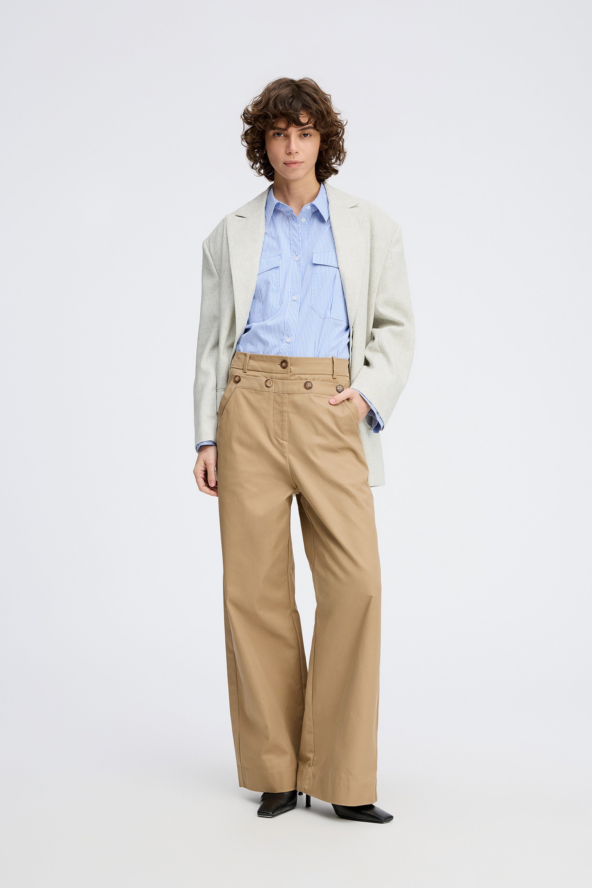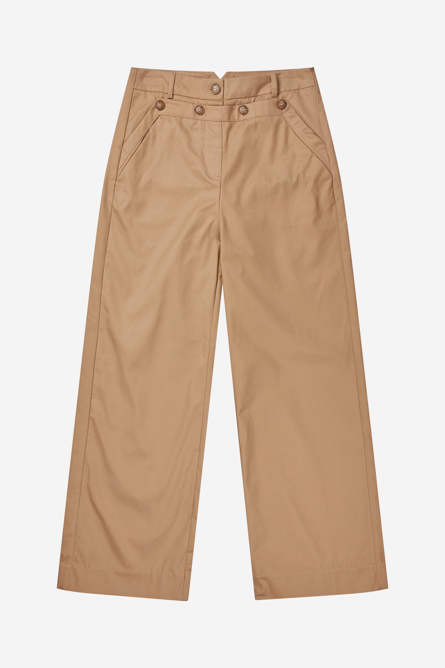 Stilvolle Hose in klassischem Camelfarbton mit weitem Bein. Mit High Waist und besonderen Knopfdetails auf der Vorderseite, die dem zeitlosen Look einen modernen Touch verleihen.