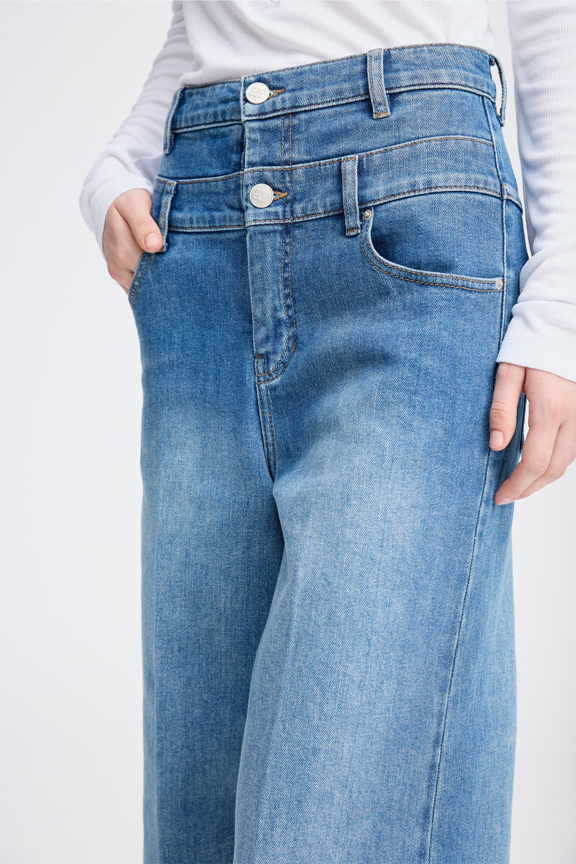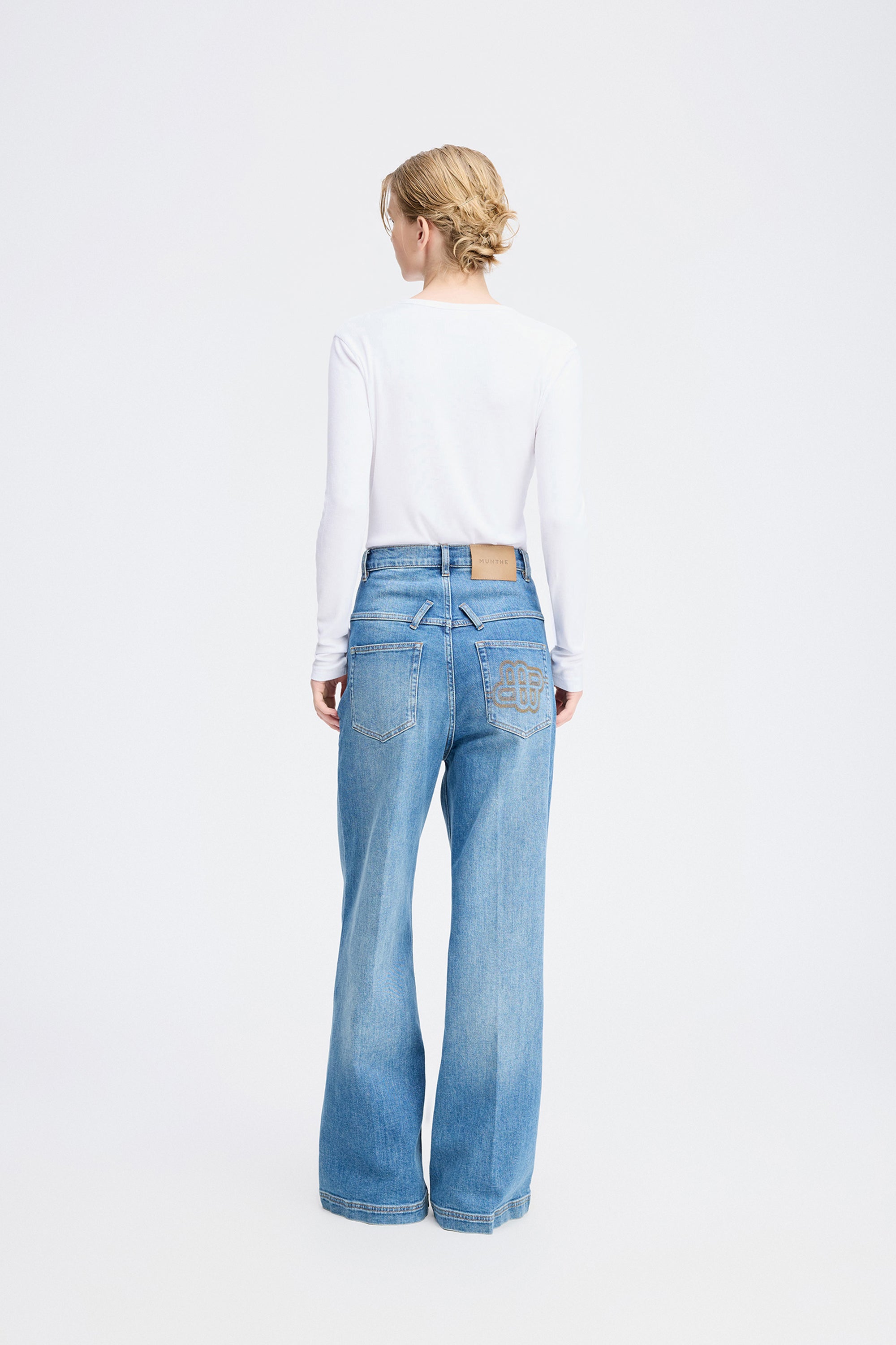 High-Waist Jeans mit Kontrastnähten. Diese Jeans sind mit einem schönen MUNTHE-Emblem auf der Gesäßtasche, weiten Beinen, Gürtelschlaufen, Taschen und einem eleganten doppelten Knopfverschluss gestaltet.