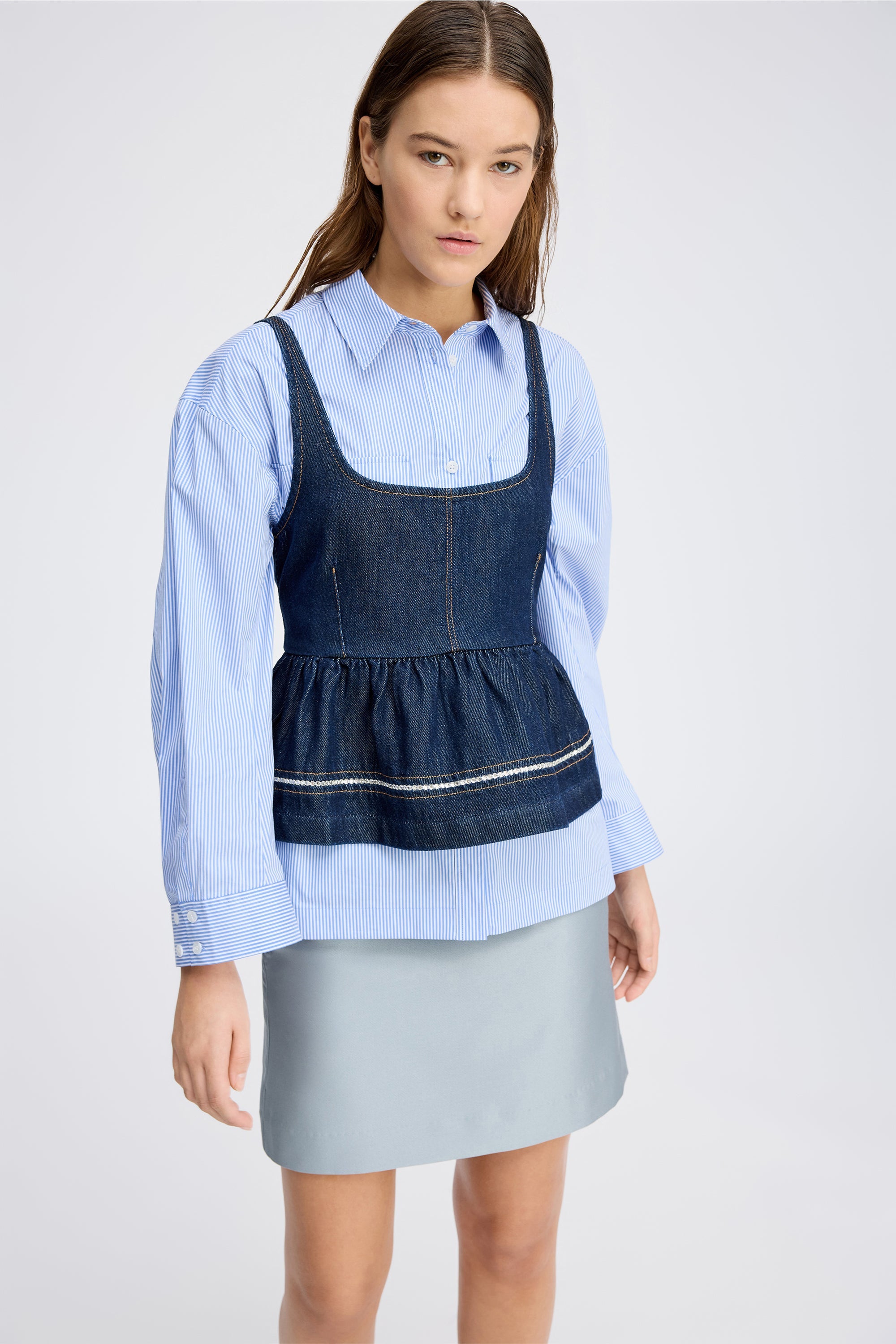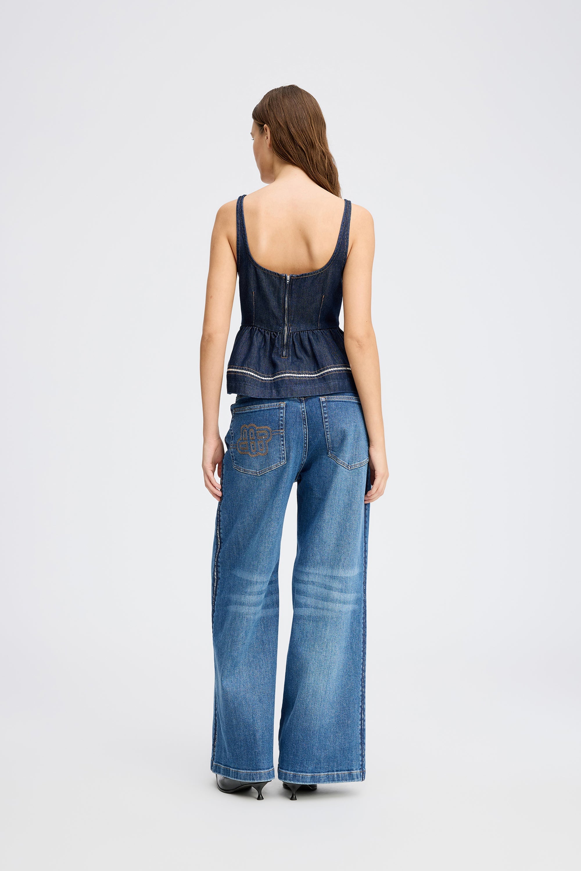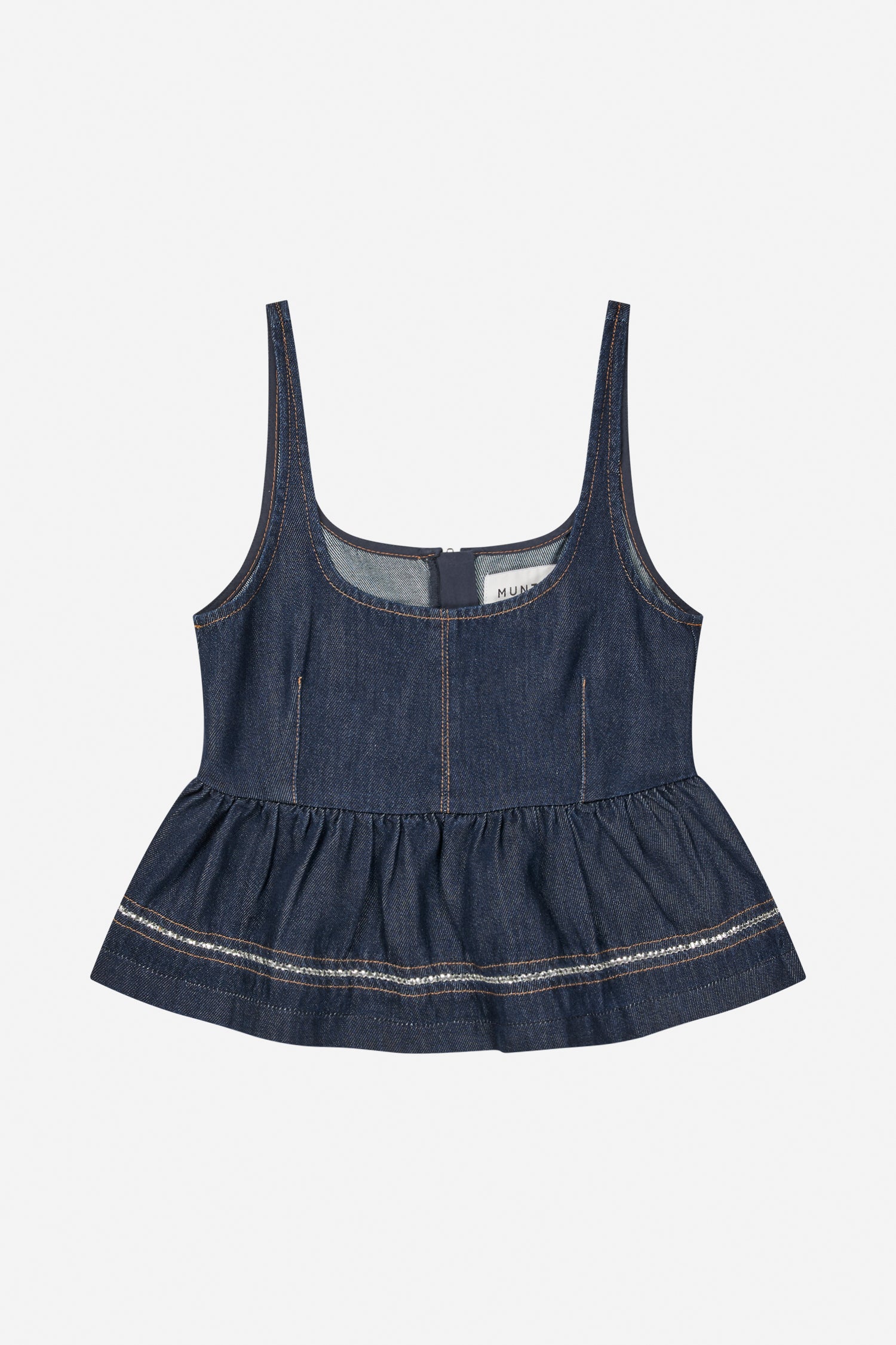 Schönes Denim-Top mit breiten Trägern und elegantem Schößchen-Schnitt. Das Top ist mit dekorativen Nähten und feinen Strassdetails entlang des Saums gestaltet.