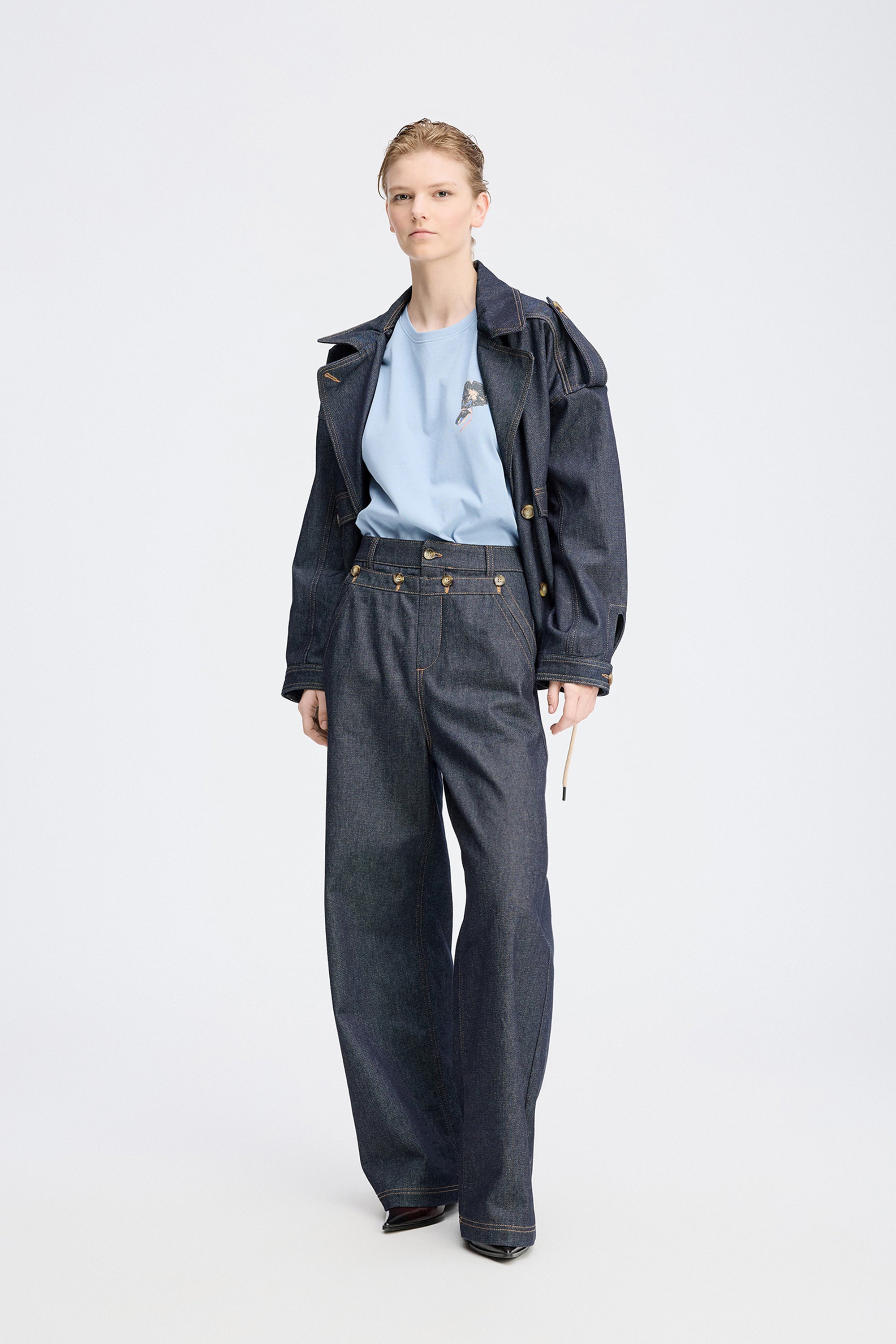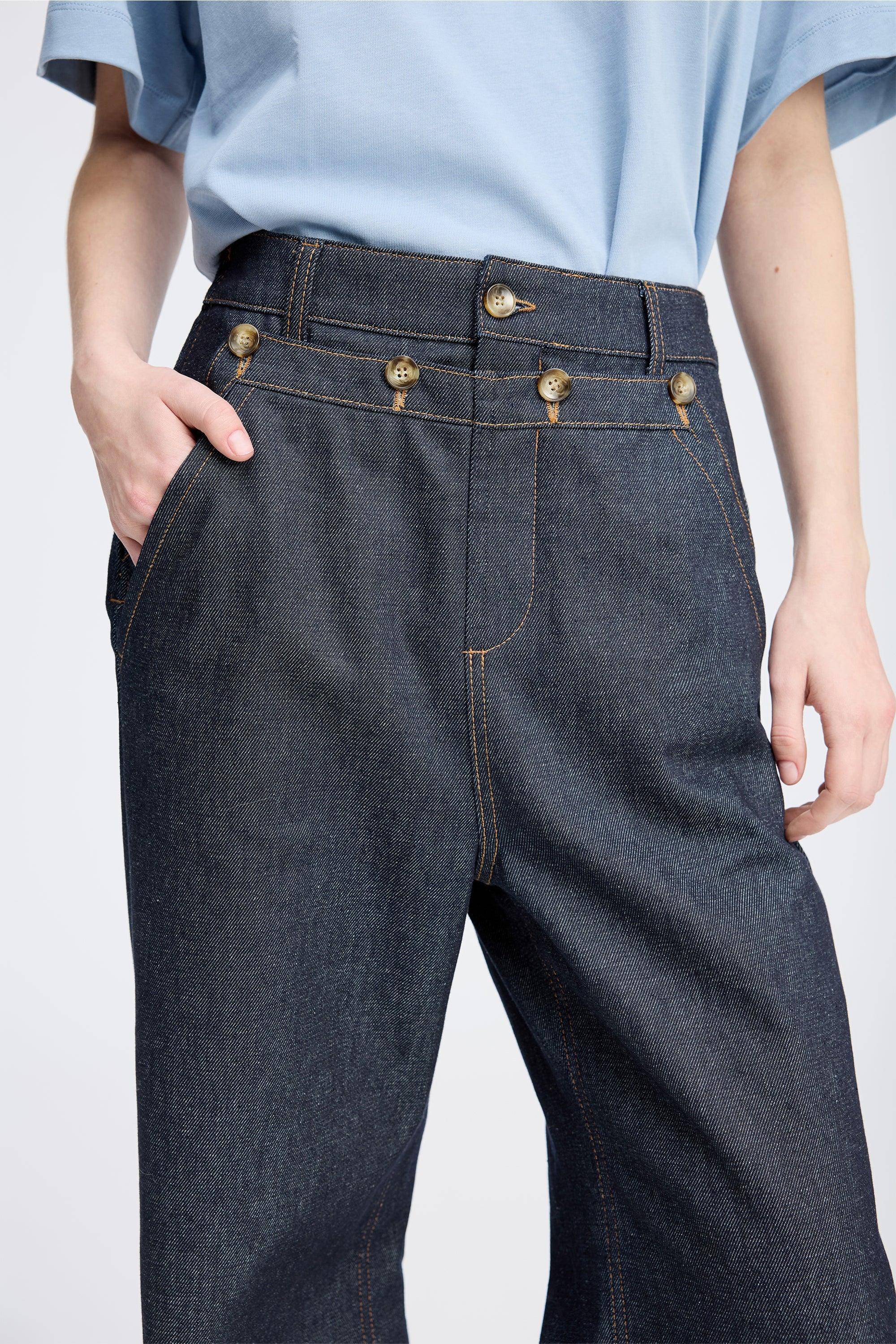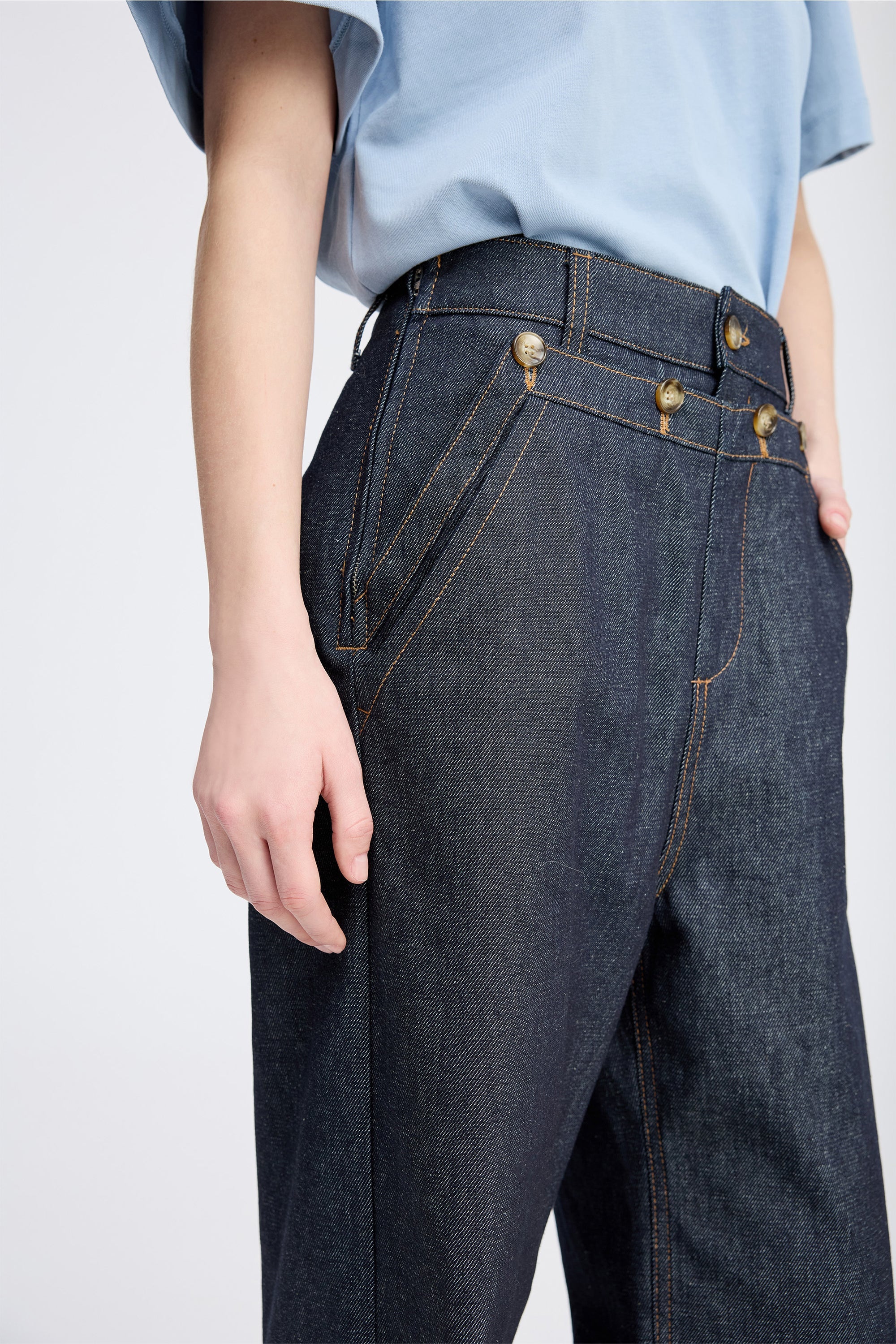 Elegante Jeans mit High Waist und einzigartigen Knopfdetails auf der Vorderseite, die dem zeitlosen Design einen modernen Touch verleihen. Diese Jeans sind mit einem seitlichen Reißverschluss, Gürtelschlaufen und Gesäßtaschen gestaltet.