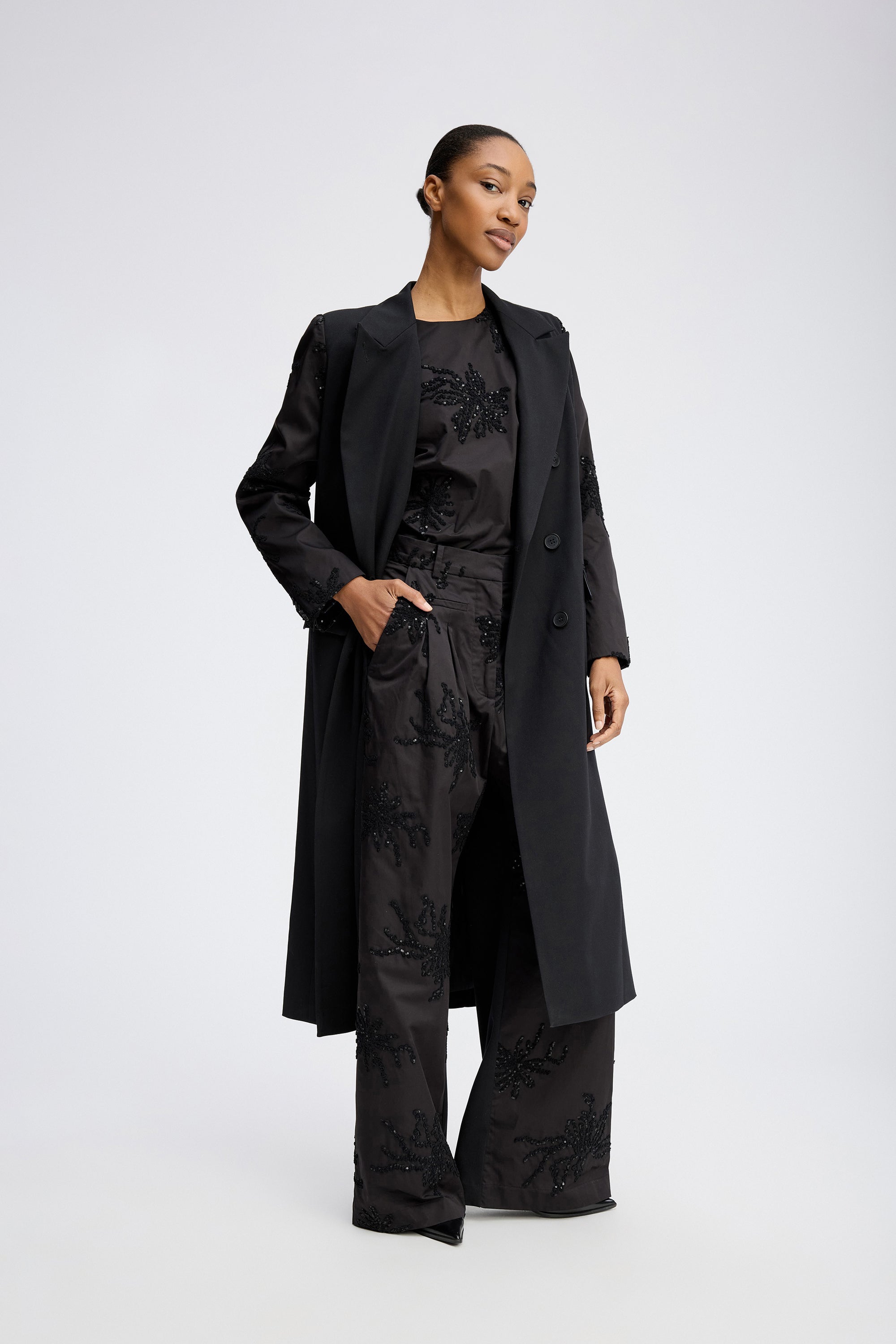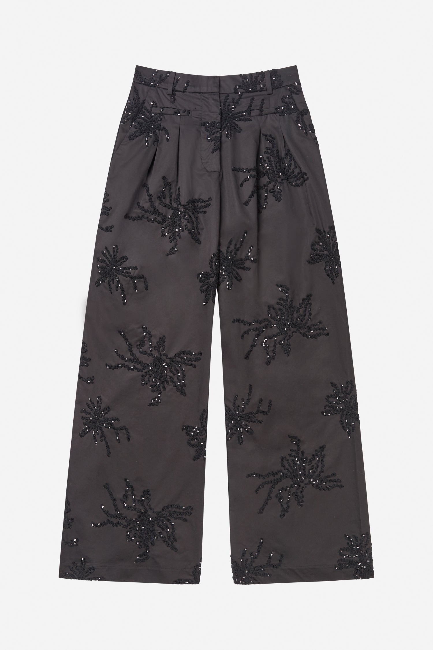 Elegante Hose mit weiten Beinen und feiner Ton-in-Ton-Pailletten- und Perlenstickerei. Mit High Waist, Bügelfalten, Gürtelschlaufen und Seitentaschen.