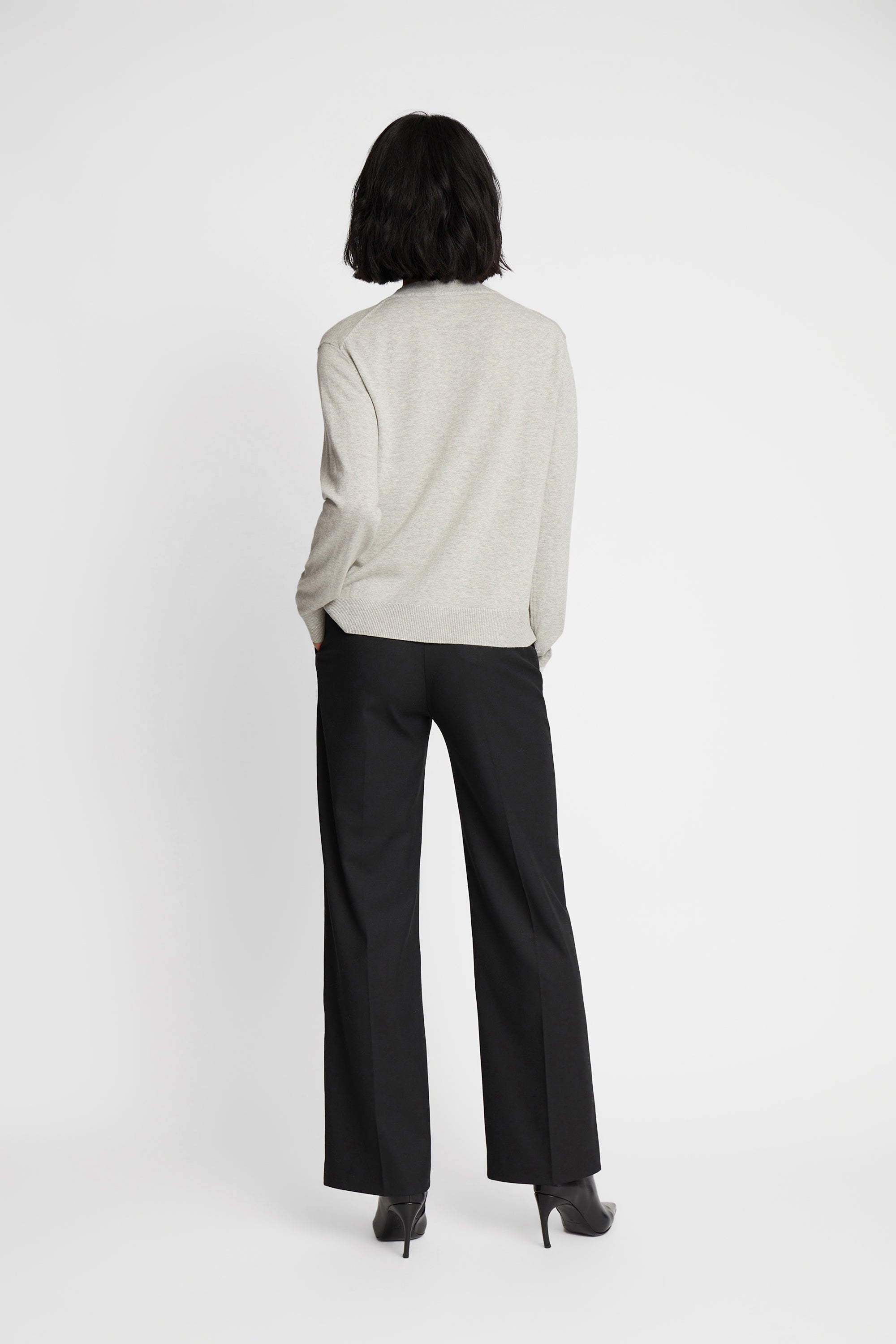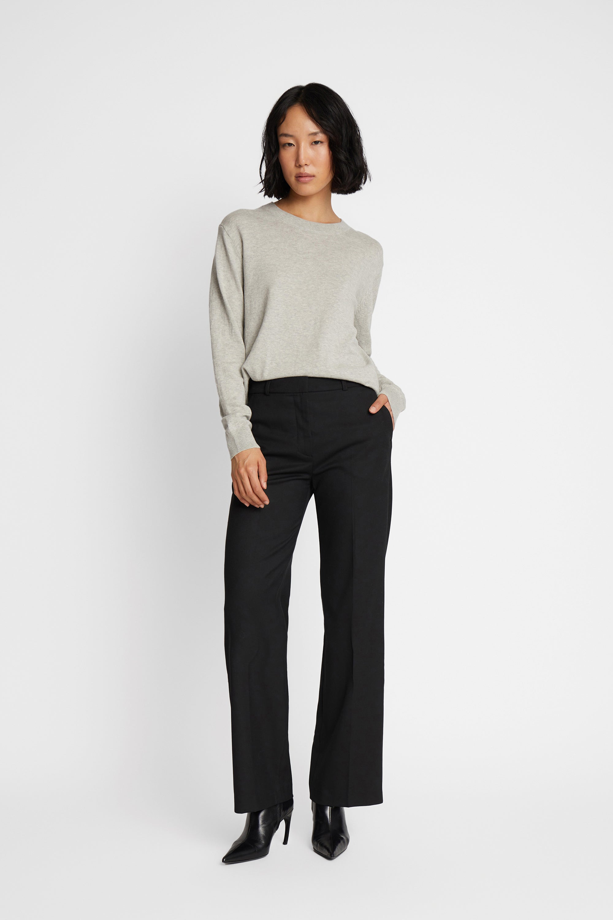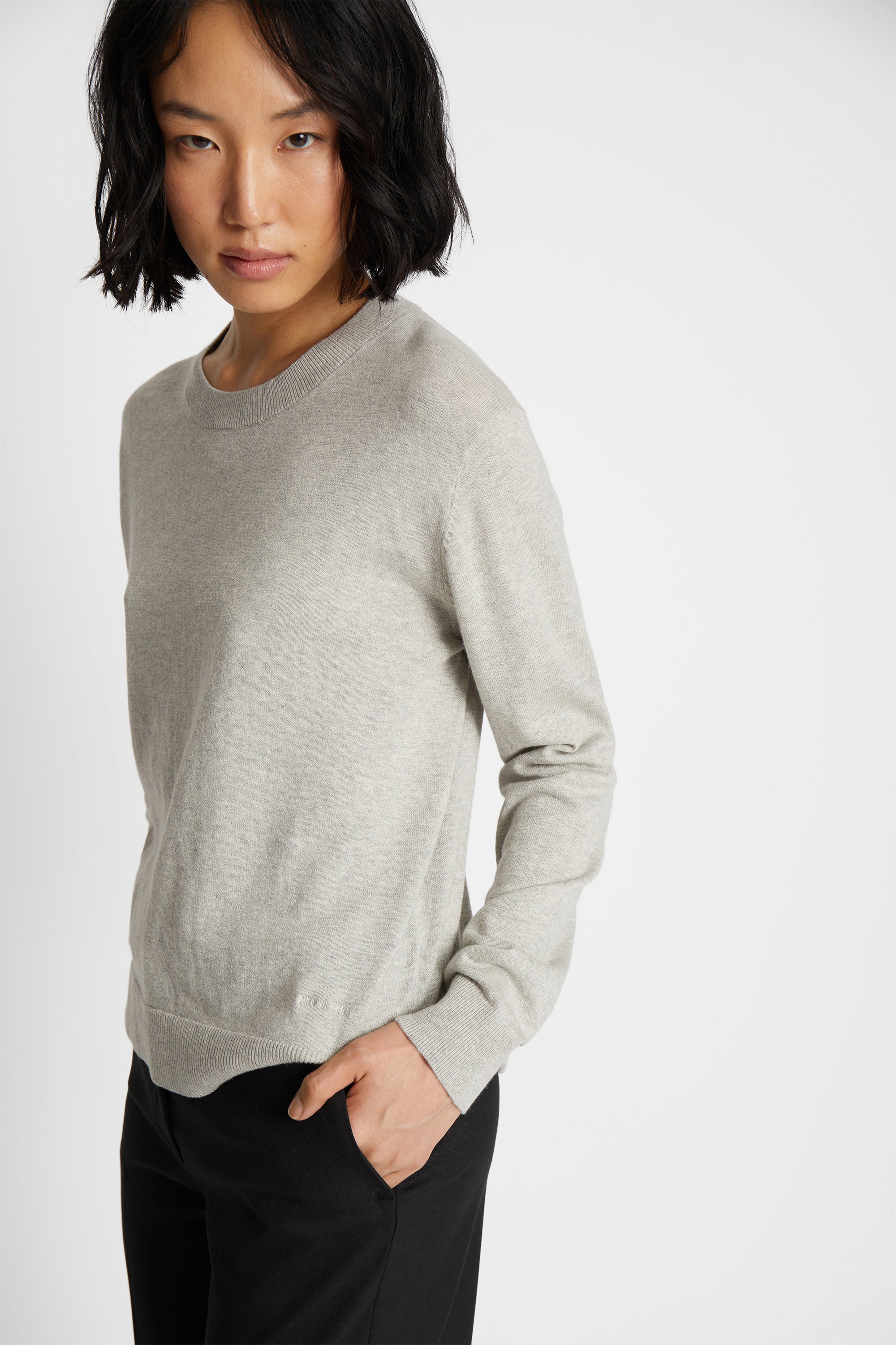 Klassischer leichter Strick aus einer weichen Merinowollmischung. Das Strickstück hat lange Ärmel, einen Rundhalsausschnitt und eine elegante Rippe entlang der Kanten.