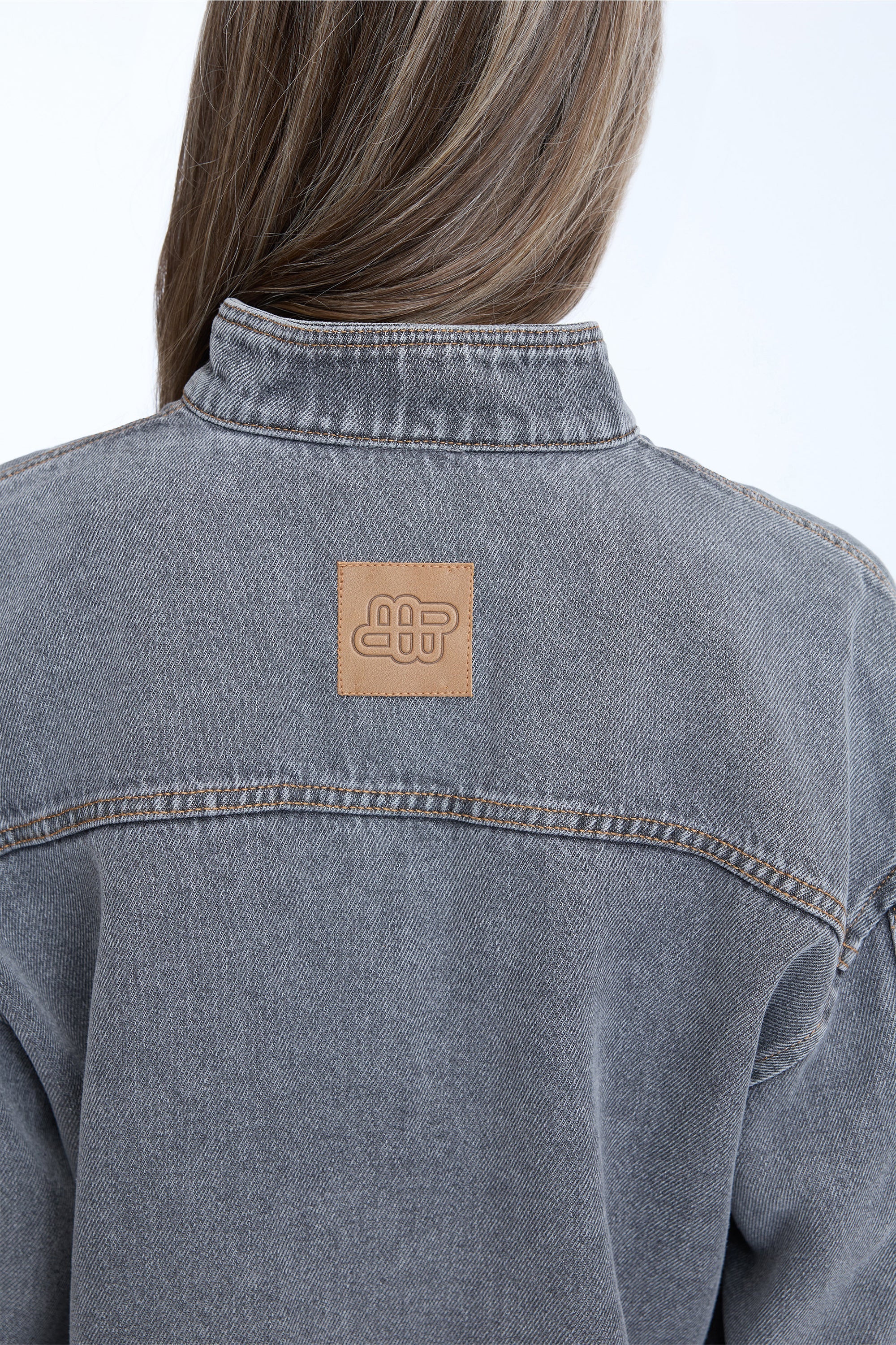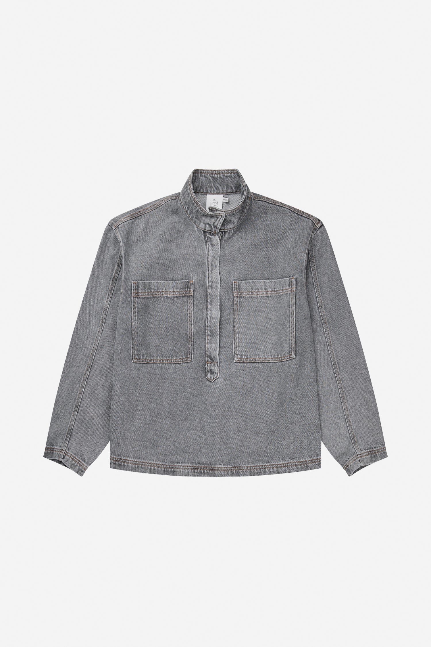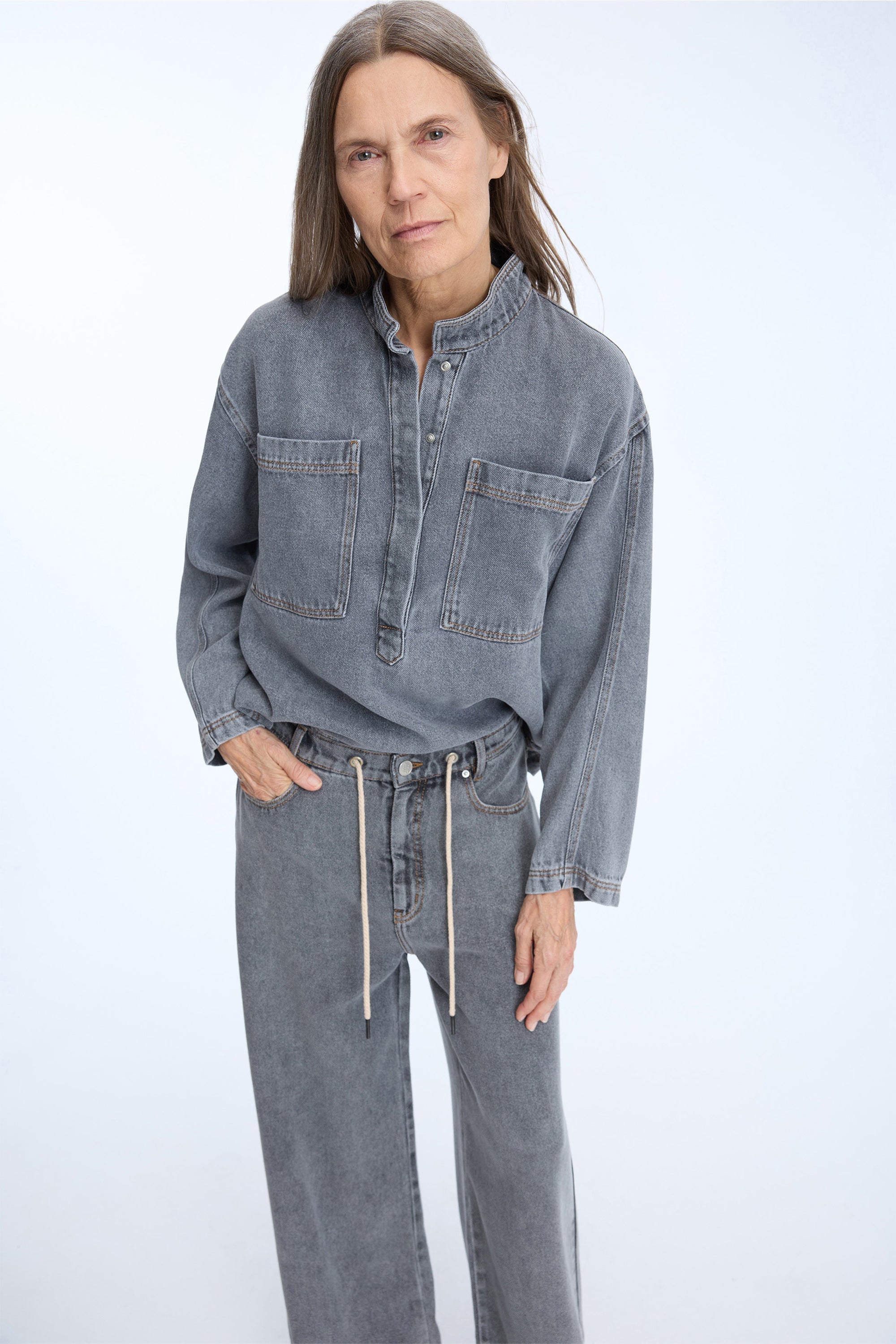 Ein Jeanshemd mit übergroßen Taschen auf der Brust, kann bis zur Hälfte geöffnet werden und hat einen eleganten kleinen Kragen. Das Hemd hat eine normale Passform.