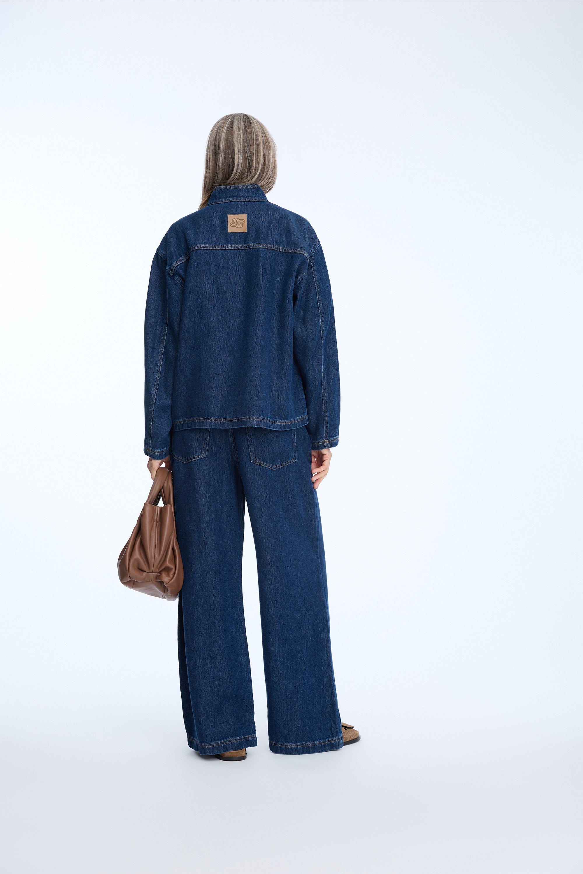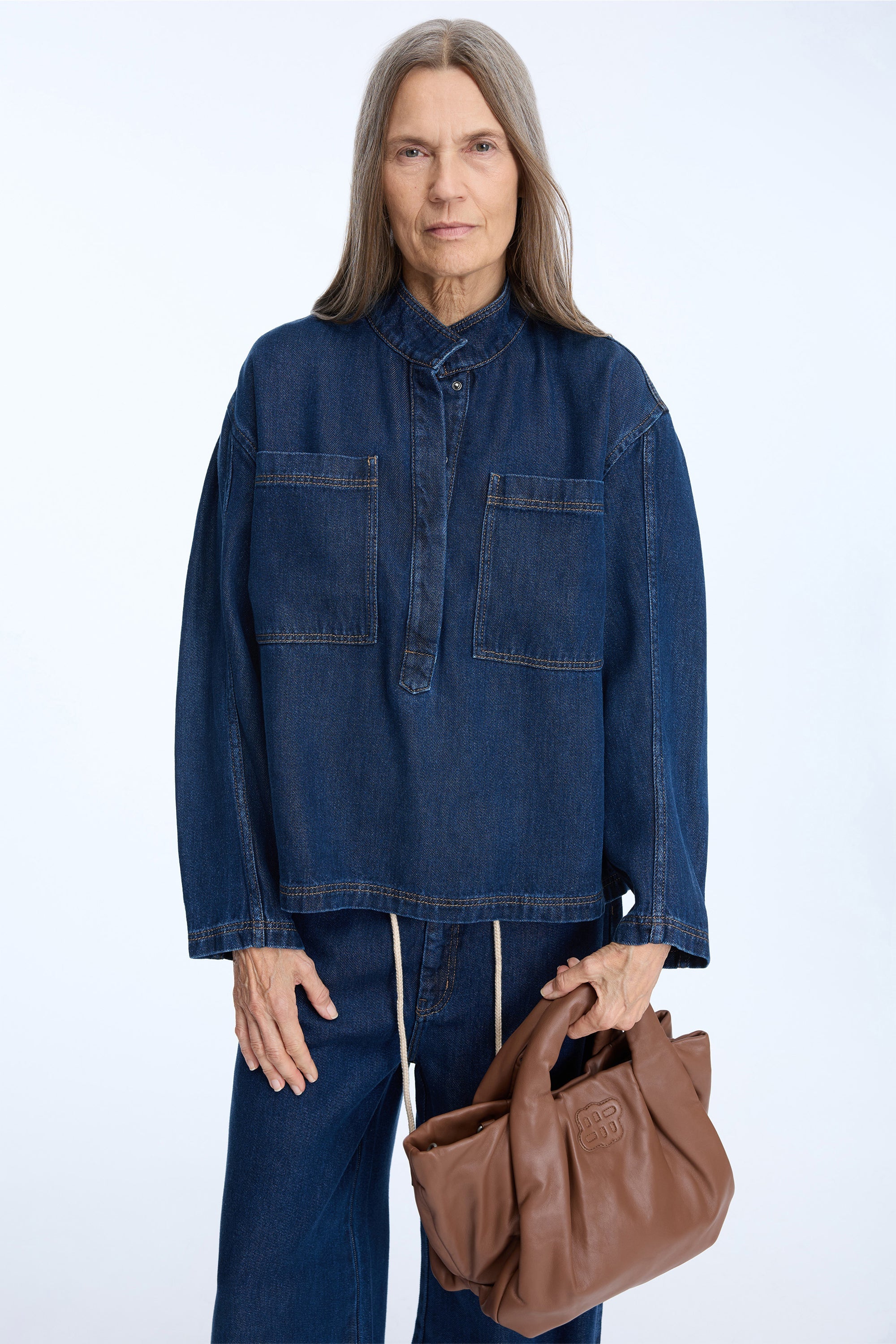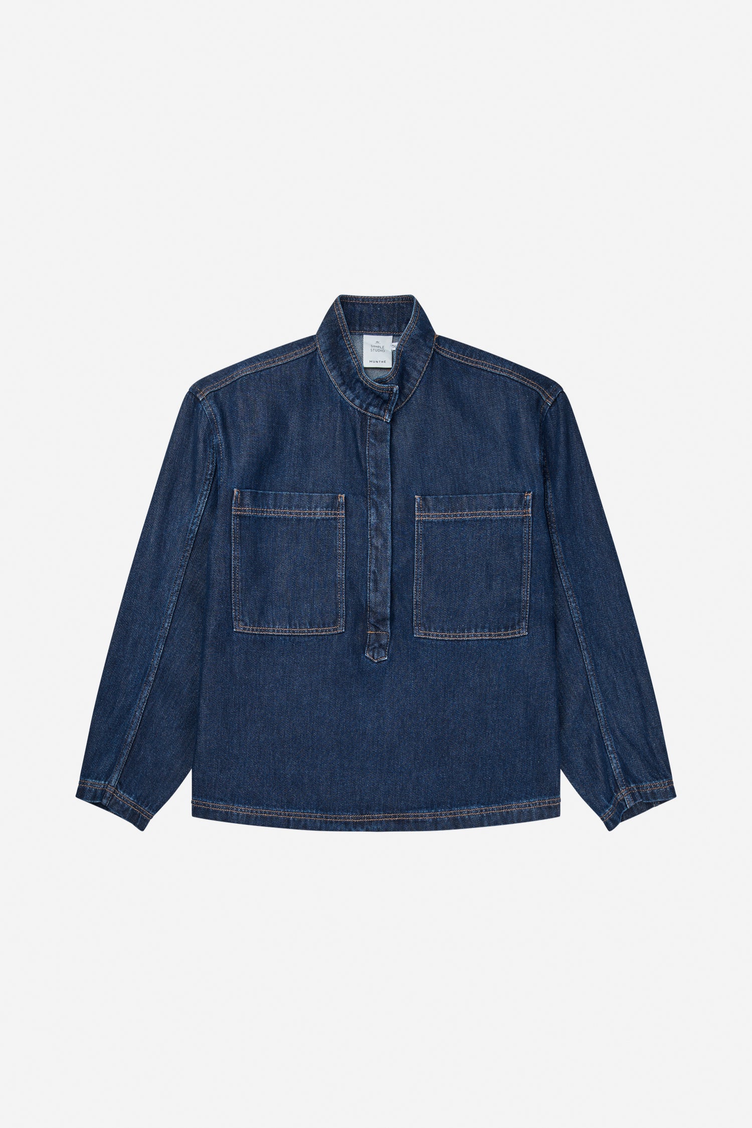 Ein Jeanshemd mit übergroßen Taschen auf der Brust, kann bis zur Hälfte geöffnet werden und hat einen eleganten kleinen Kragen. Das Hemd hat eine normale Passform.