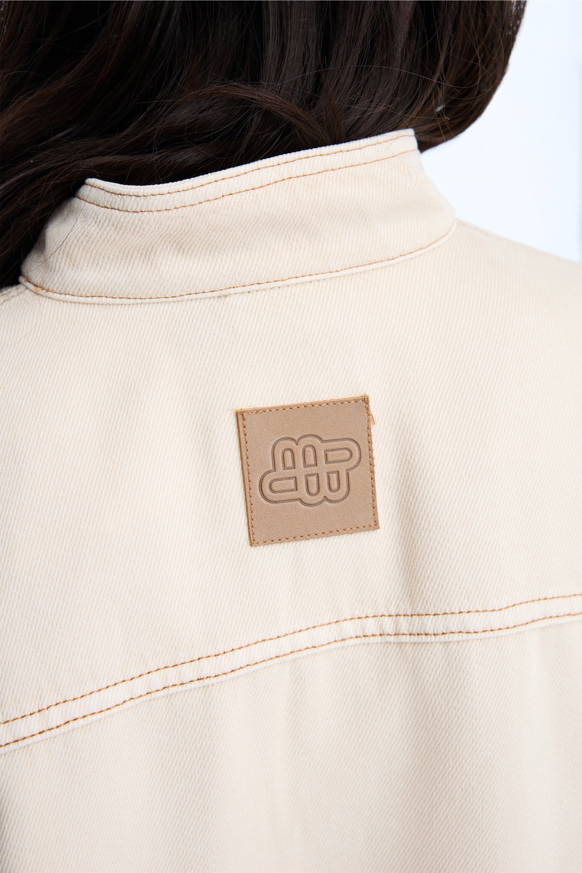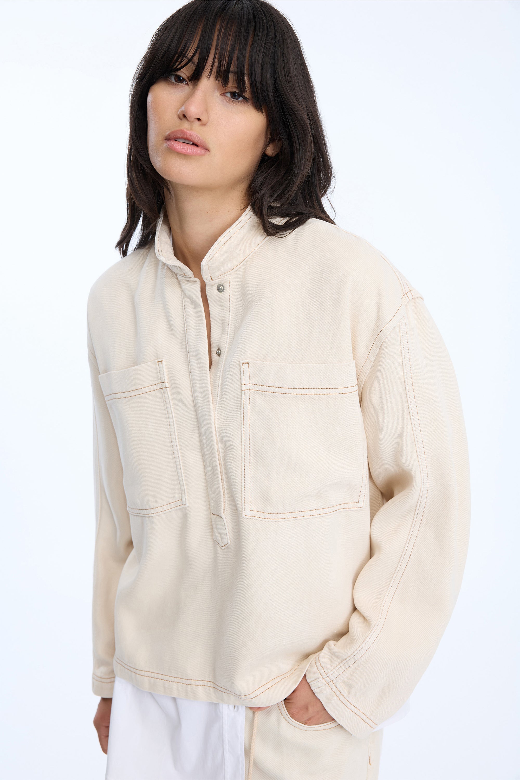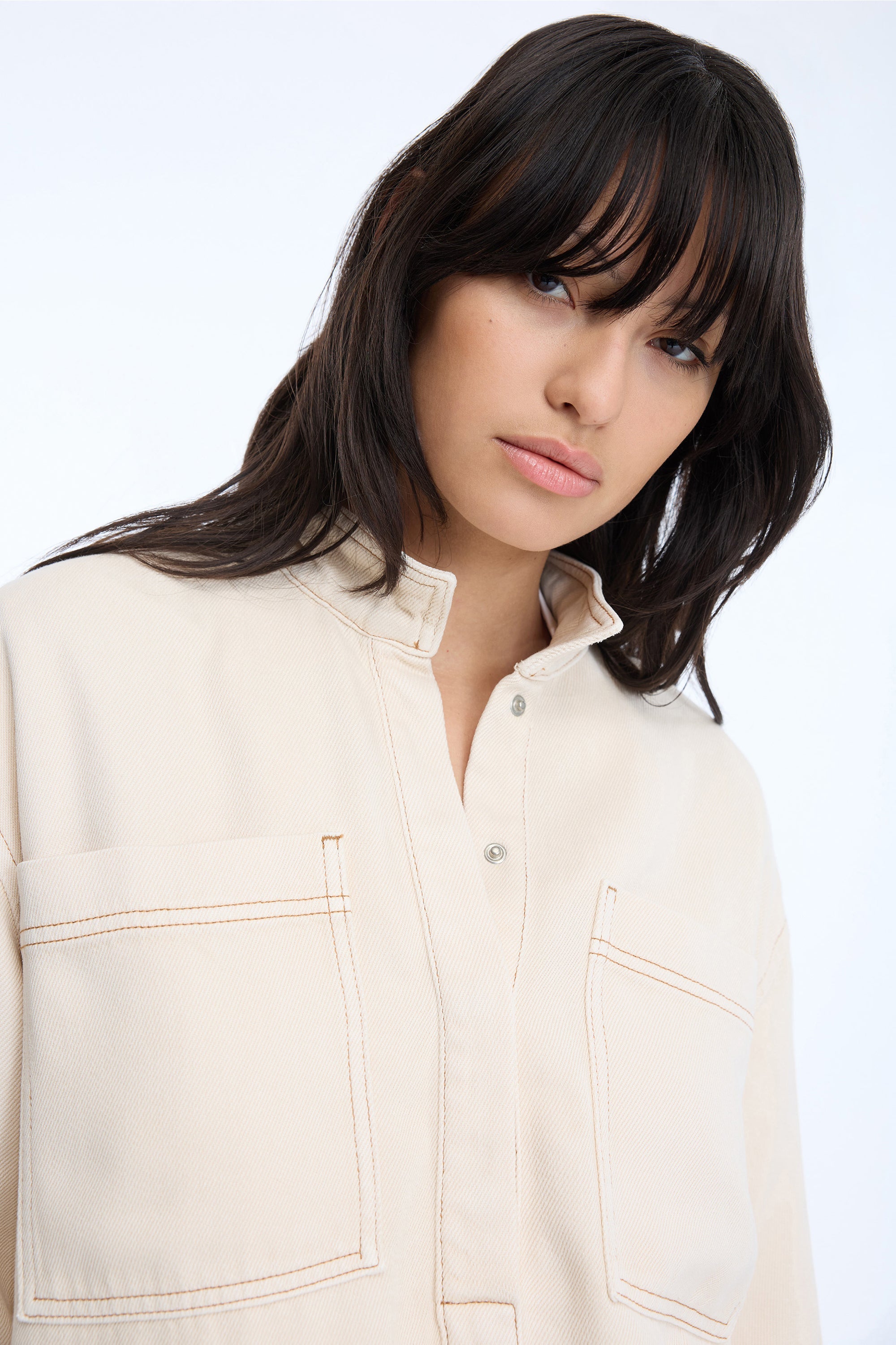 Ein Jeanshemd mit übergroßen Taschen auf der Brust, kann bis zur Hälfte geöffnet werden und hat einen eleganten kleinen Kragen. Das Hemd hat eine normale Passform.
