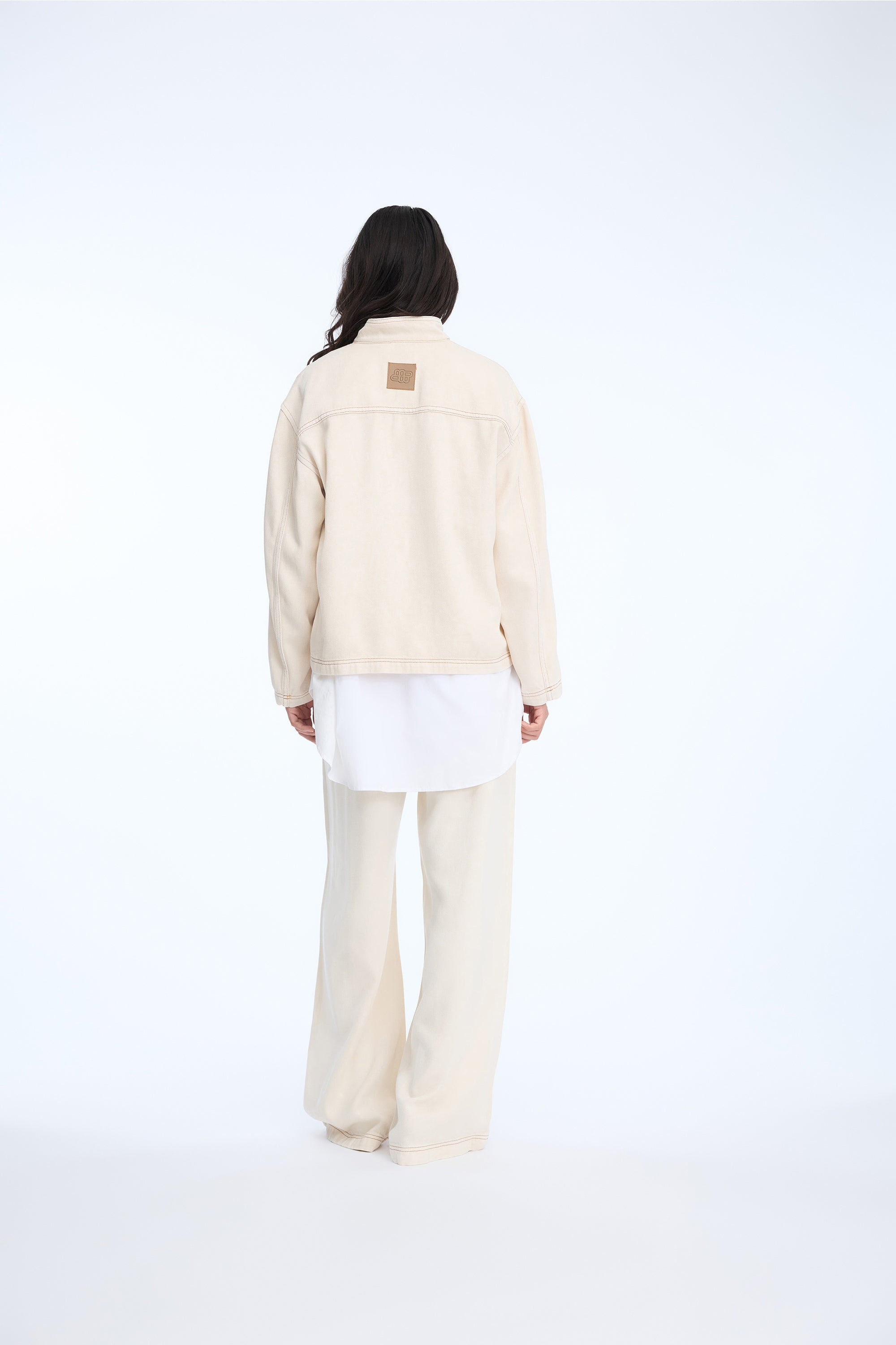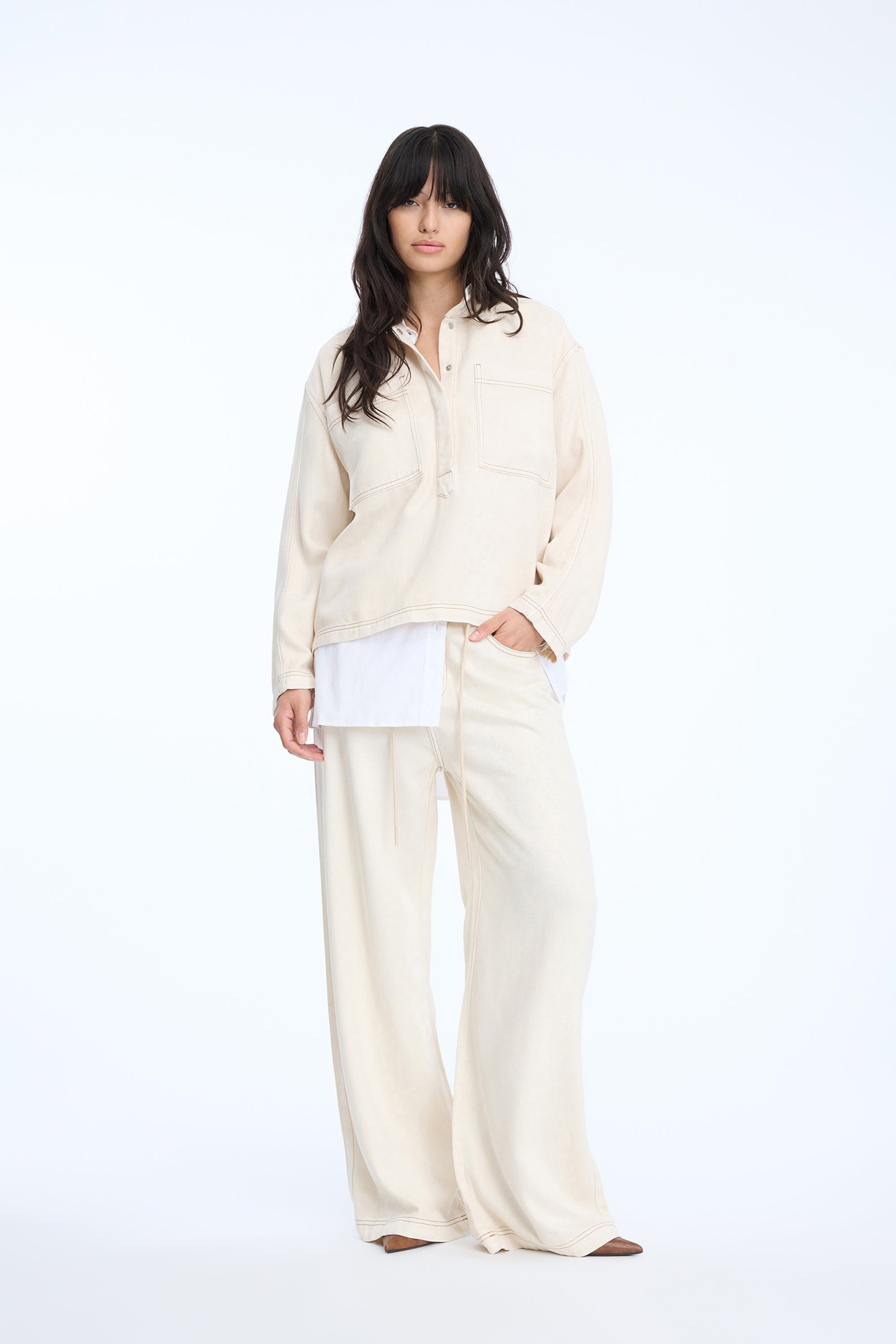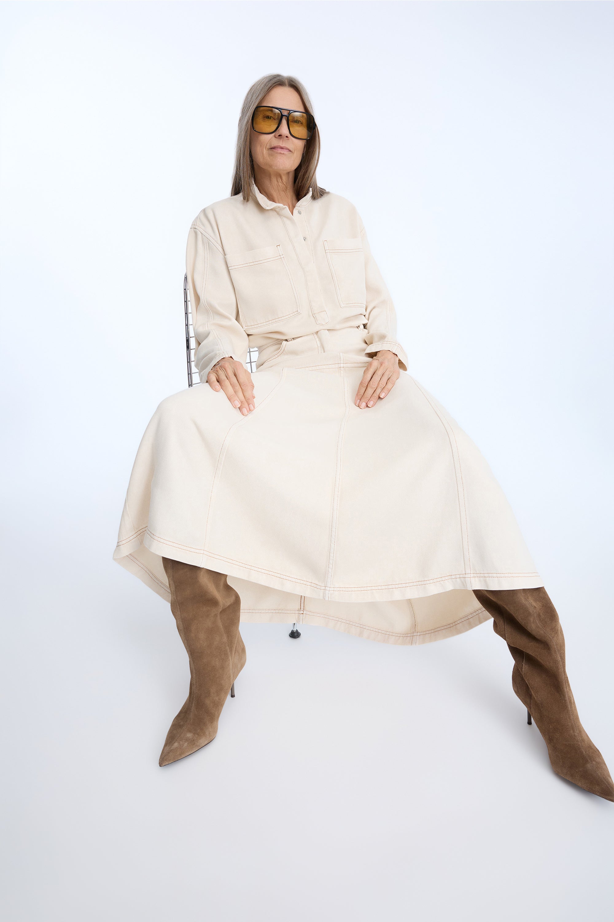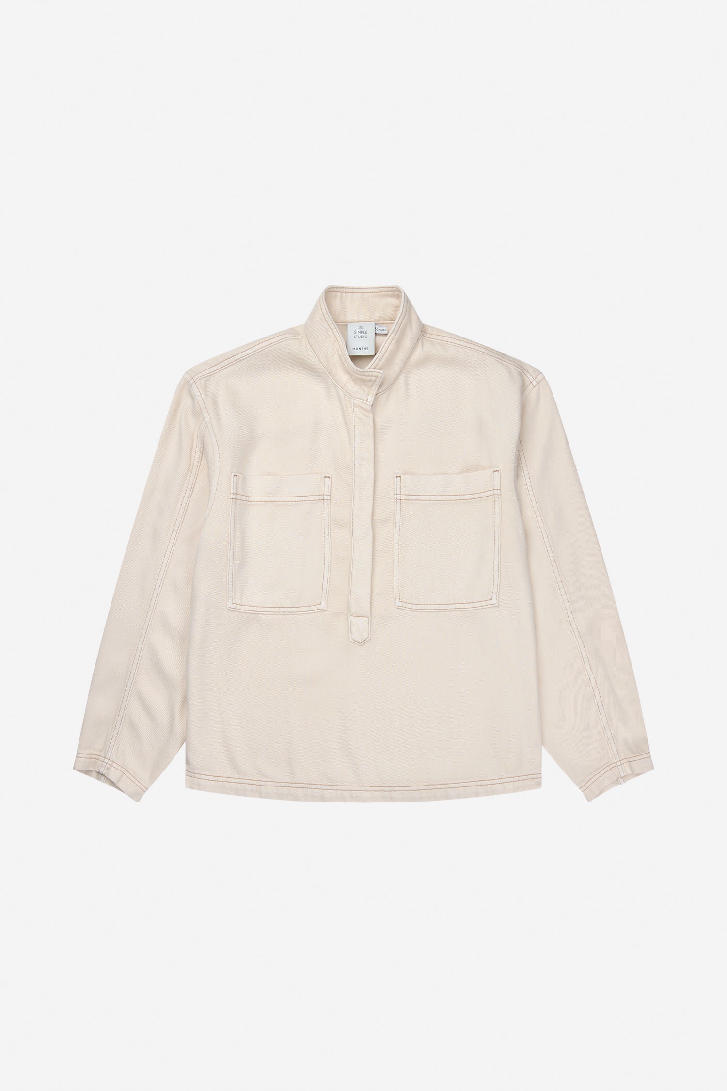Ein Jeanshemd mit übergroßen Taschen auf der Brust, kann bis zur Hälfte geöffnet werden und hat einen eleganten kleinen Kragen. Das Hemd hat eine normale Passform.